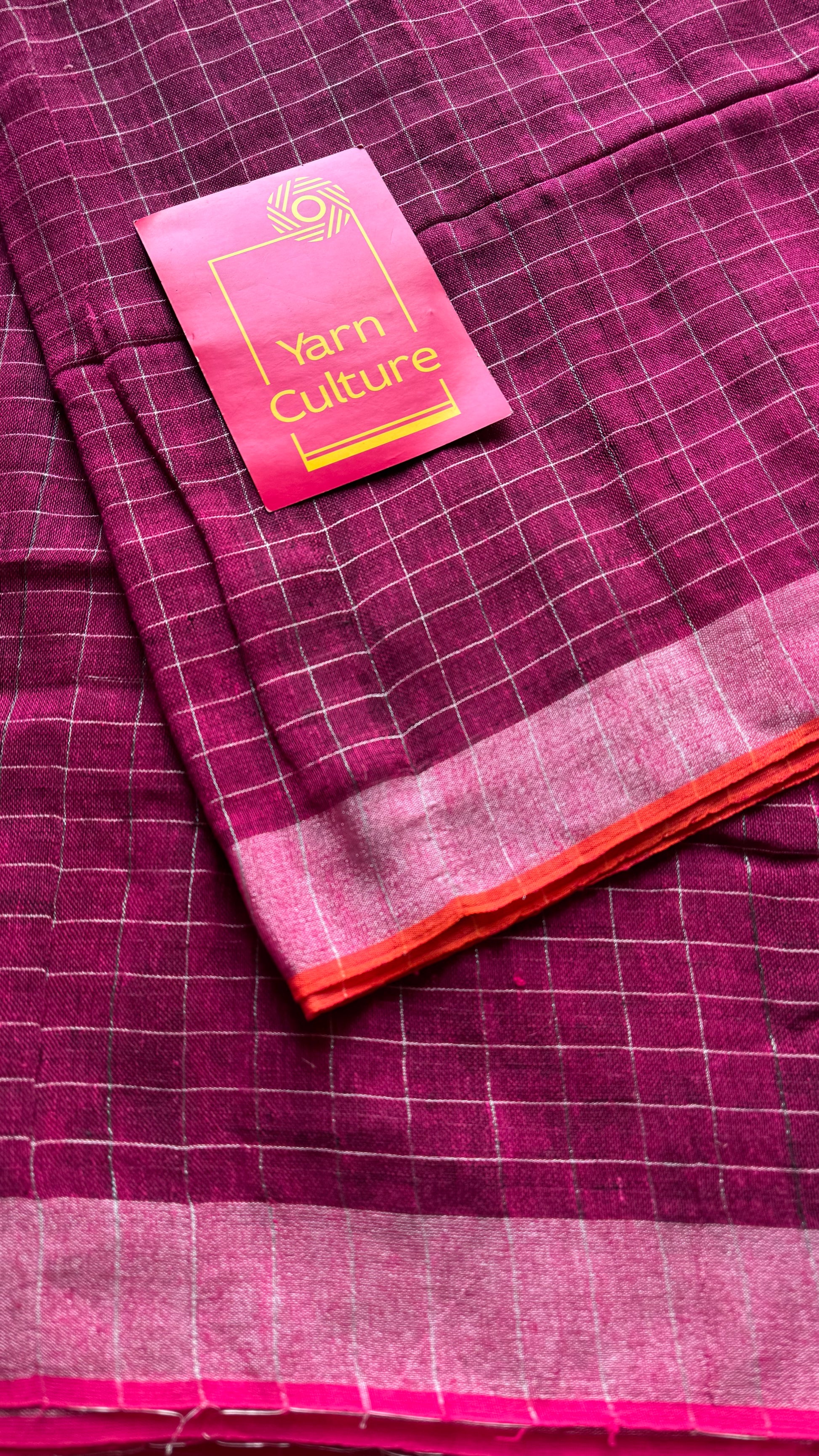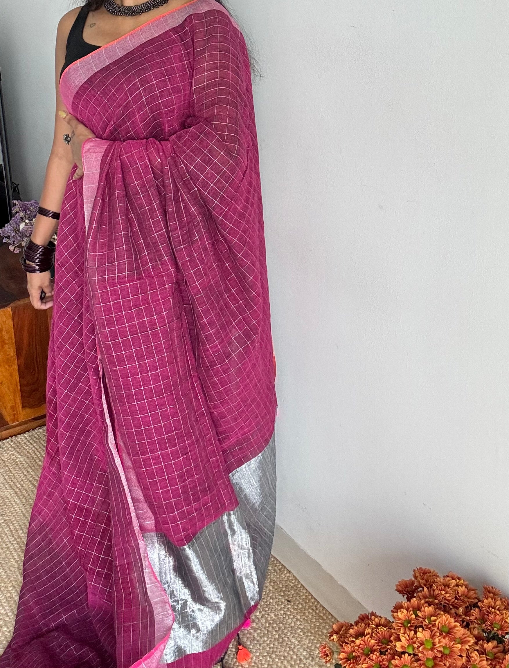 Ruby pink linen by cotton saree with subtle silver checks and a matching silver zari pallu. What makes it special is the dual border, one side in a thin orange and the other in pink, both beautifully highlighting the silver zari.