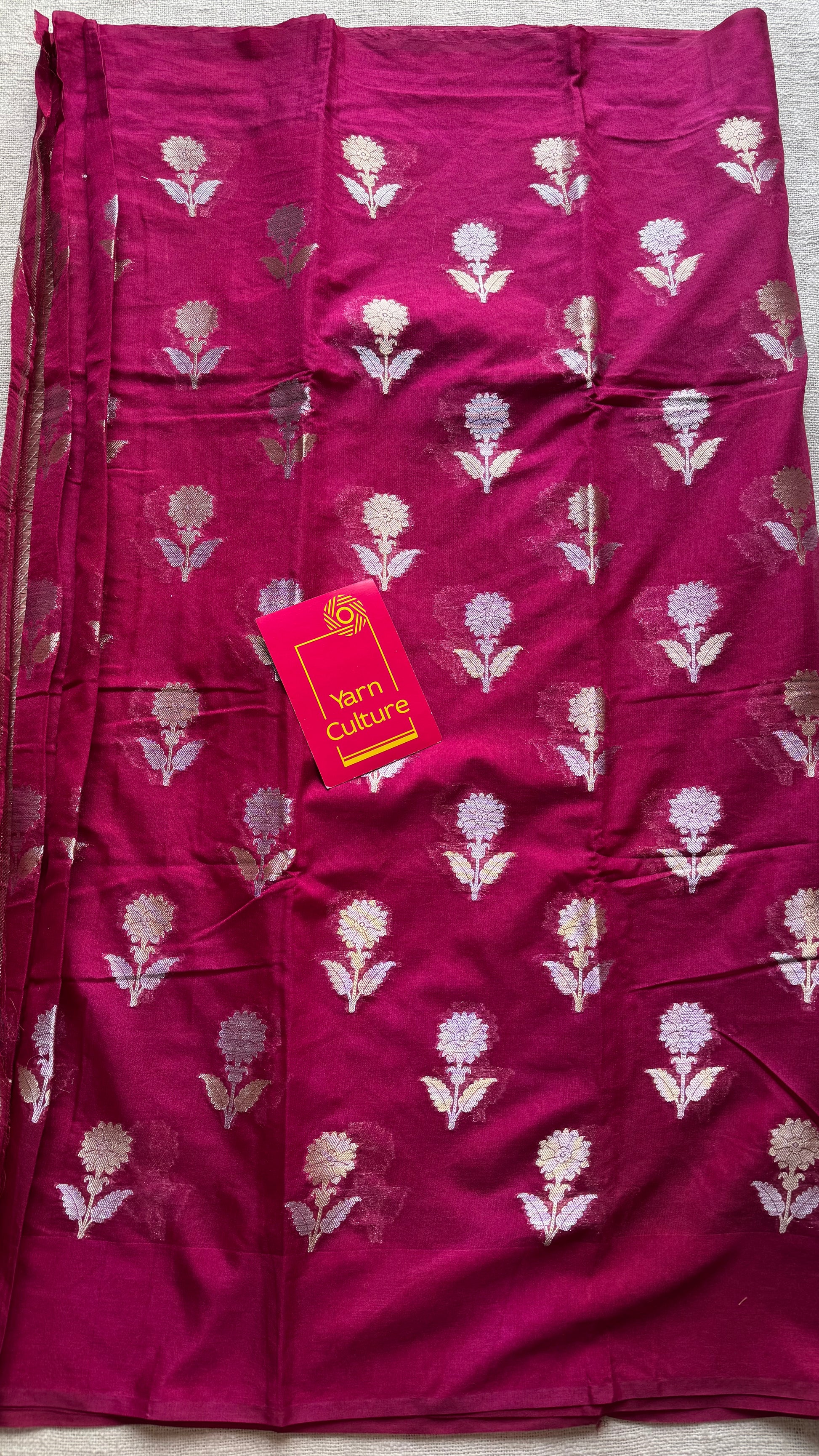 Ruby with gold and silver floral buttas, Banarasi semi-crepe silk - YCDESE52