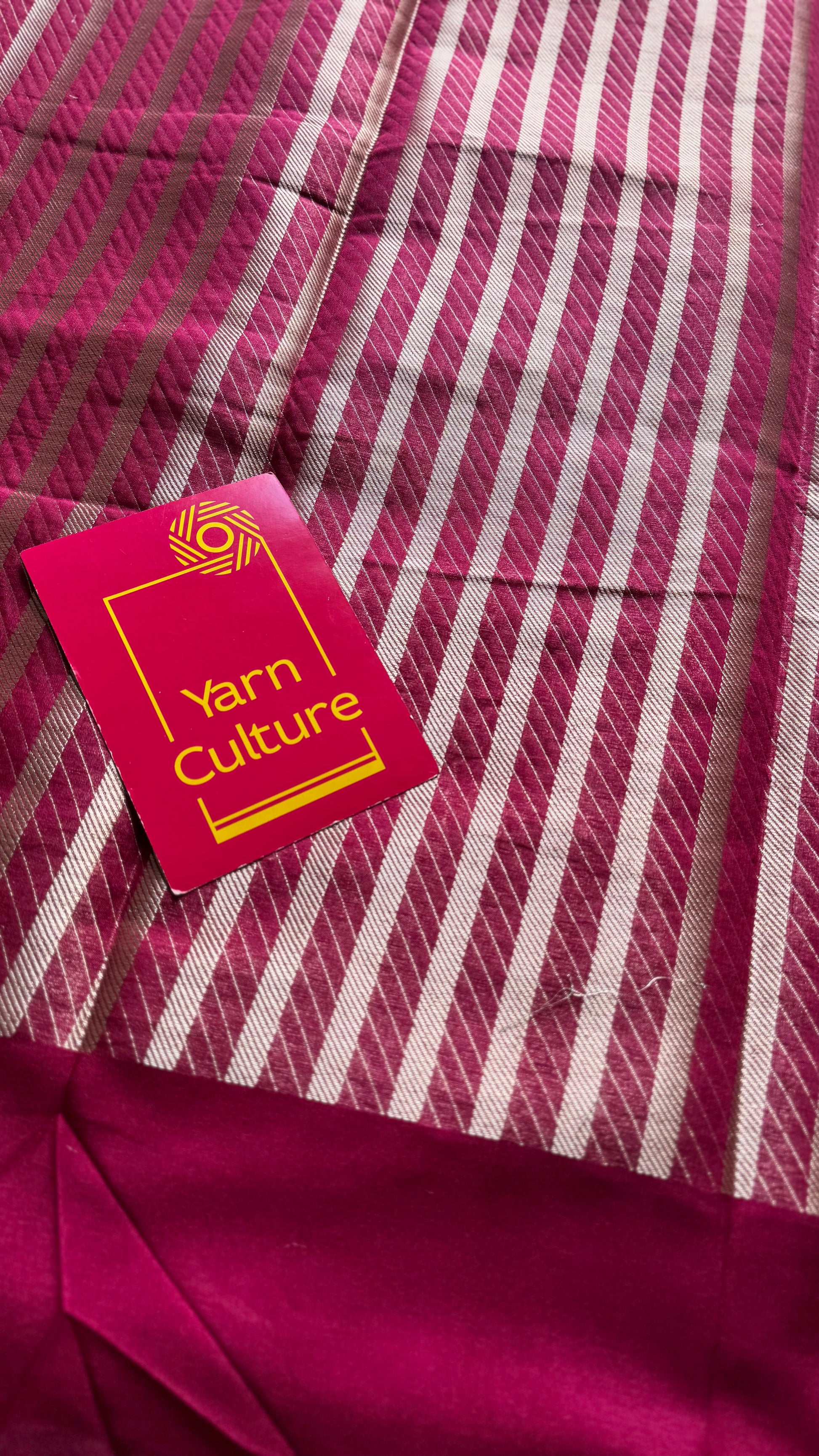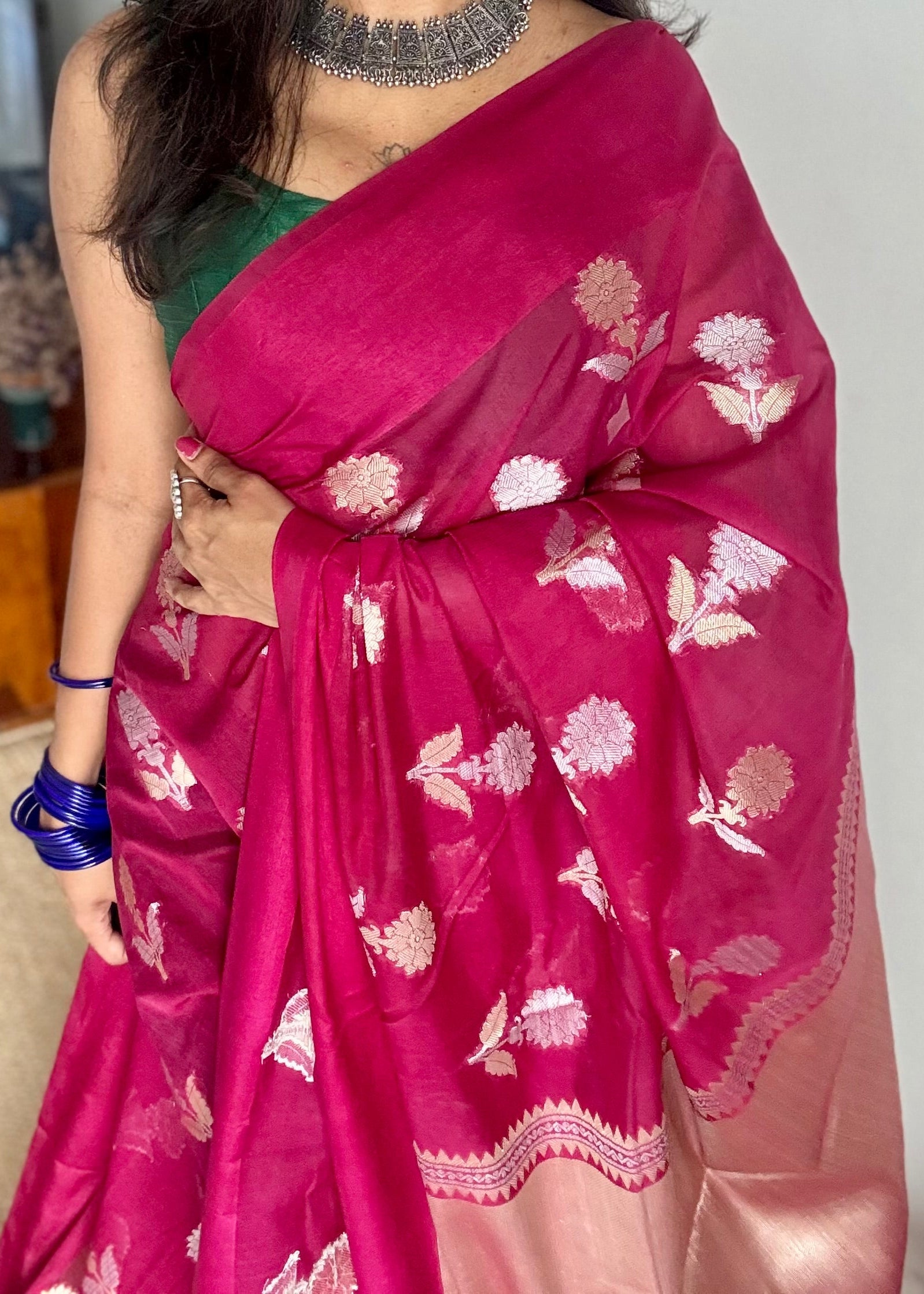 Ruby Banarasi semi-crepe silk with silver and gold floral buttas, plain satin border - festive, and perfect for Diwali or any occasion. Intricate pallu and blouse fabric. Effortless to drape, flowy, light to carry, and rich in look, this is a saree made to shine with you this season.