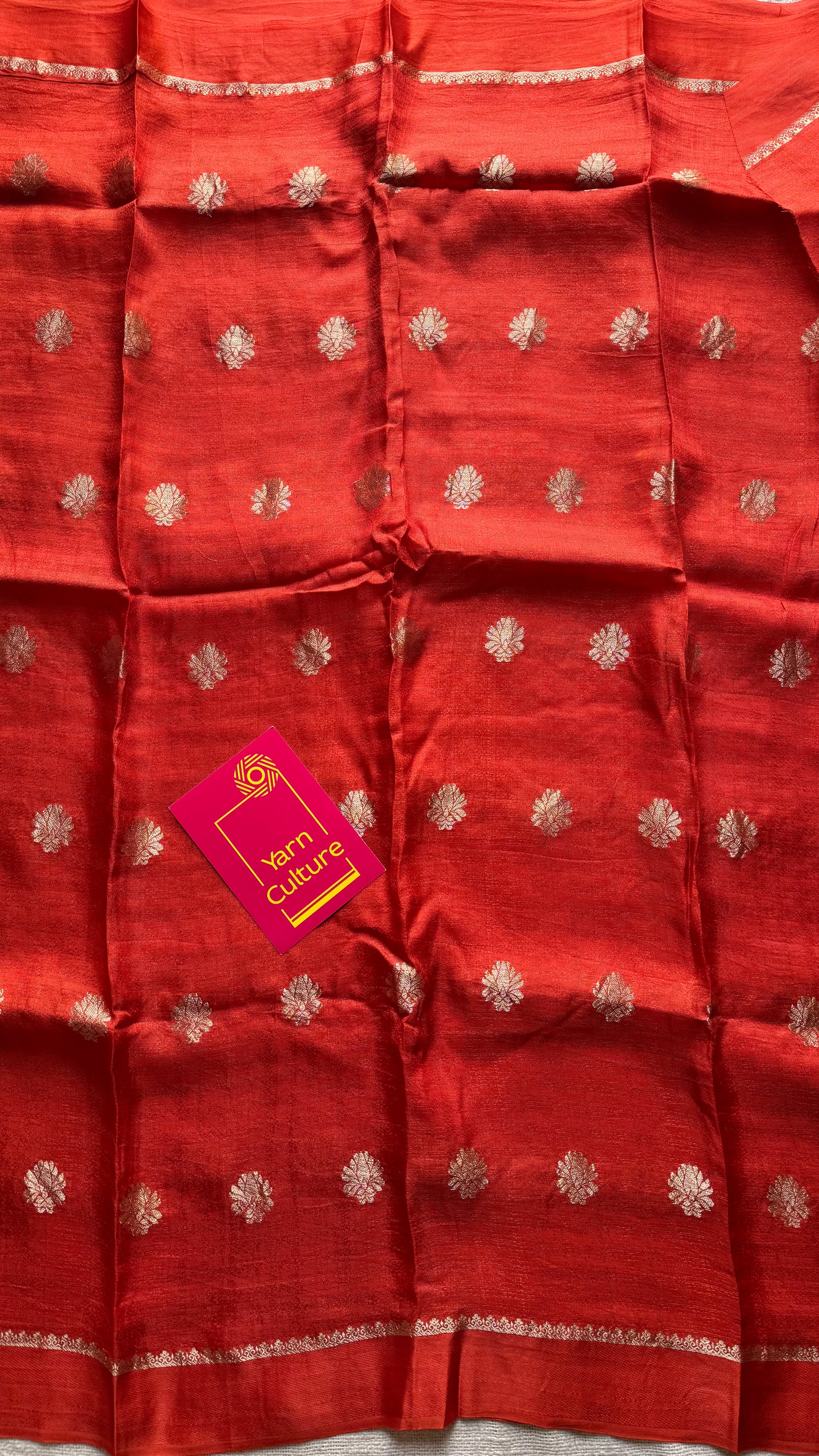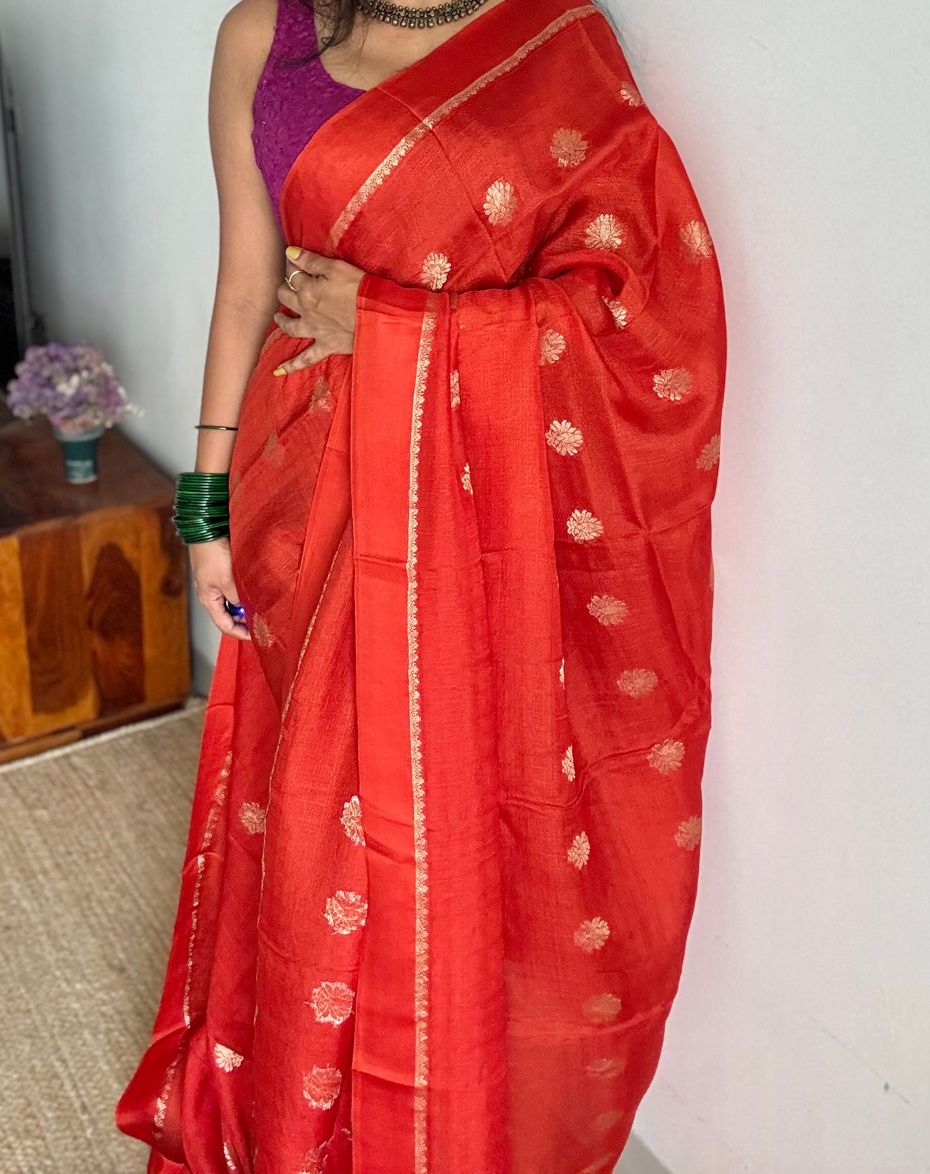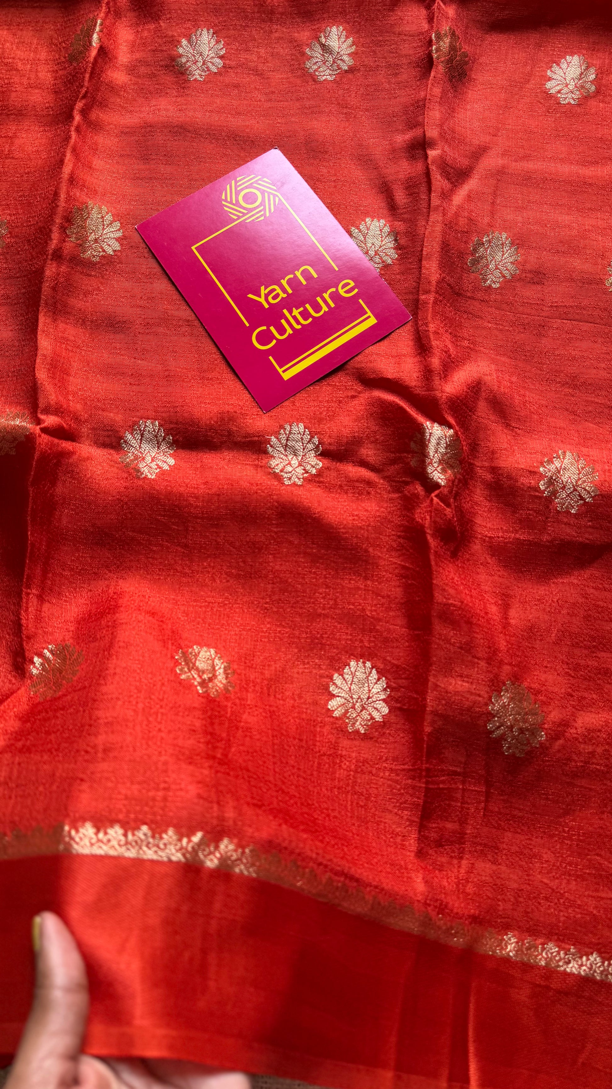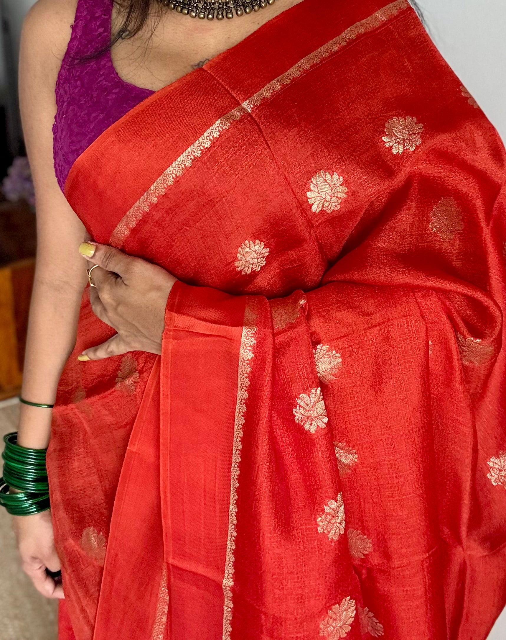 Rust orange in viscose soft silk with satin border, jacquard zari motifs in gold. Comes with a running blouse fabric of 0.8m.