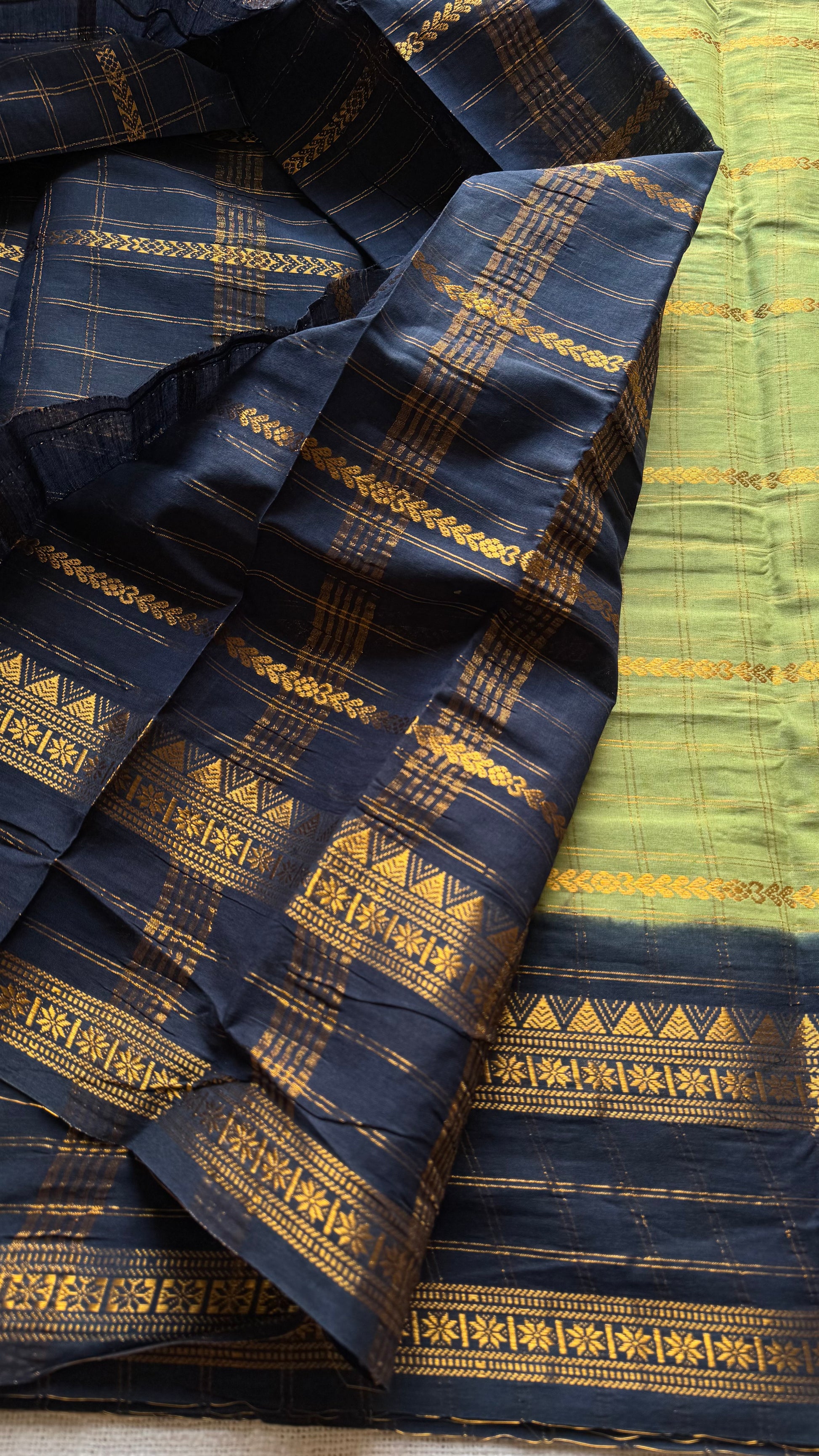 Pista green with black contrast, exclusive Adayar checks with velthaari pattern, madurai cotton with contrast blouse fabric 💖