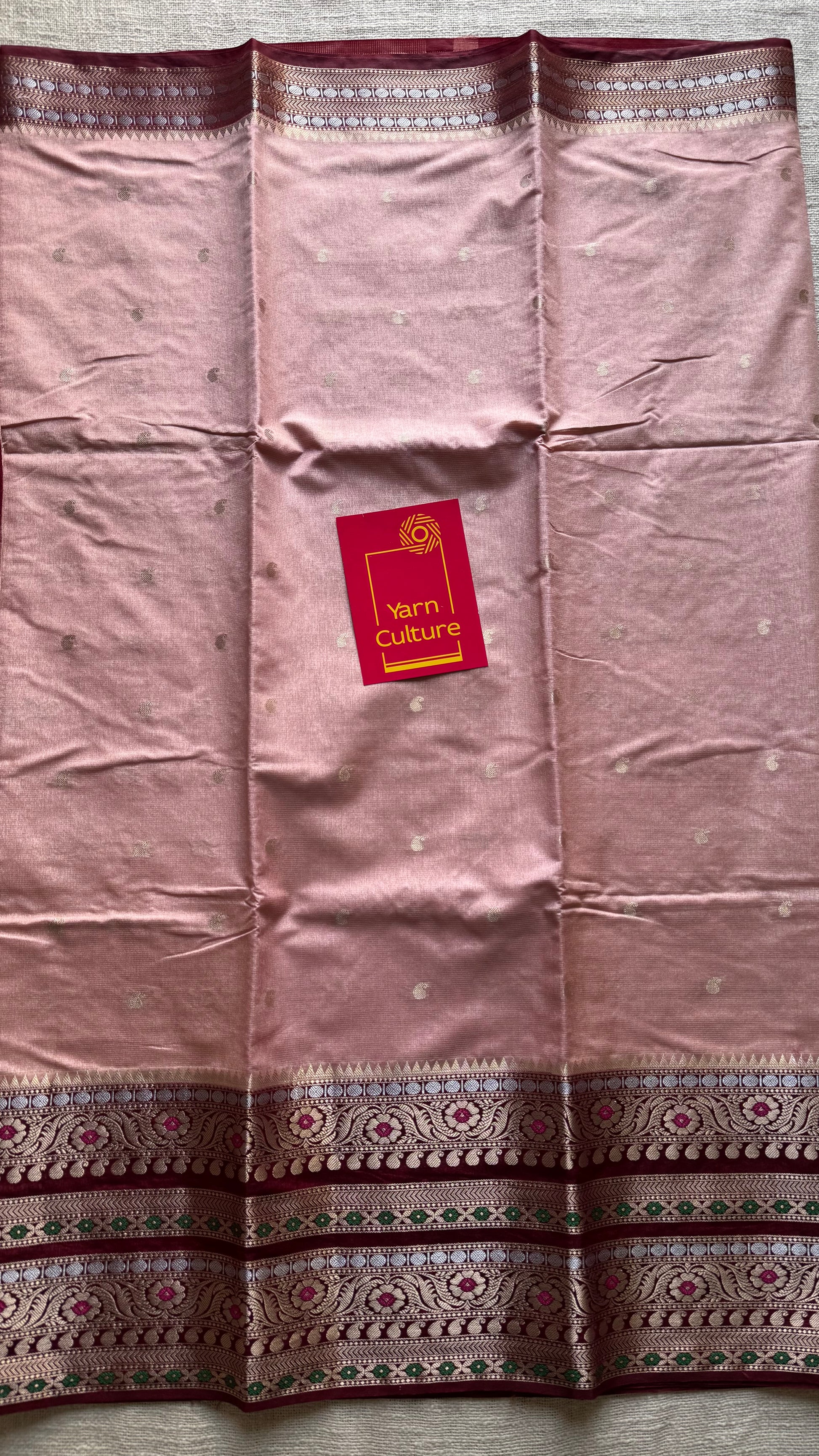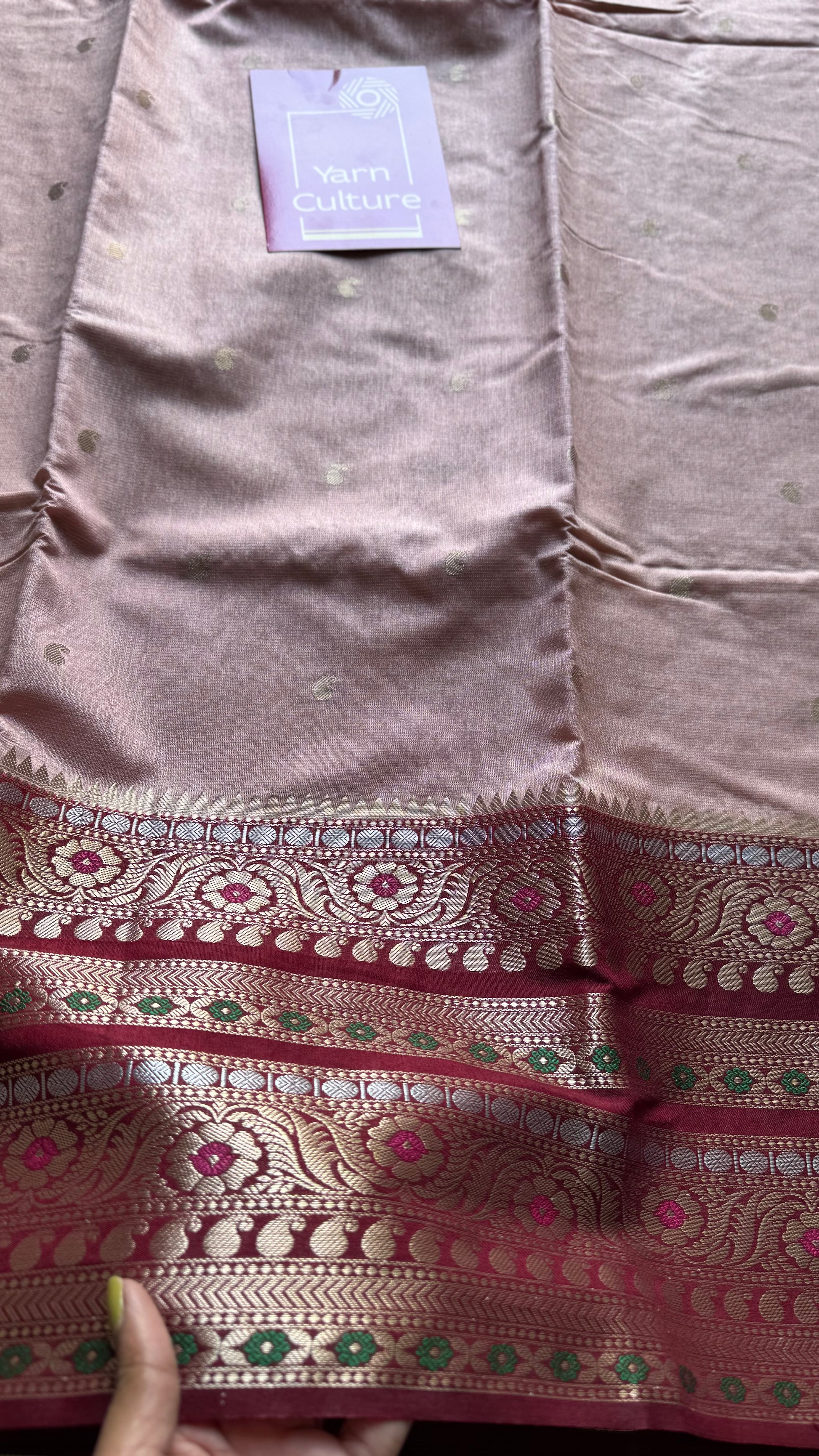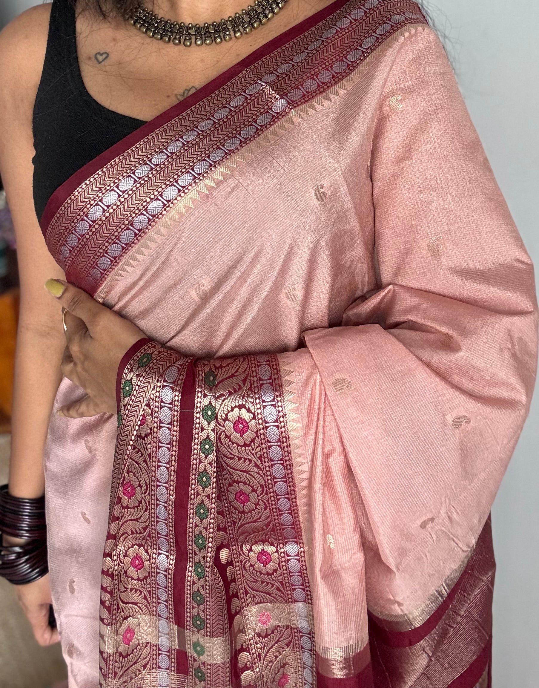 Vintage charm, light salmon peach pink with maroon floral border with gold and silver zari, banarasi semi silk, intricate pallu and blouse. Effortless to drape, light to carry, and rich in look, this is a saree made to shine with you this season.