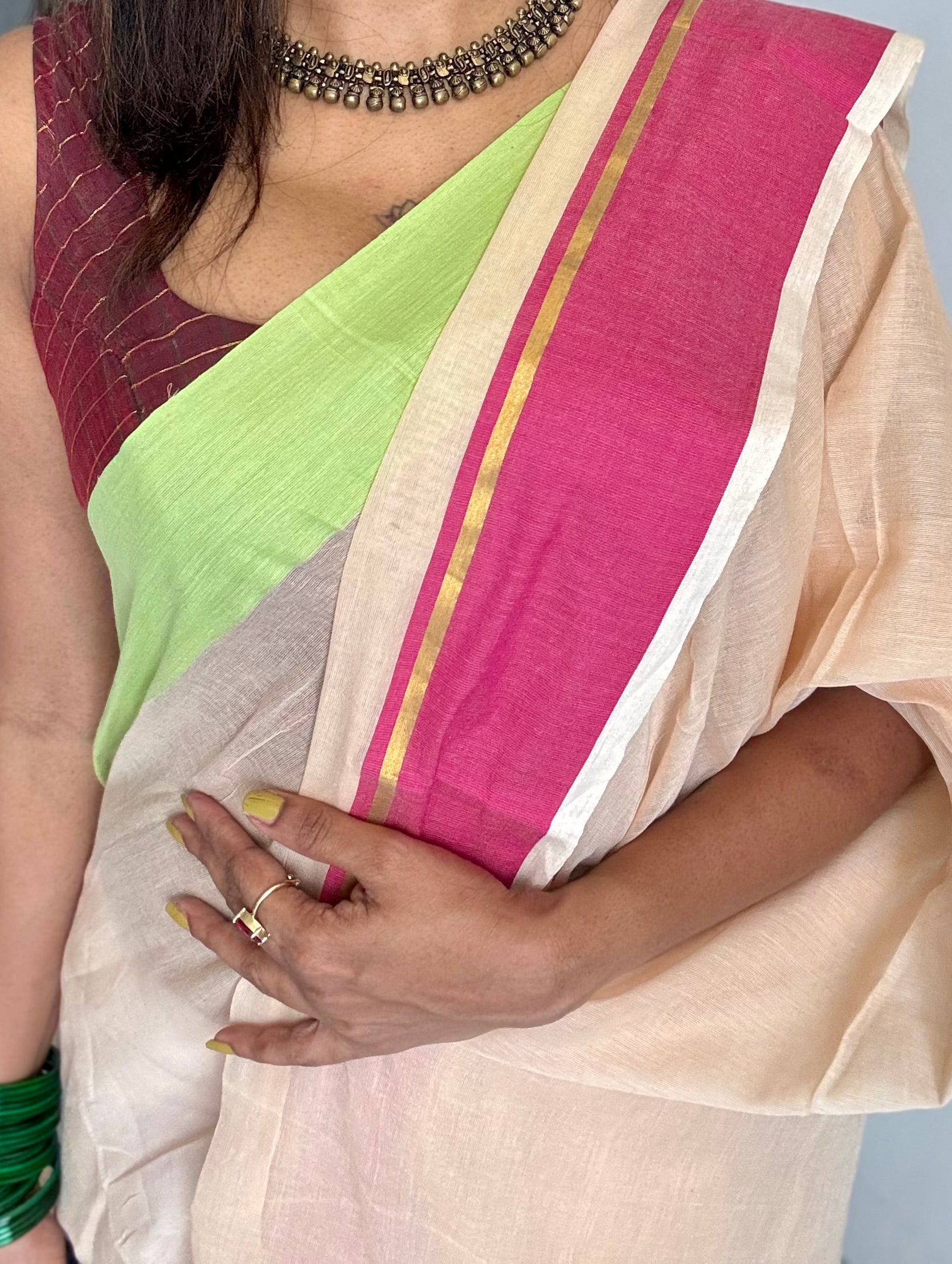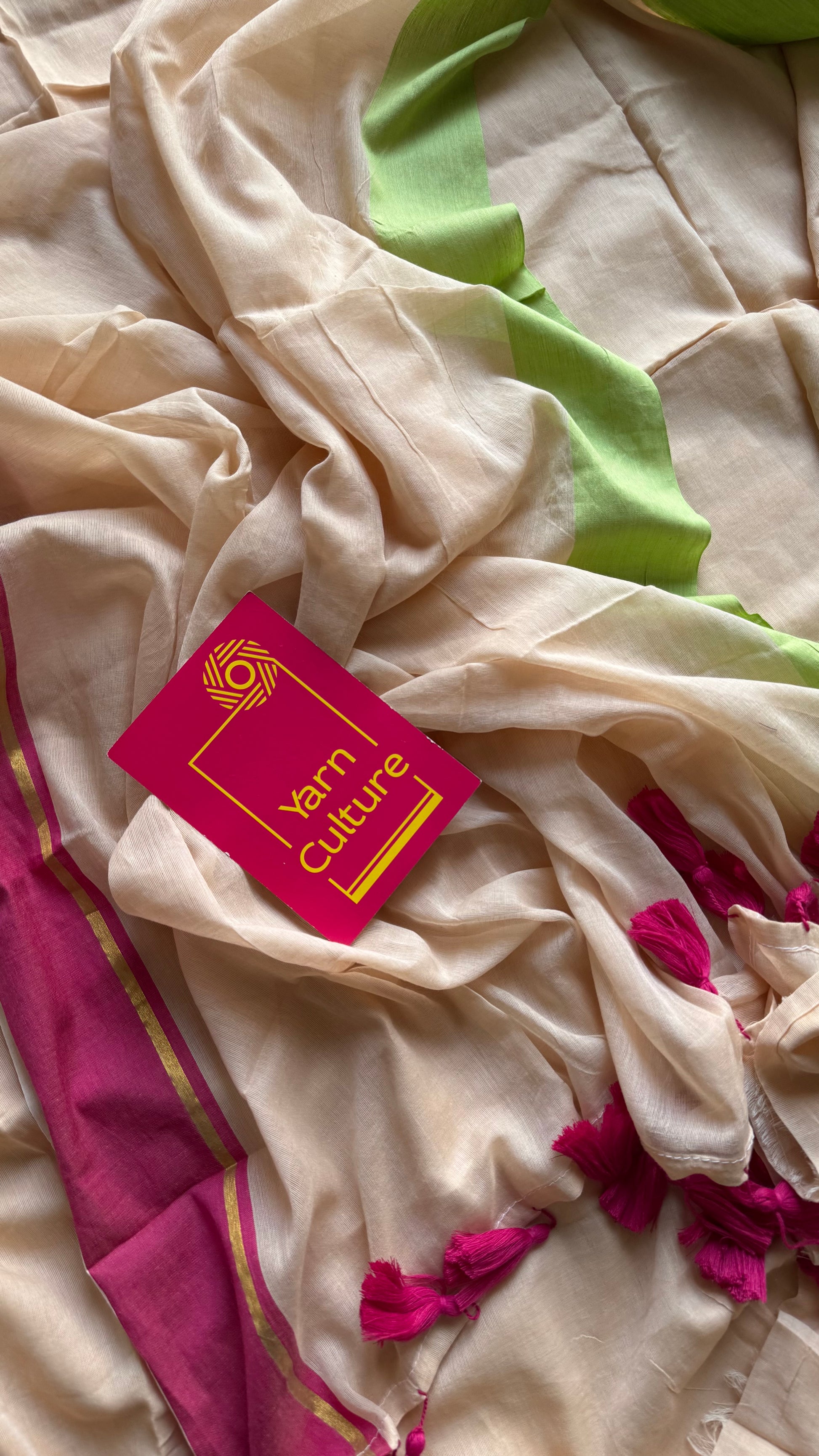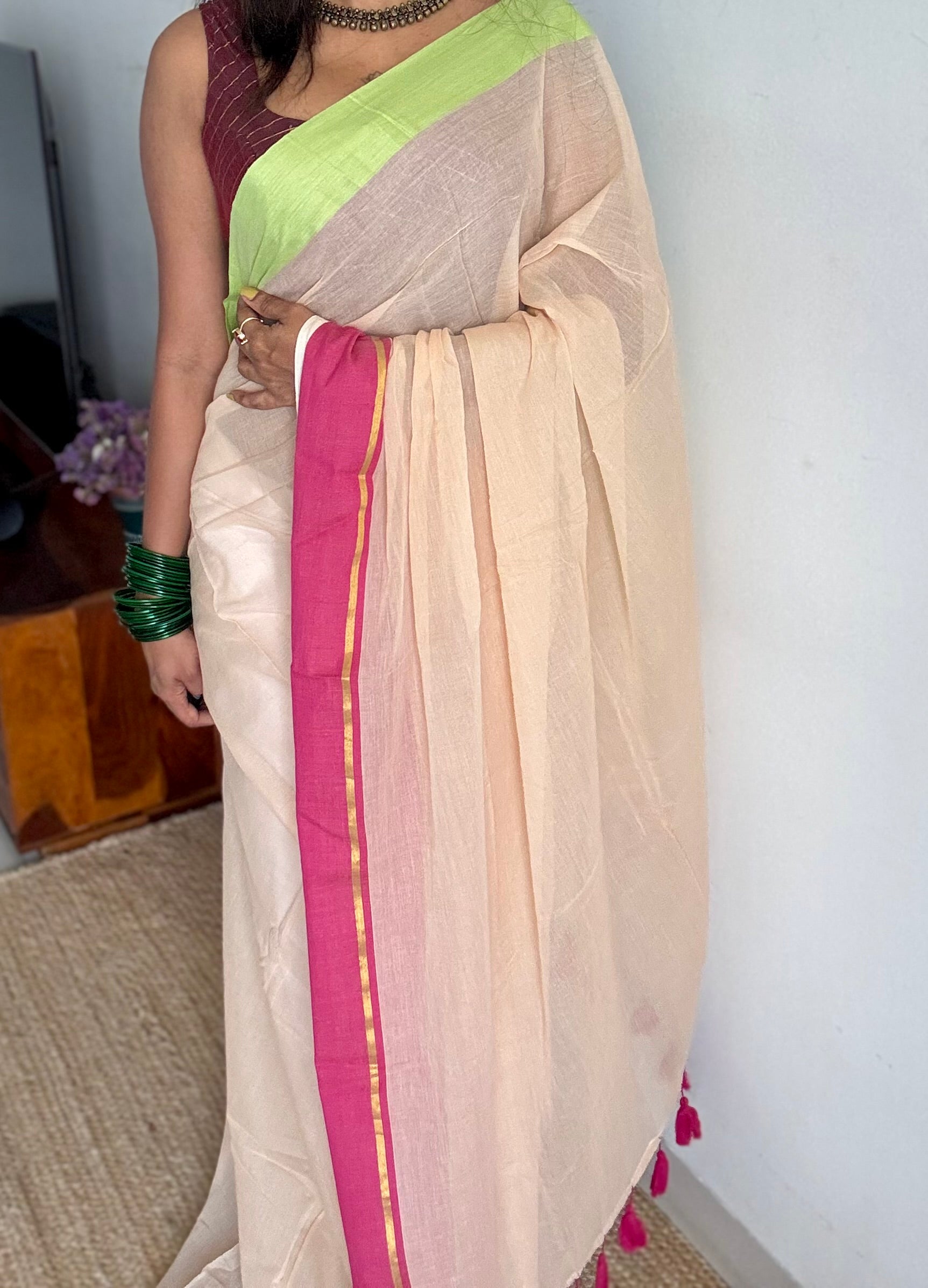 Sandal toned mul saree with pink and pista green borders, soft, easy to drape.Ā