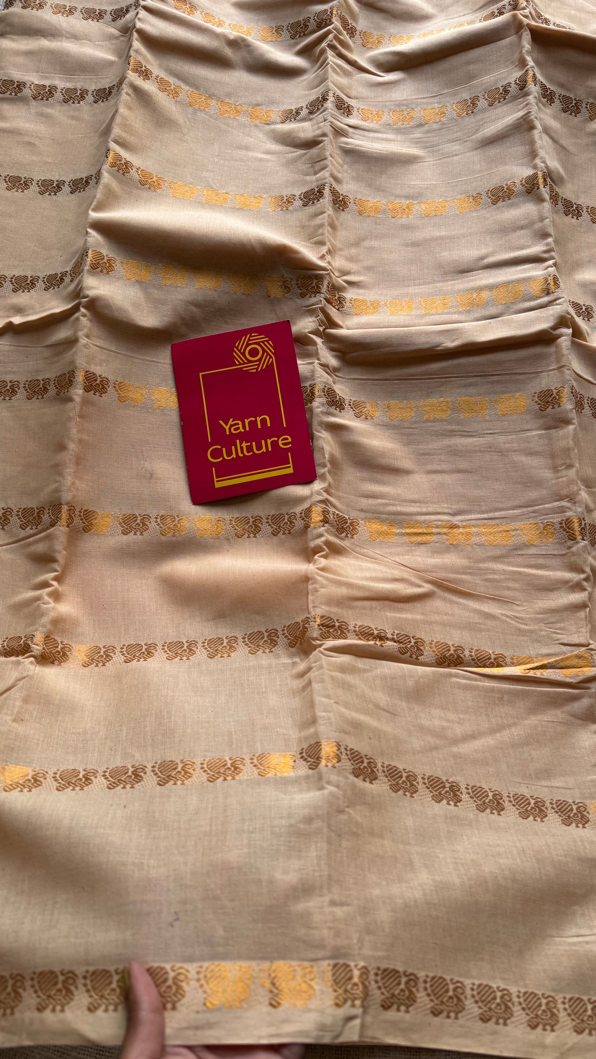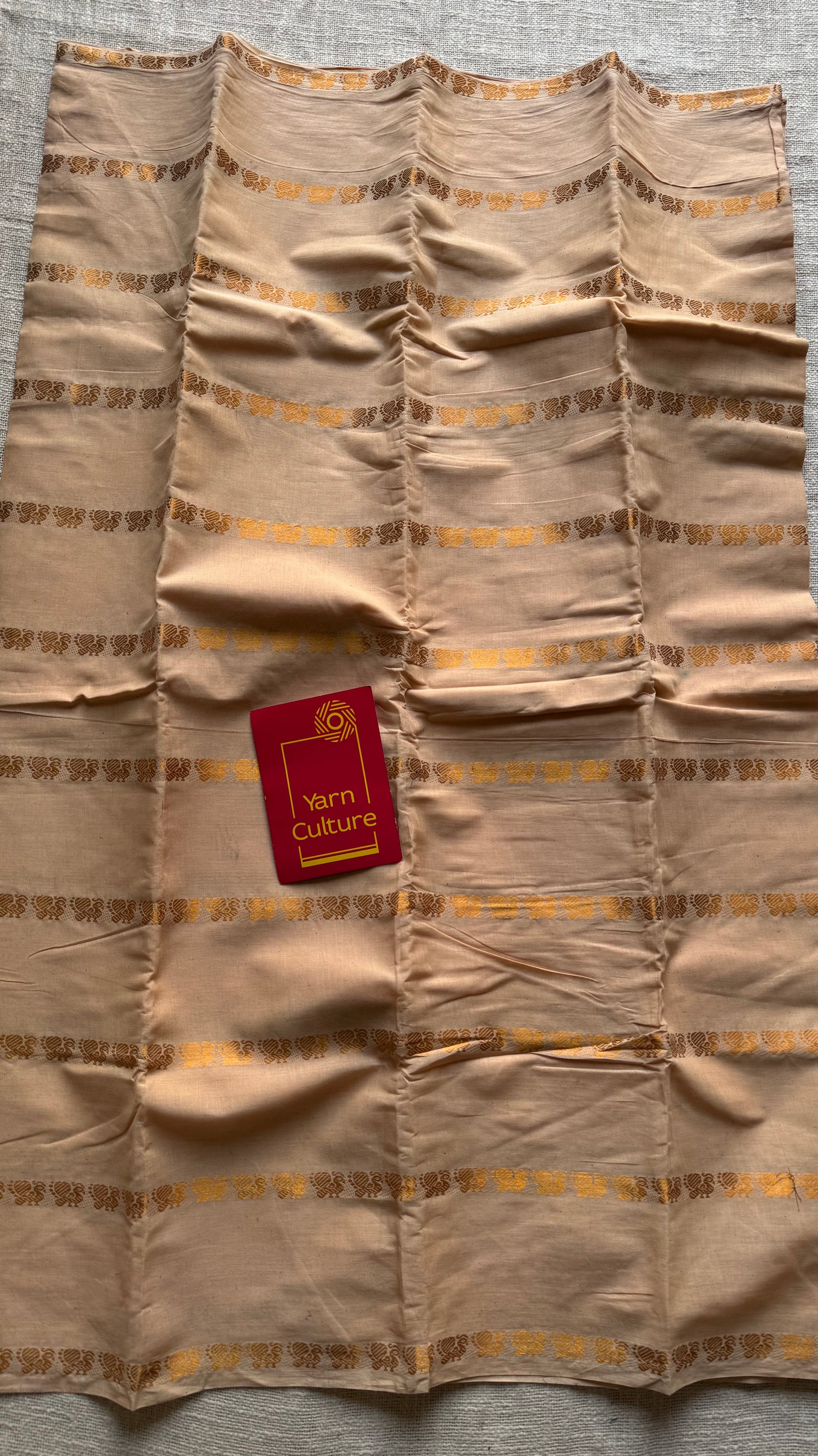 Sandal shade with multi peacock motif lines, kattuchayam dyed sungudi cotton. Comes with running blouse.