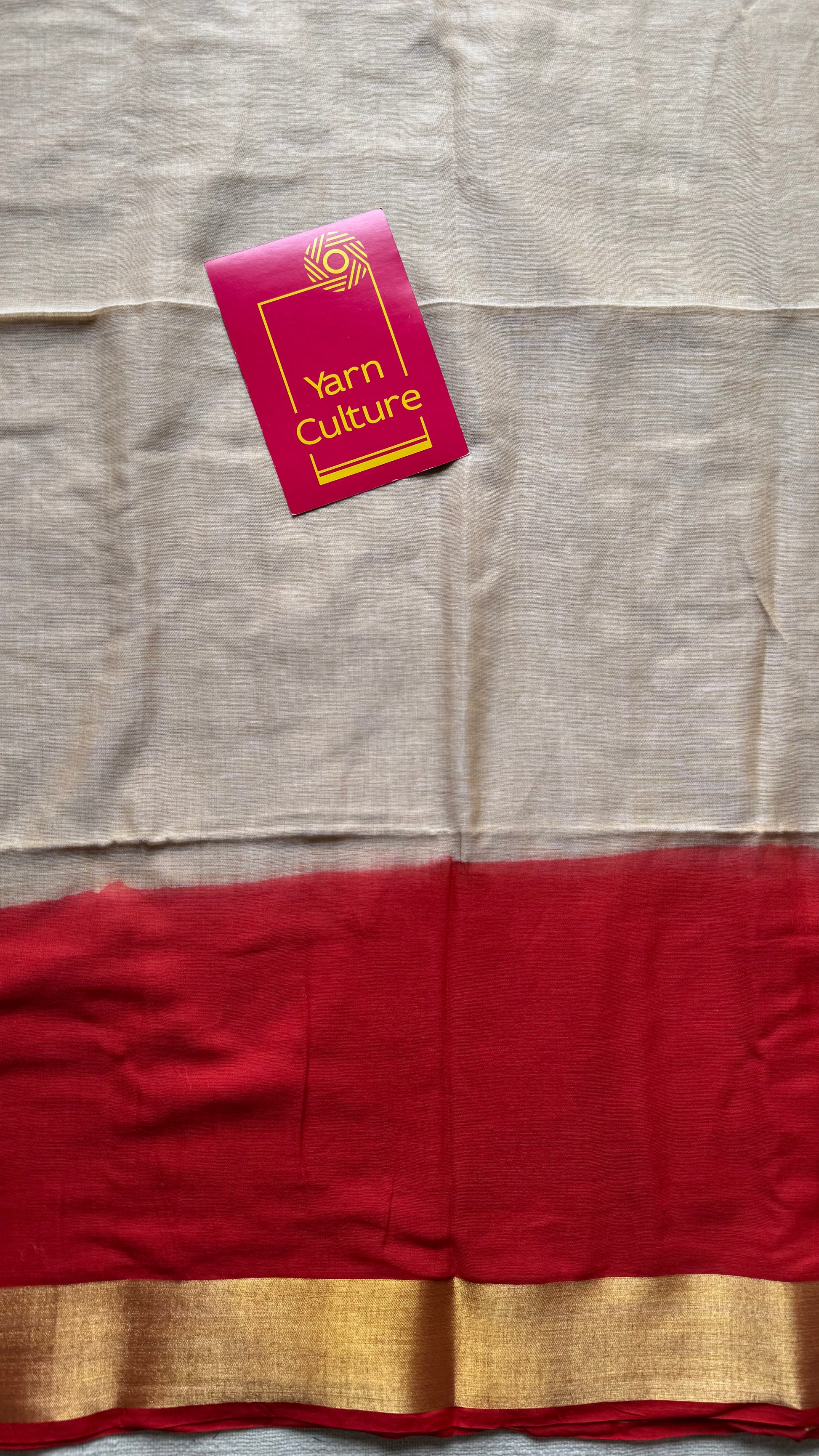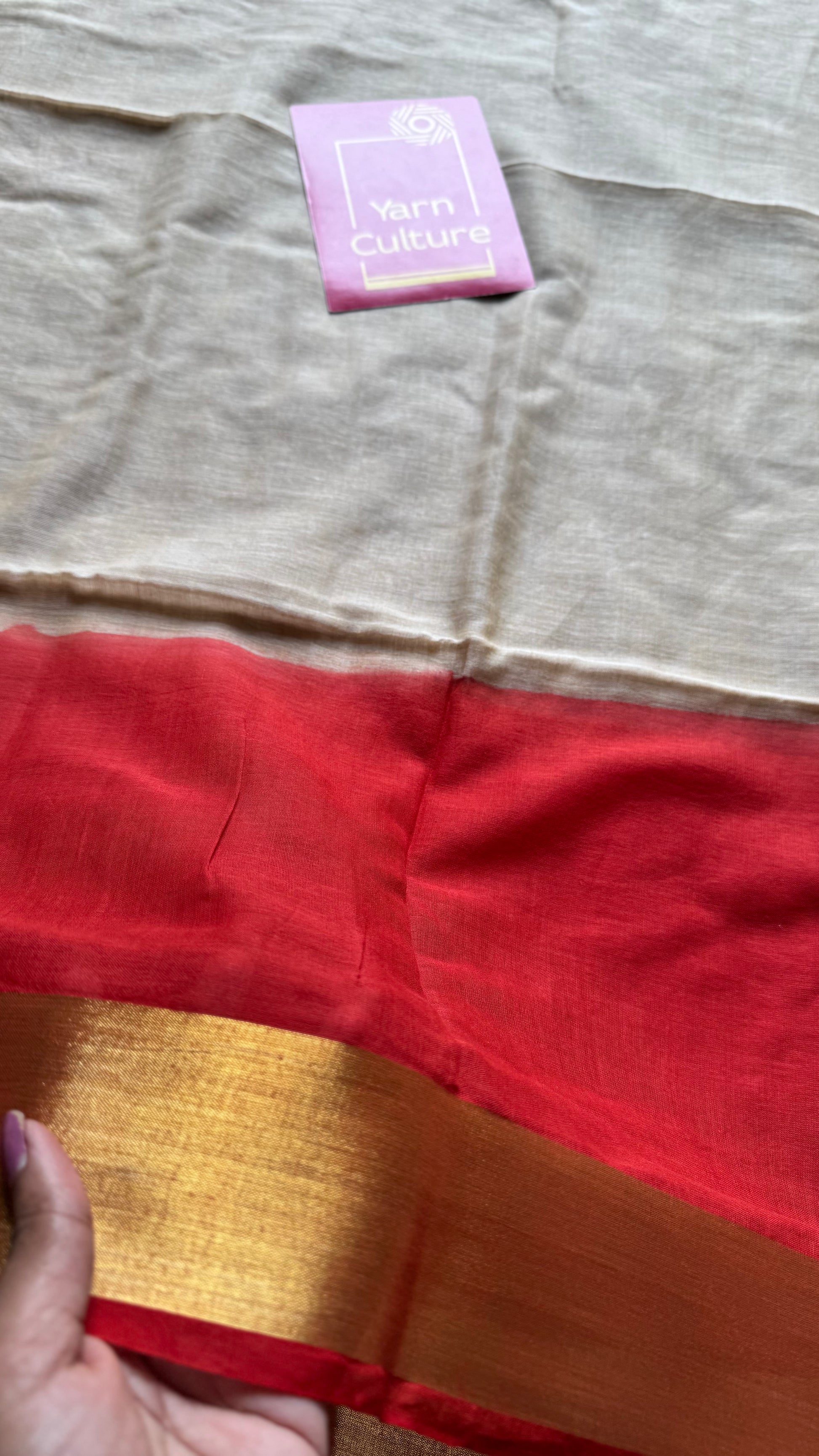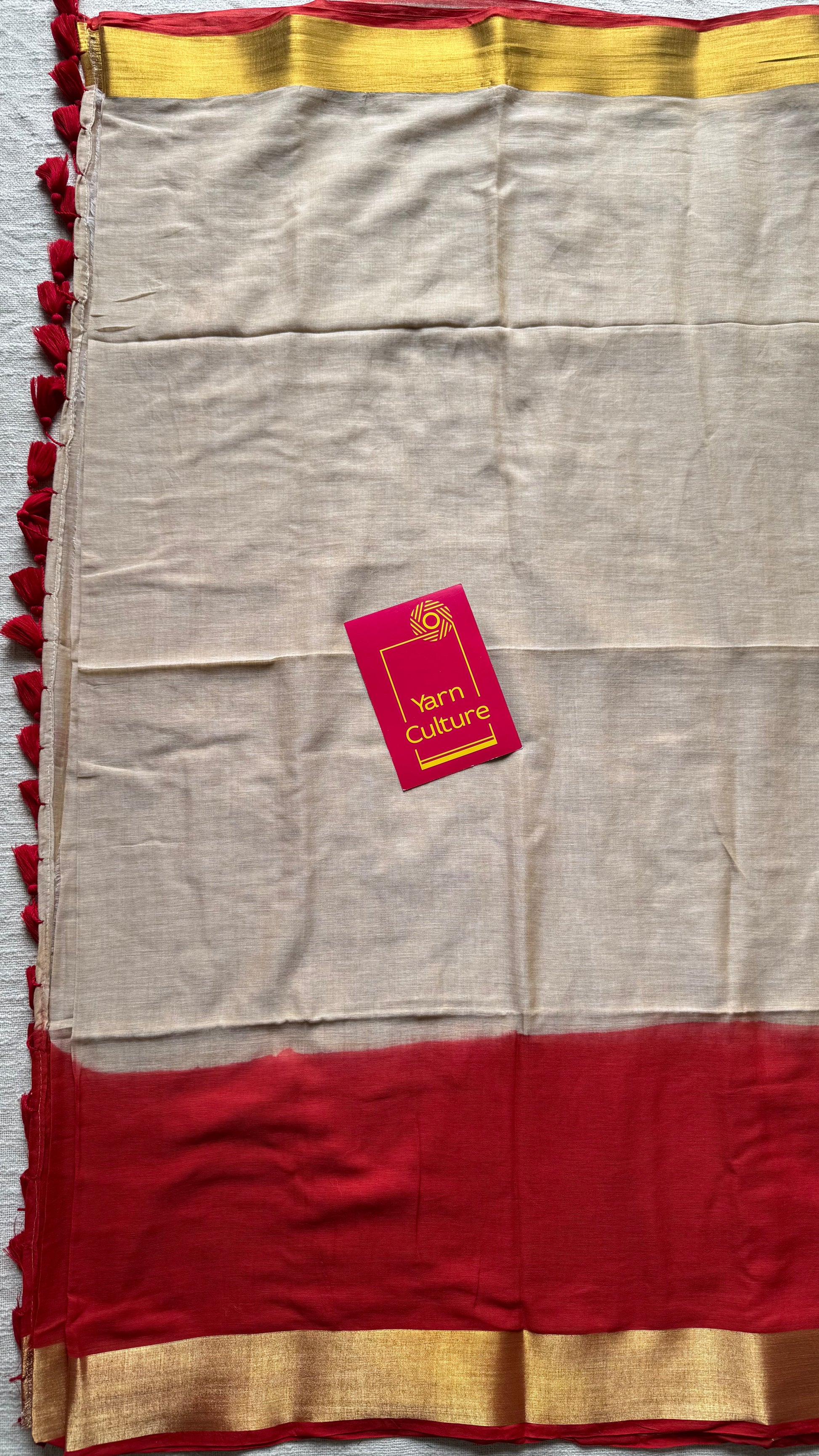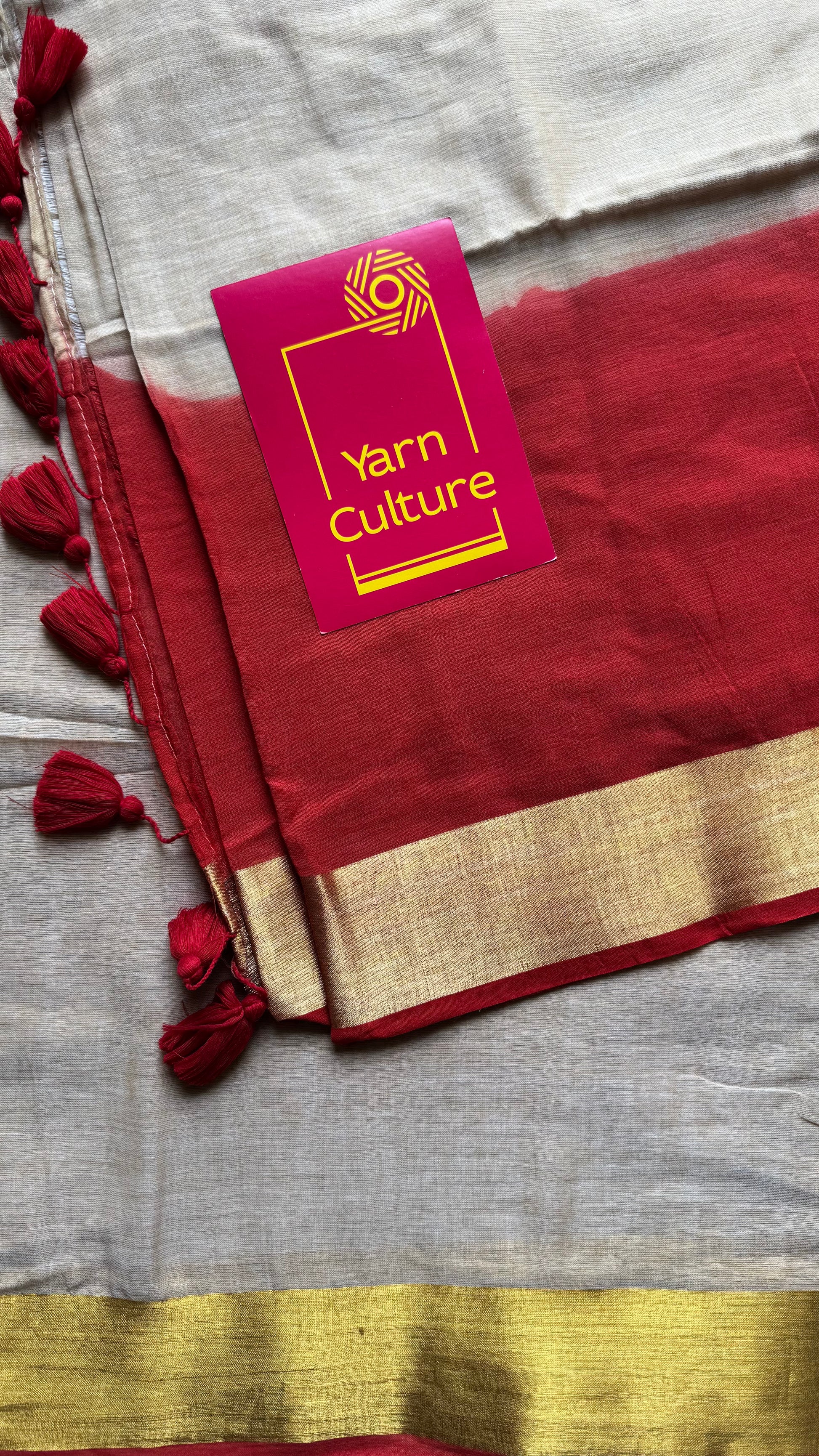 Everybody's favourite mul cotton in a dyed red and gold zari border, sandal coloured body, soft & easy to drape.