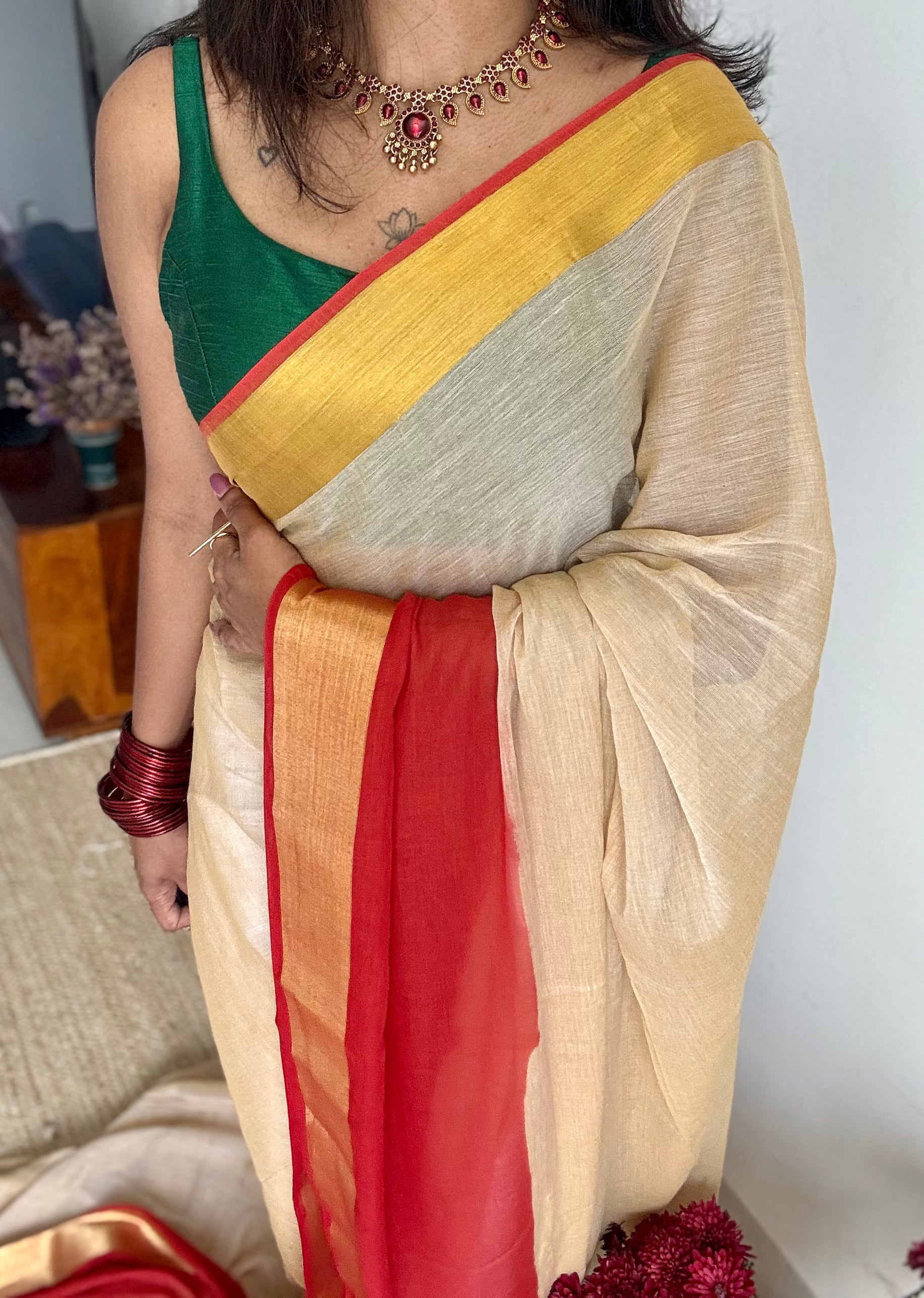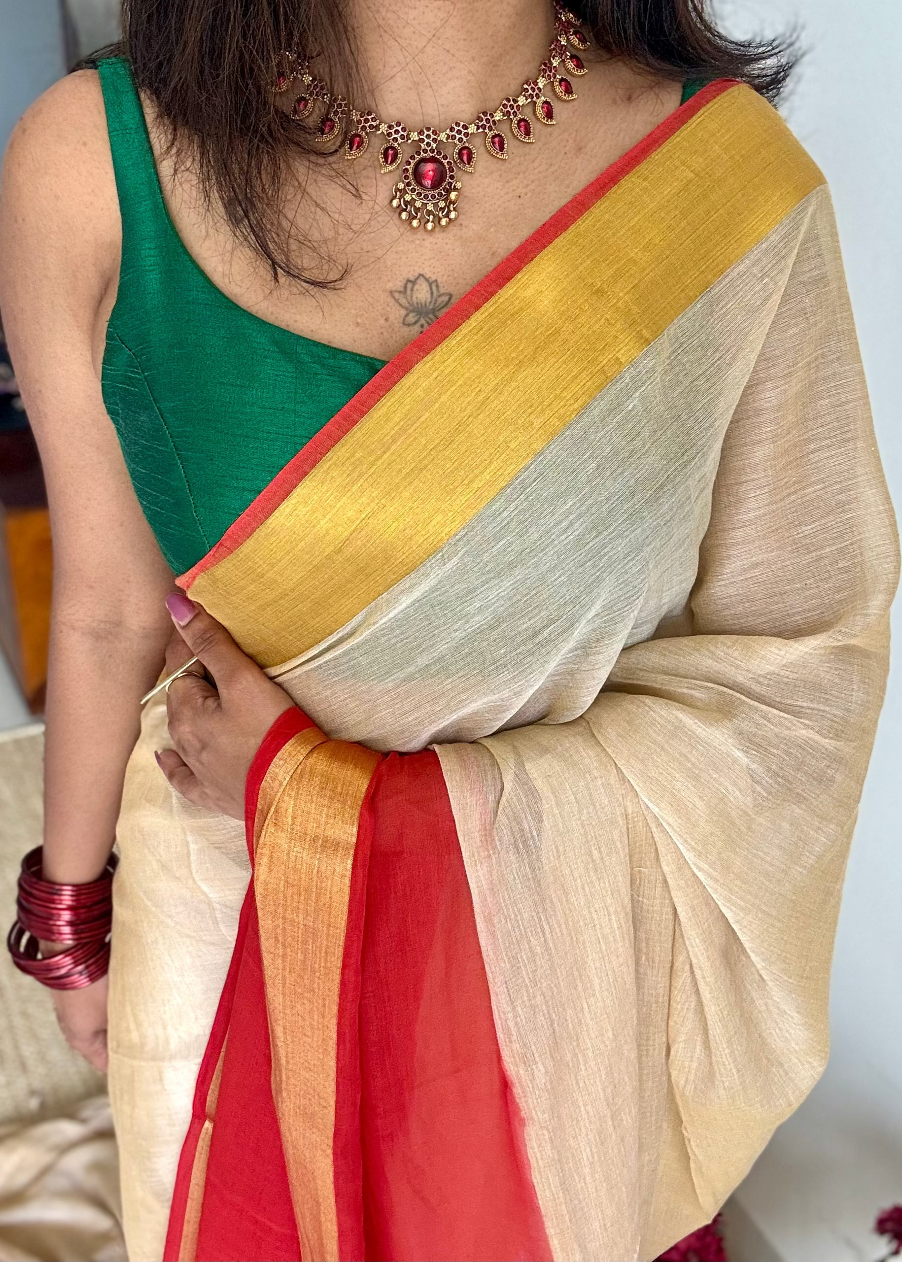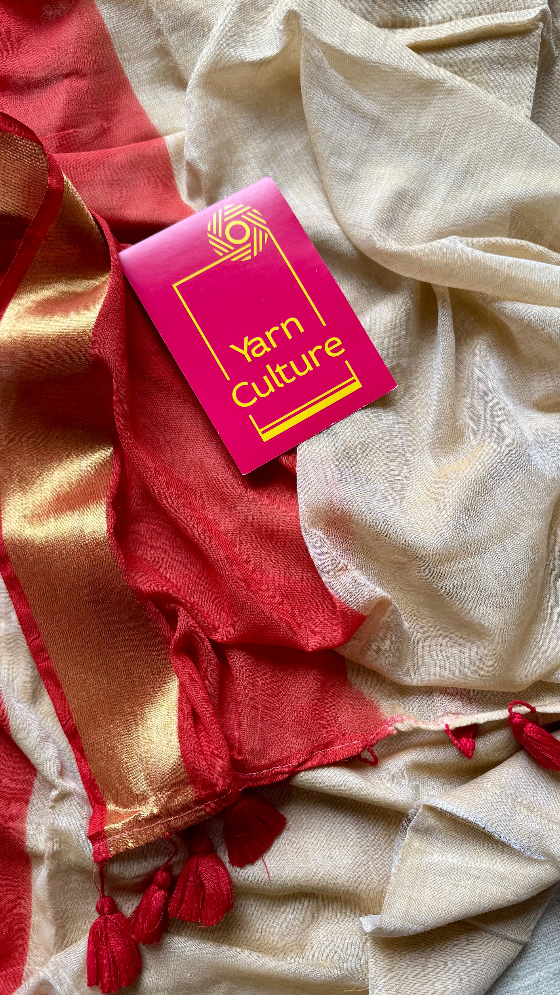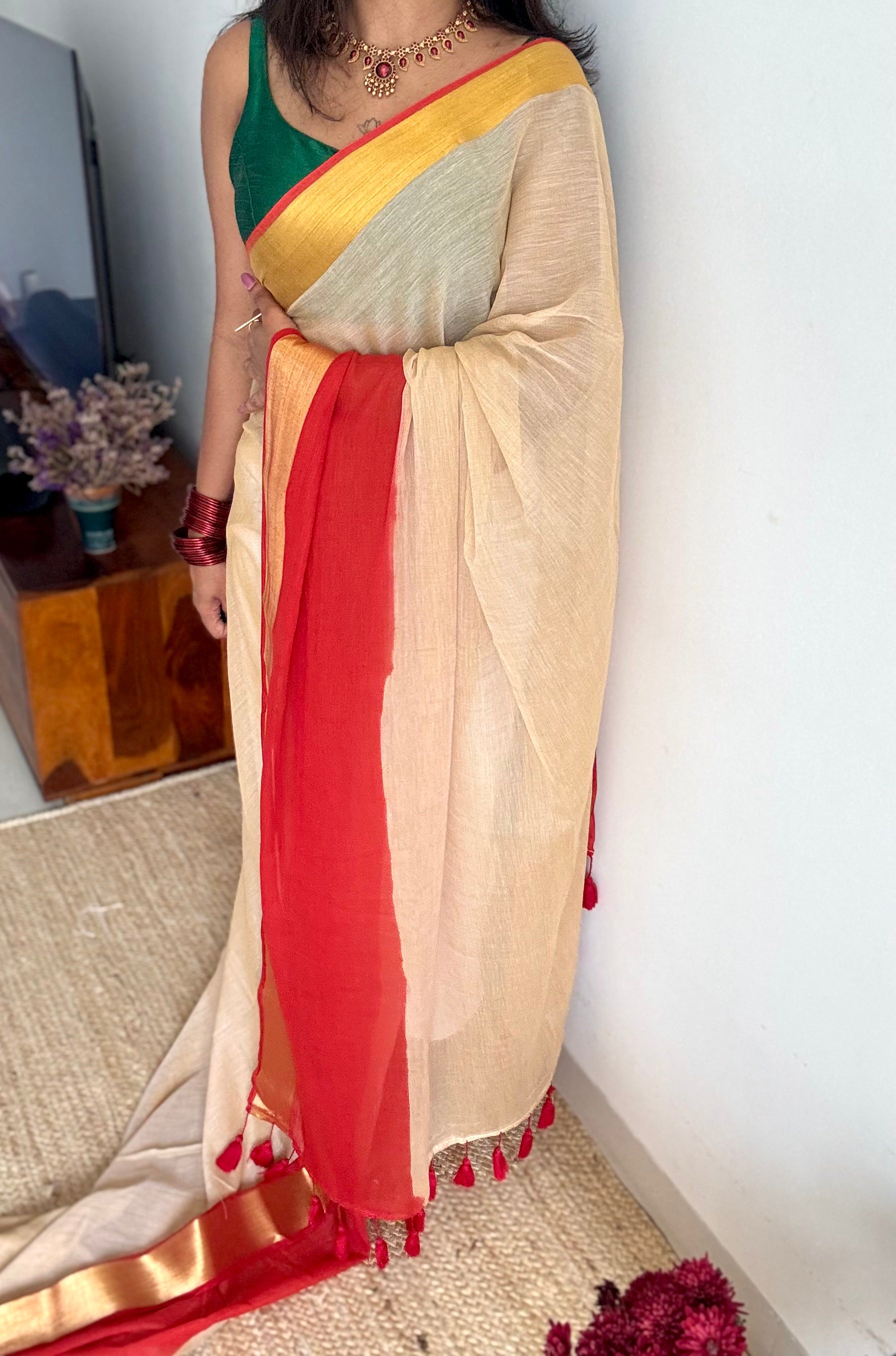 Everybody's favourite mul cotton in a dyed red and gold zari border, sandal coloured body, soft & easy to drape.