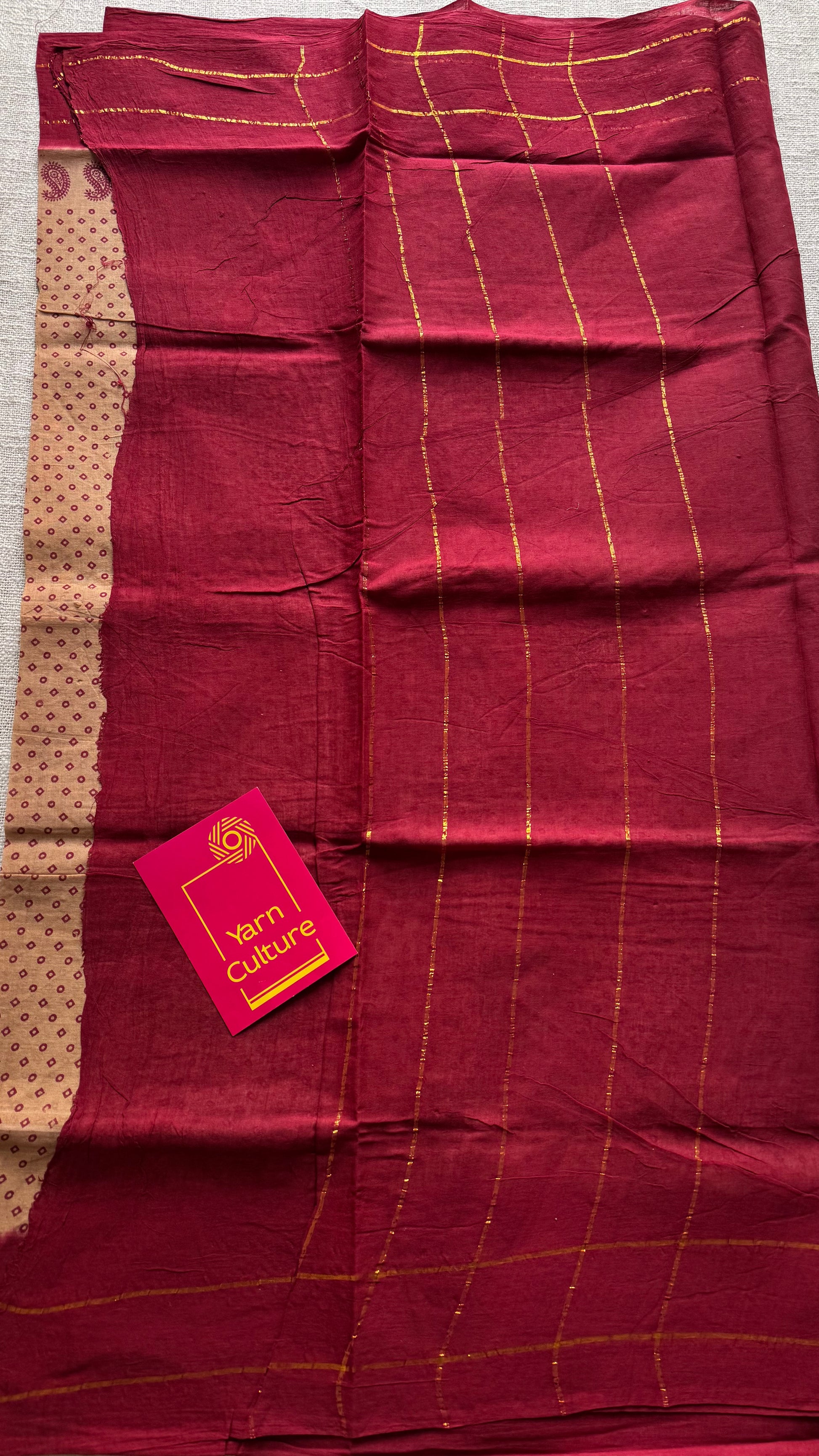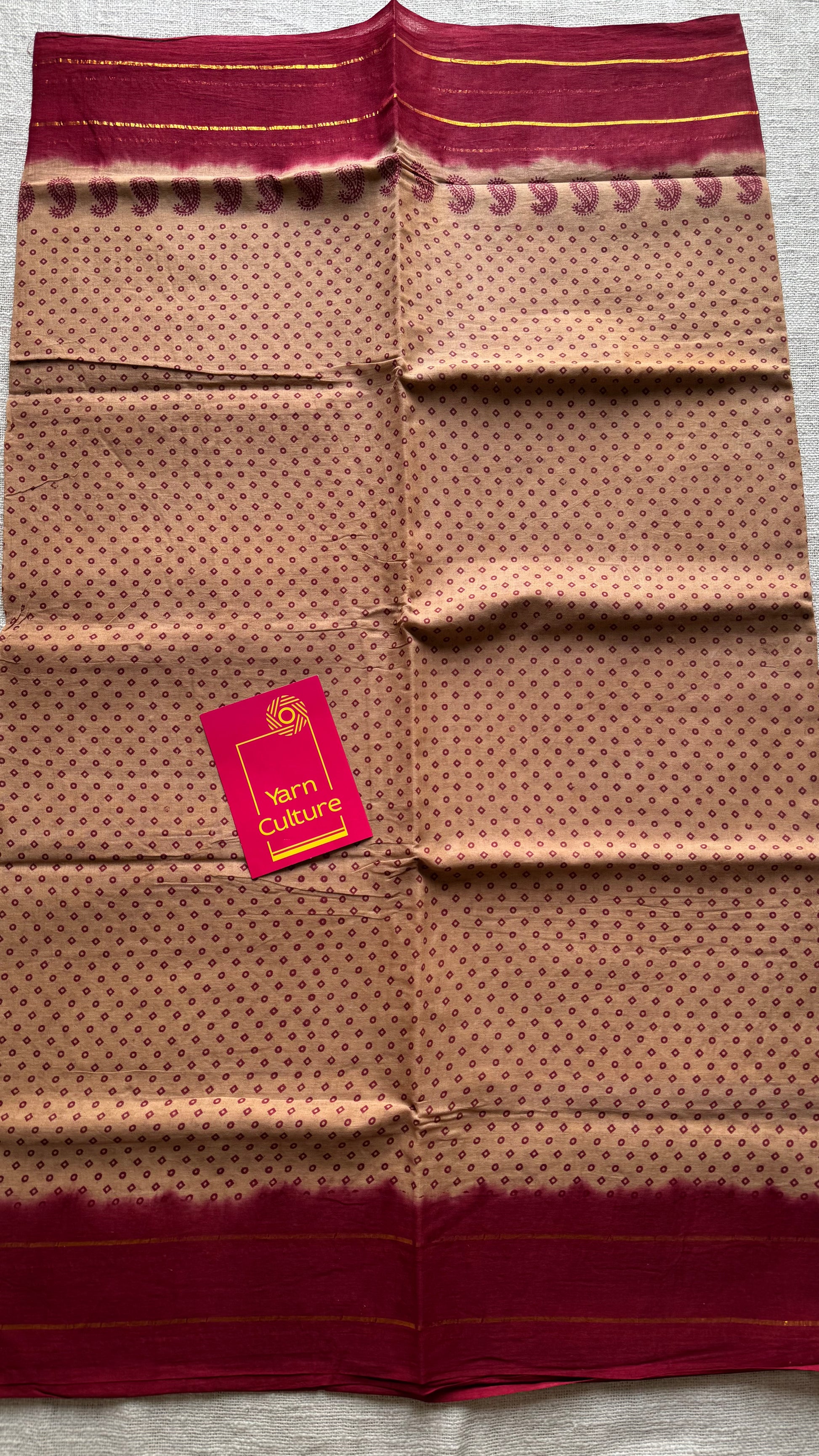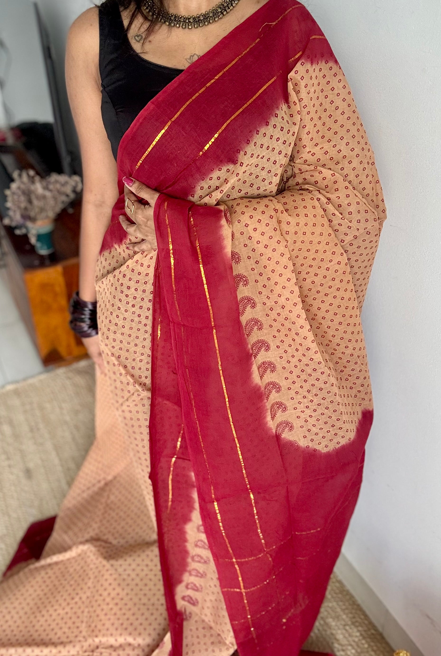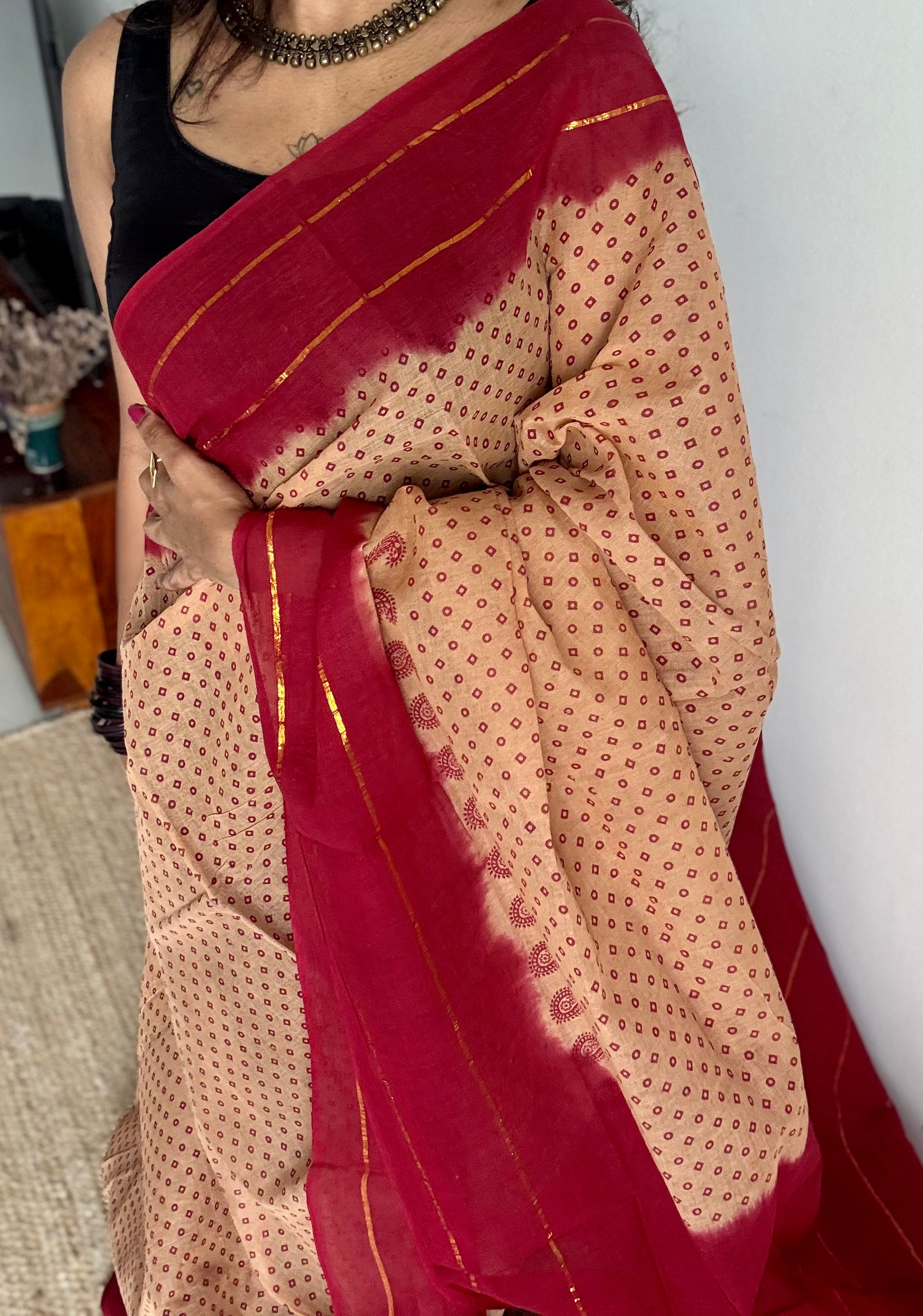 Sandal with red, printed sungudi, madurai cotton, no blouse.