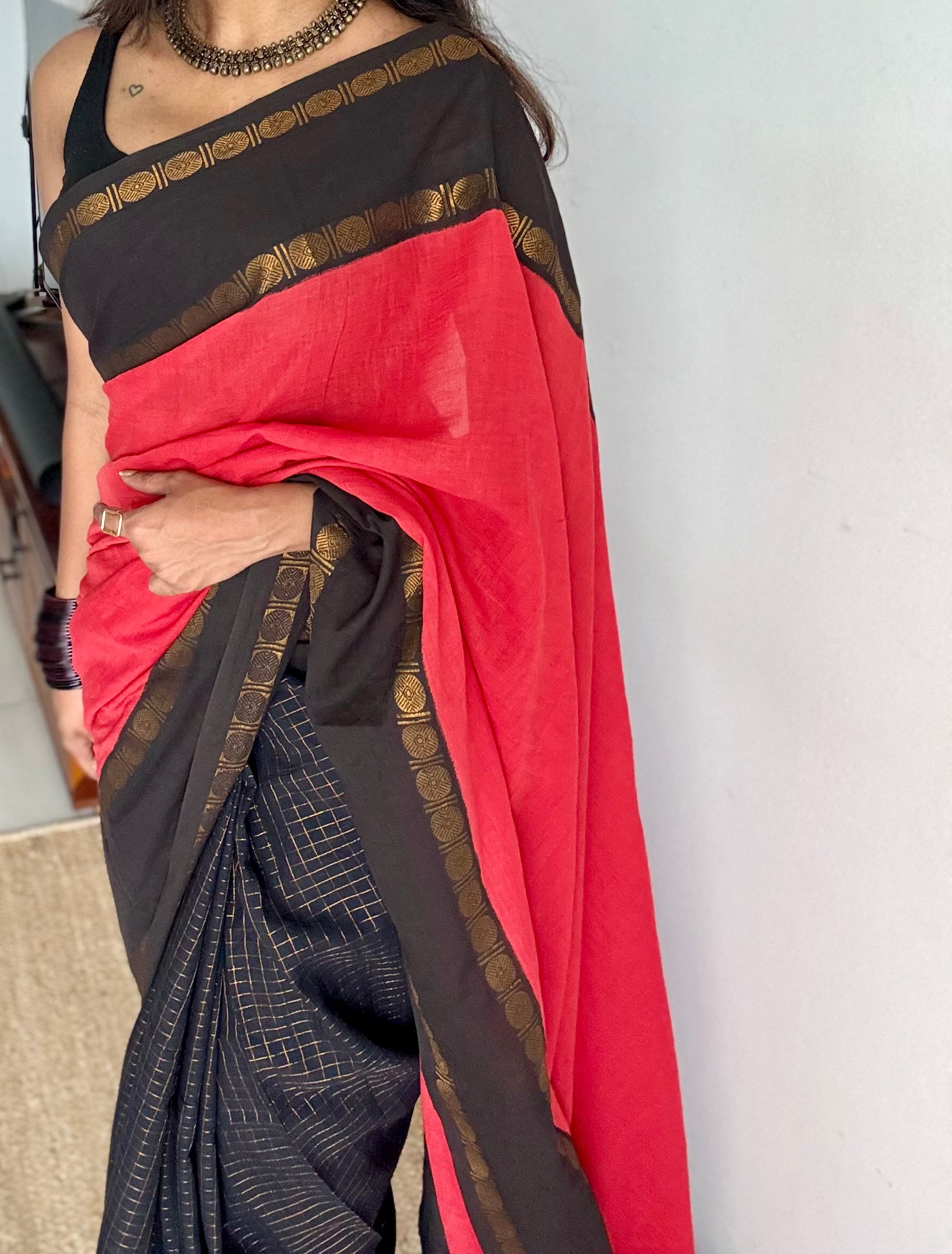 Sengathir (செங்கதிர்) : bright red with black checks, sungudi cotton - YCCOTNMSJA187