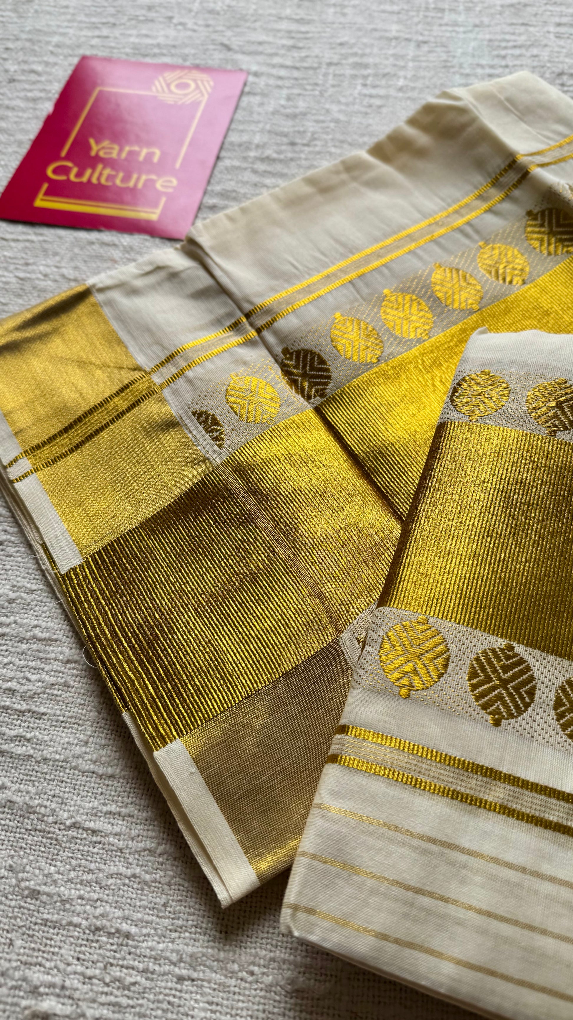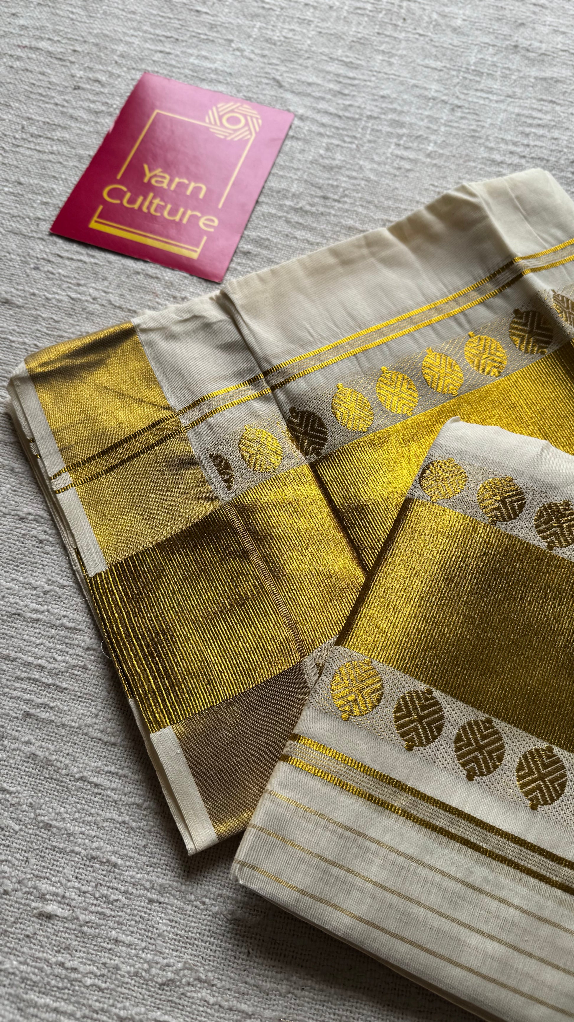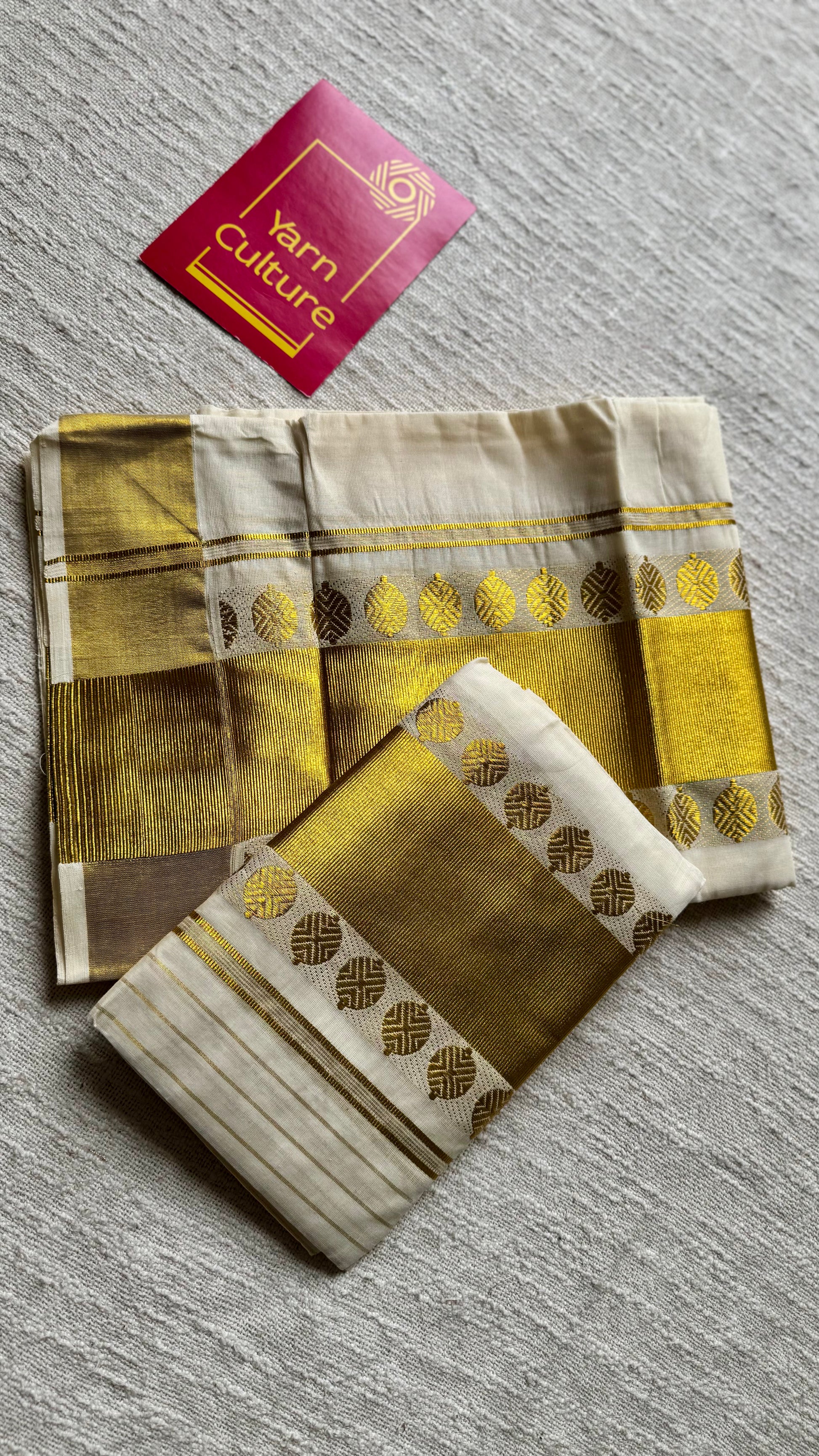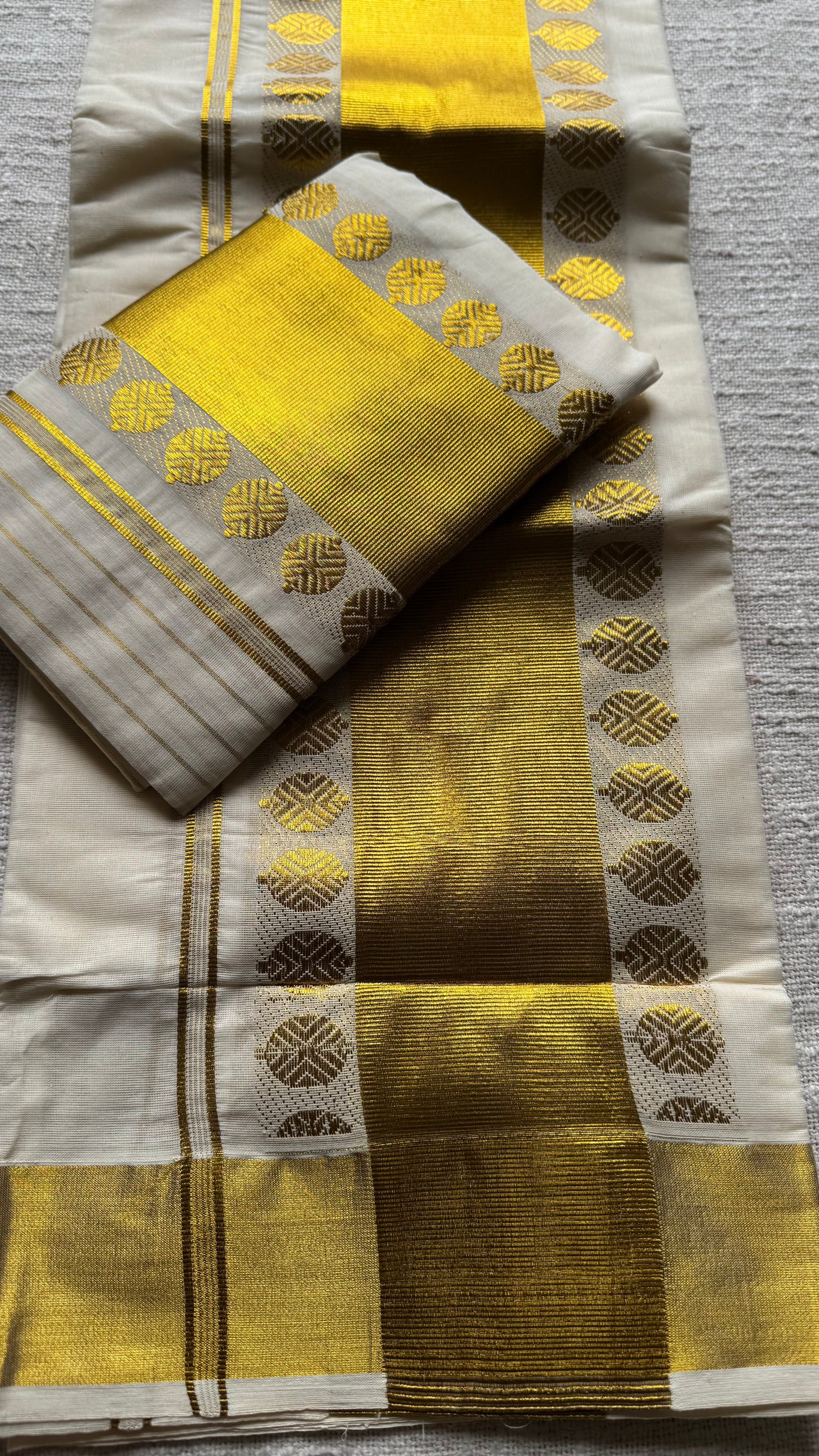 Material: Kerala Cotton/Additional info: Without blouse, Length of mund/bottom - 2m, length of neriyathu/upper part - 2.8m/ Width: 44”
