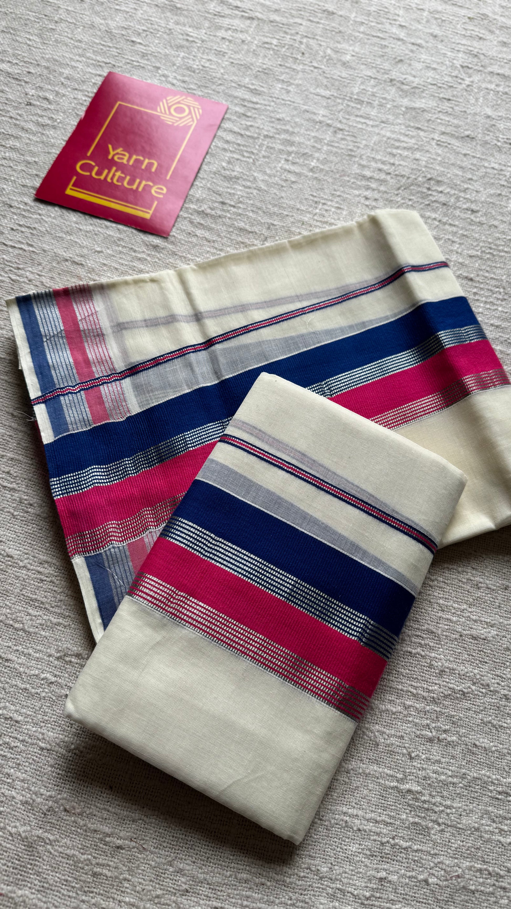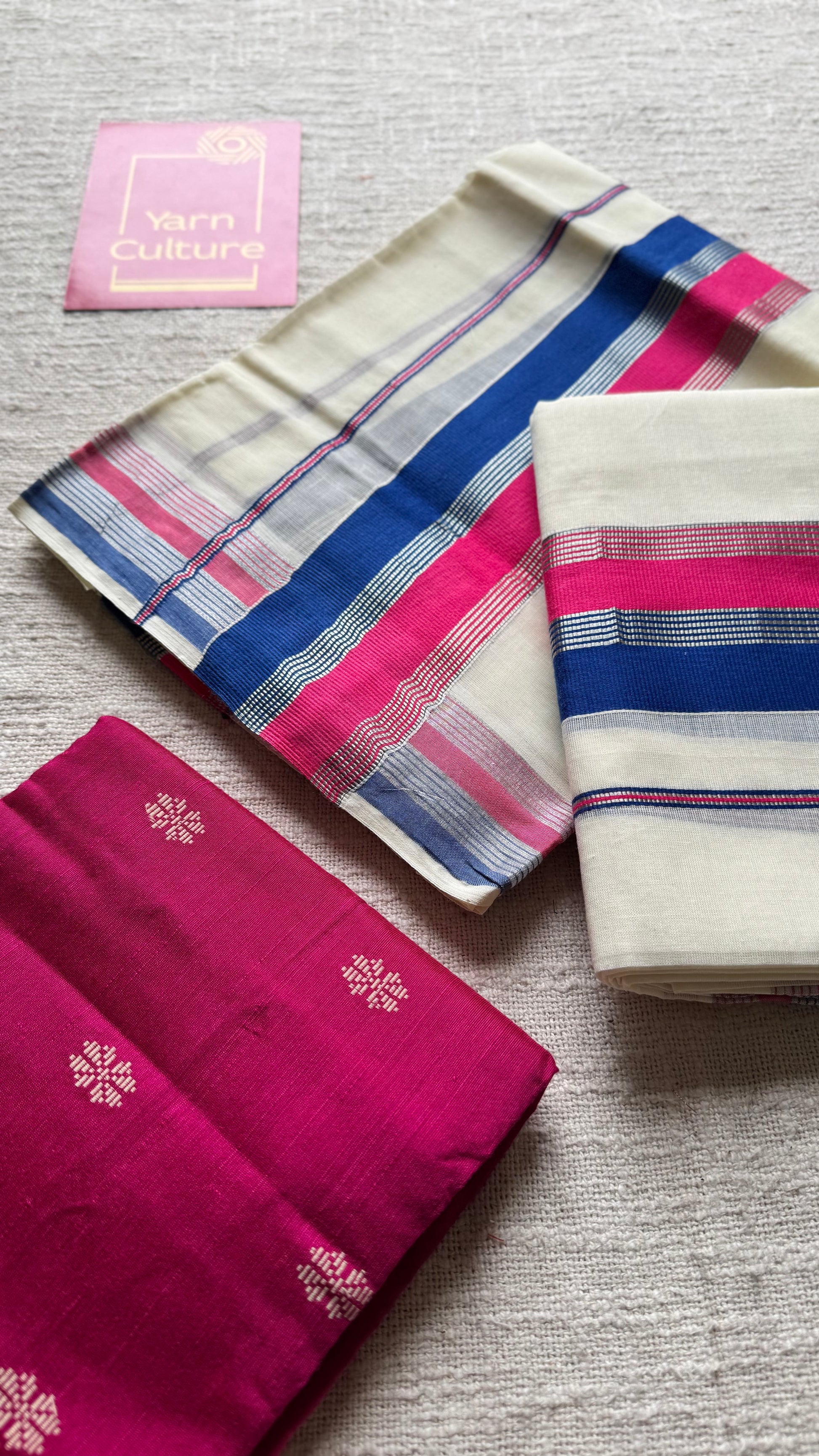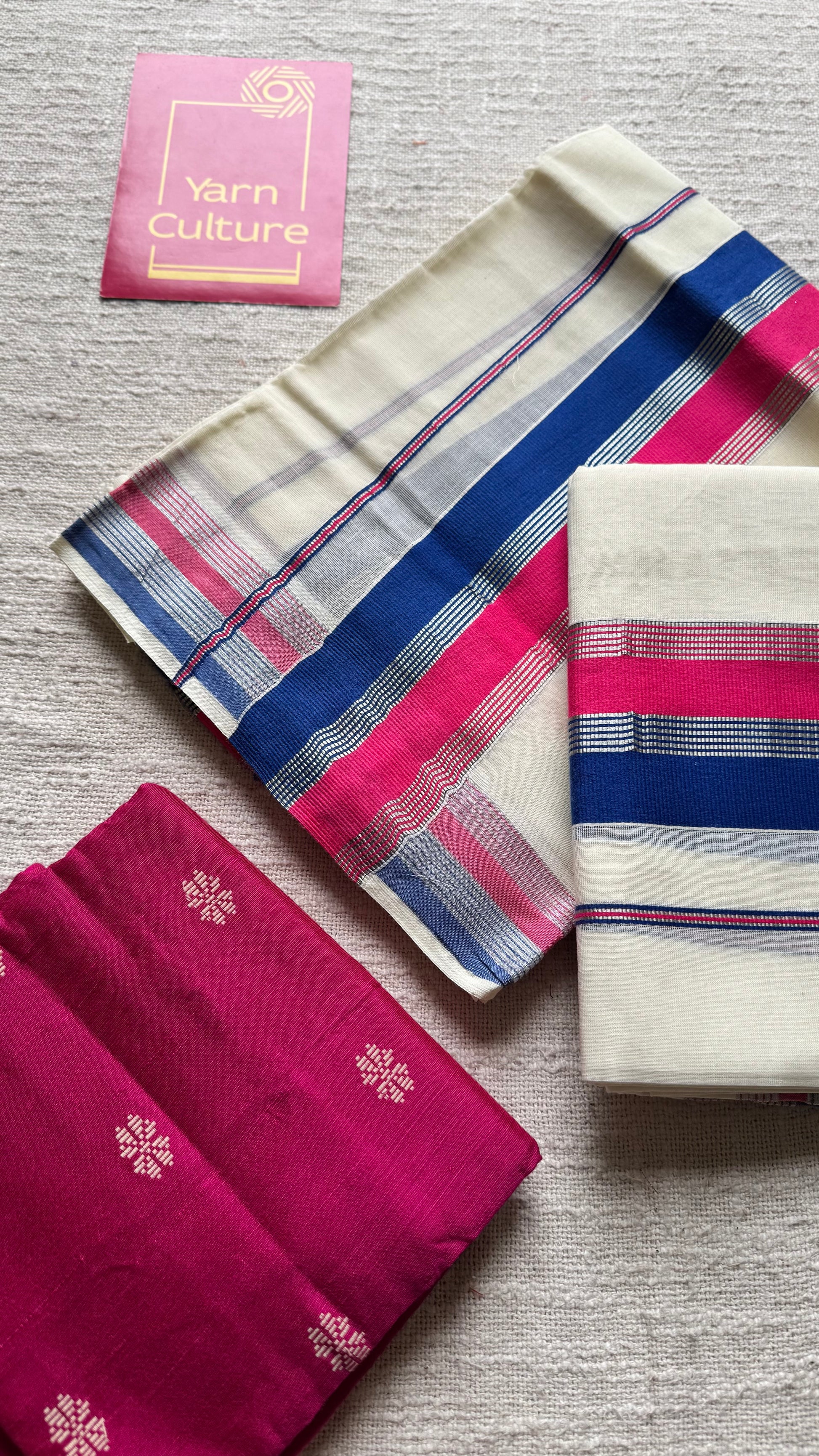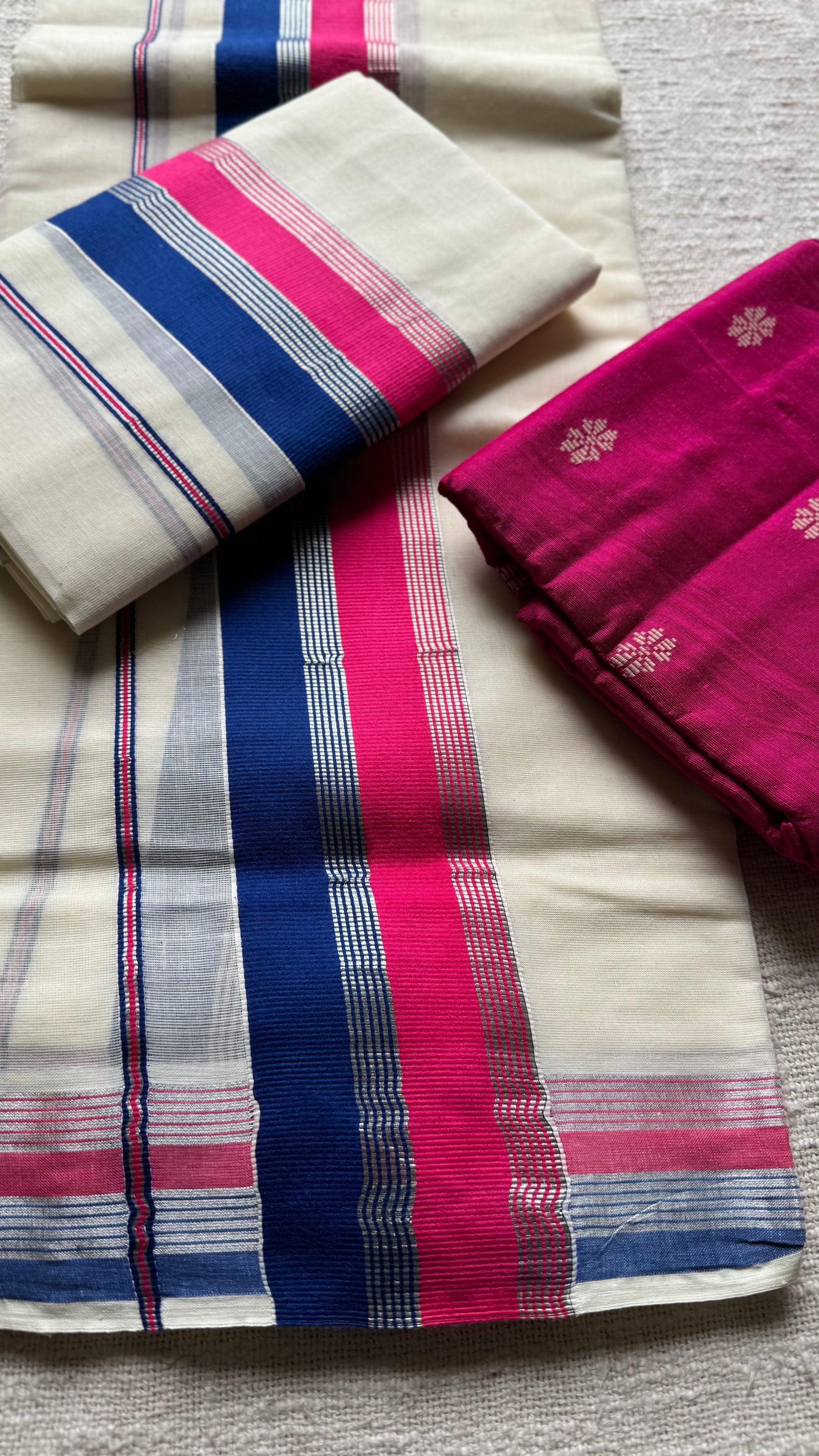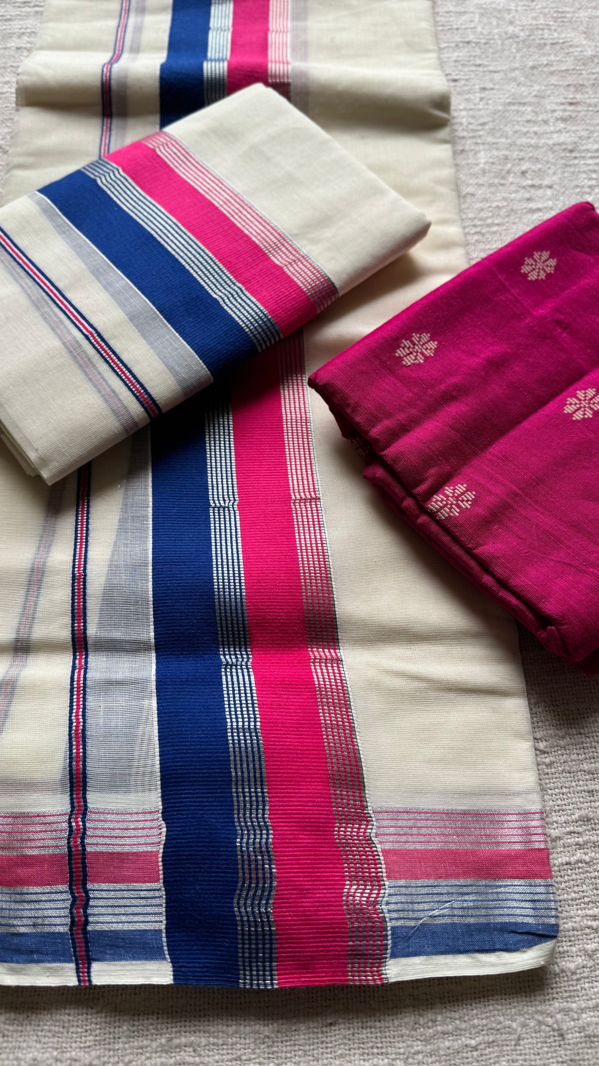 Material: Kerala Cotton/Additional info: With additional blouse, Length of mund/bottom - 2m, length of neriyathu/upper part - 2.8m/ Width: 44”