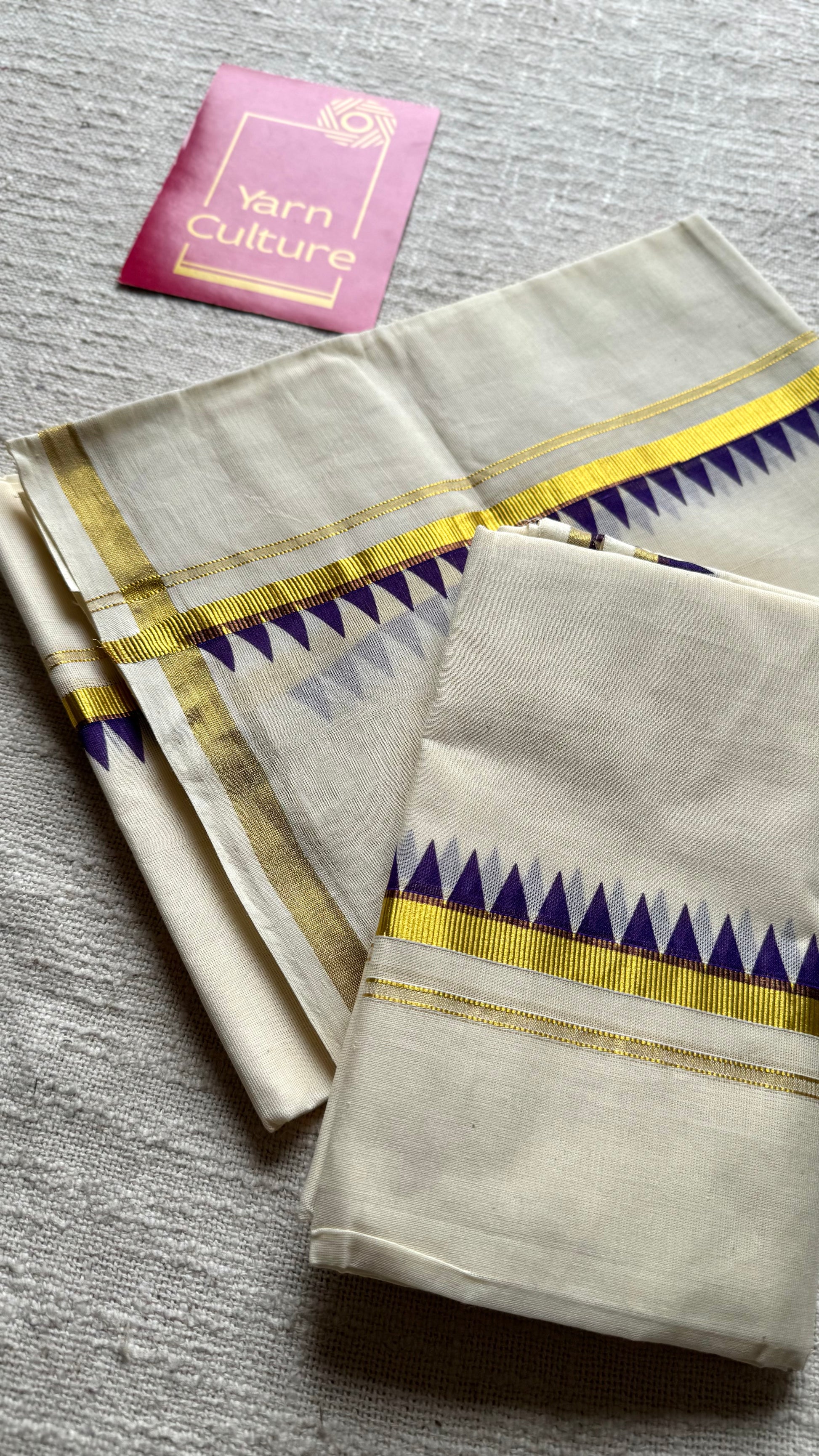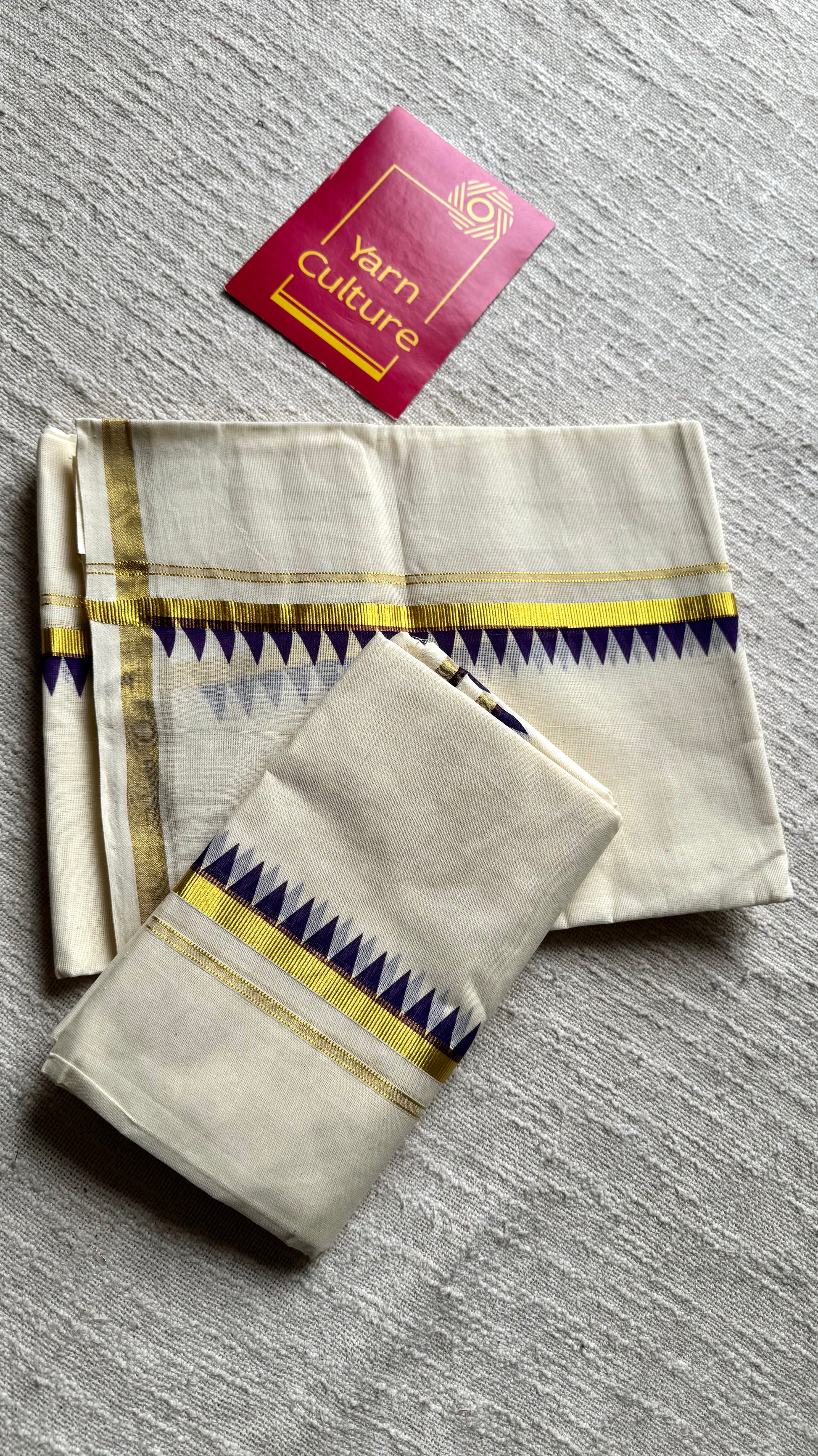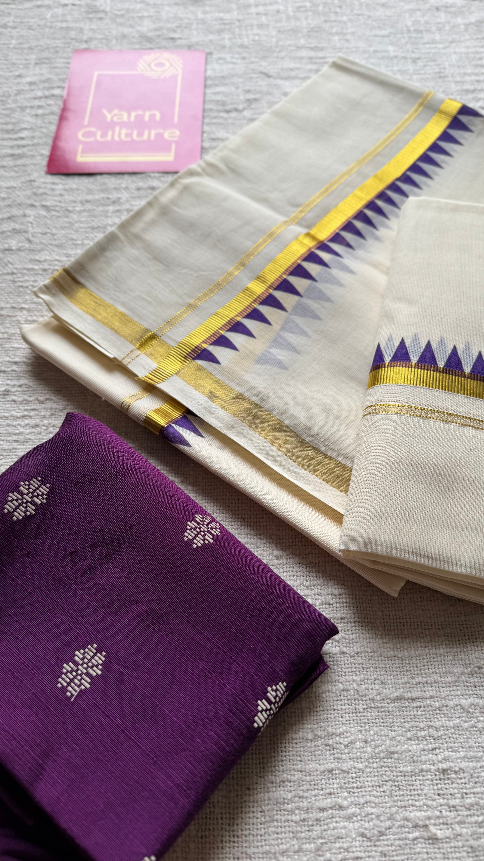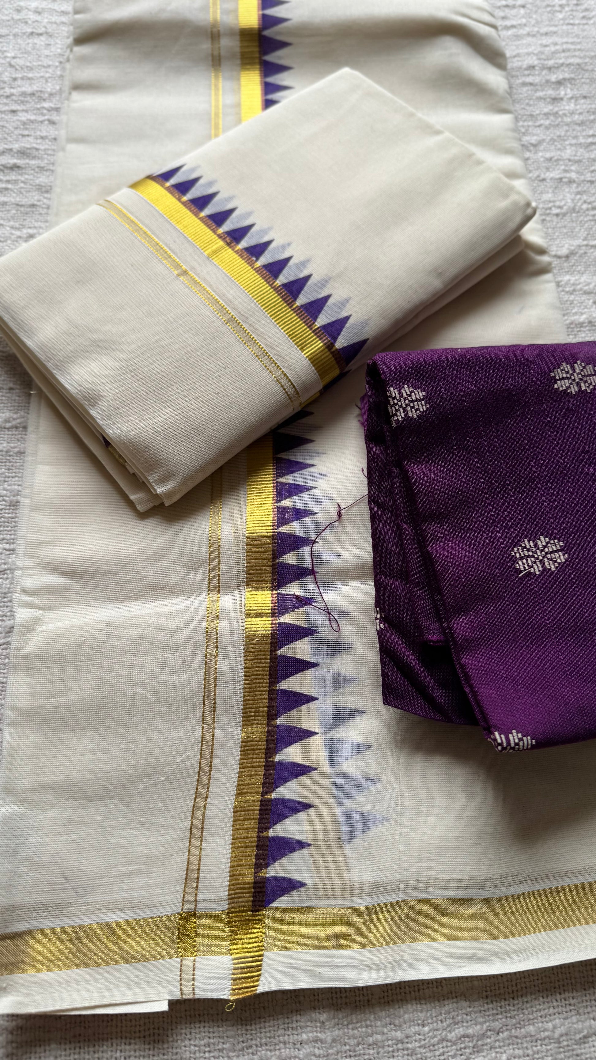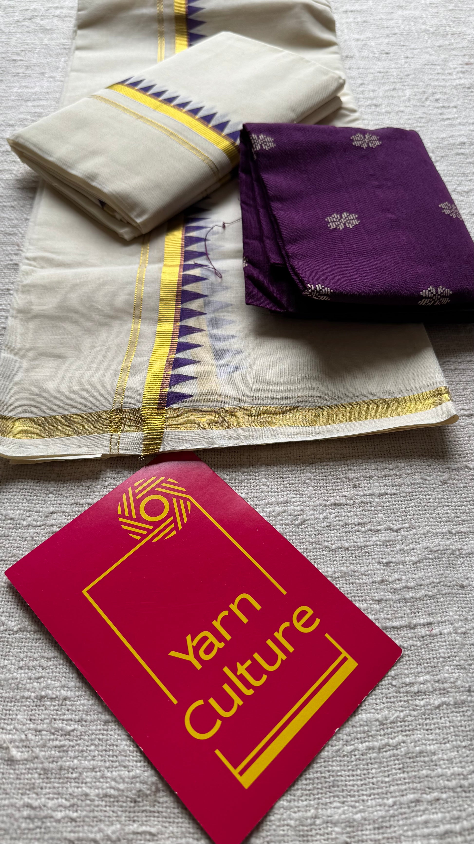 Material: Kerala Cotton/Additional info: With additional blouse, Length of mund/bottom - 2m, length of neriyathu/upper part - 2.8m/ Width: 44”