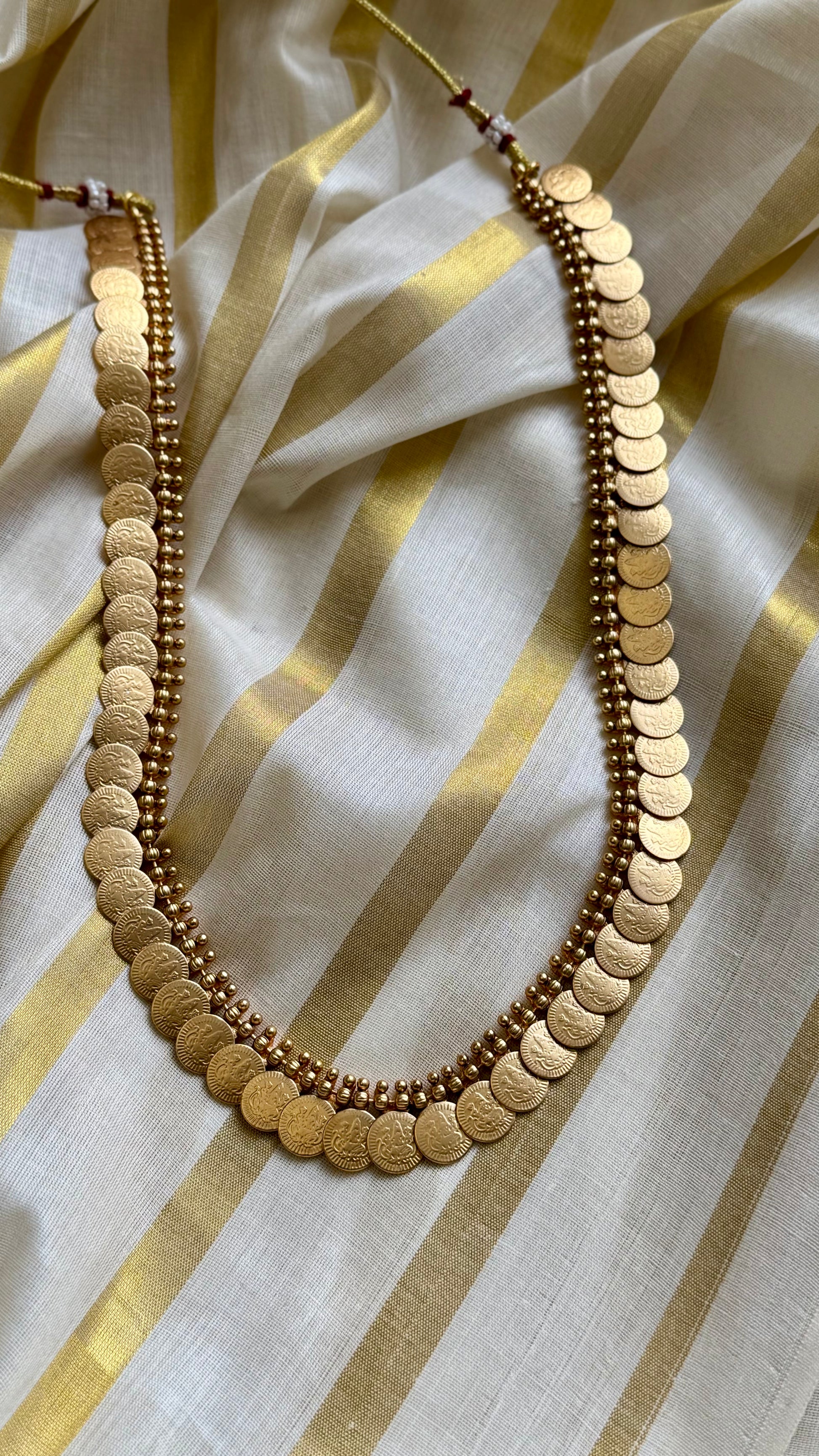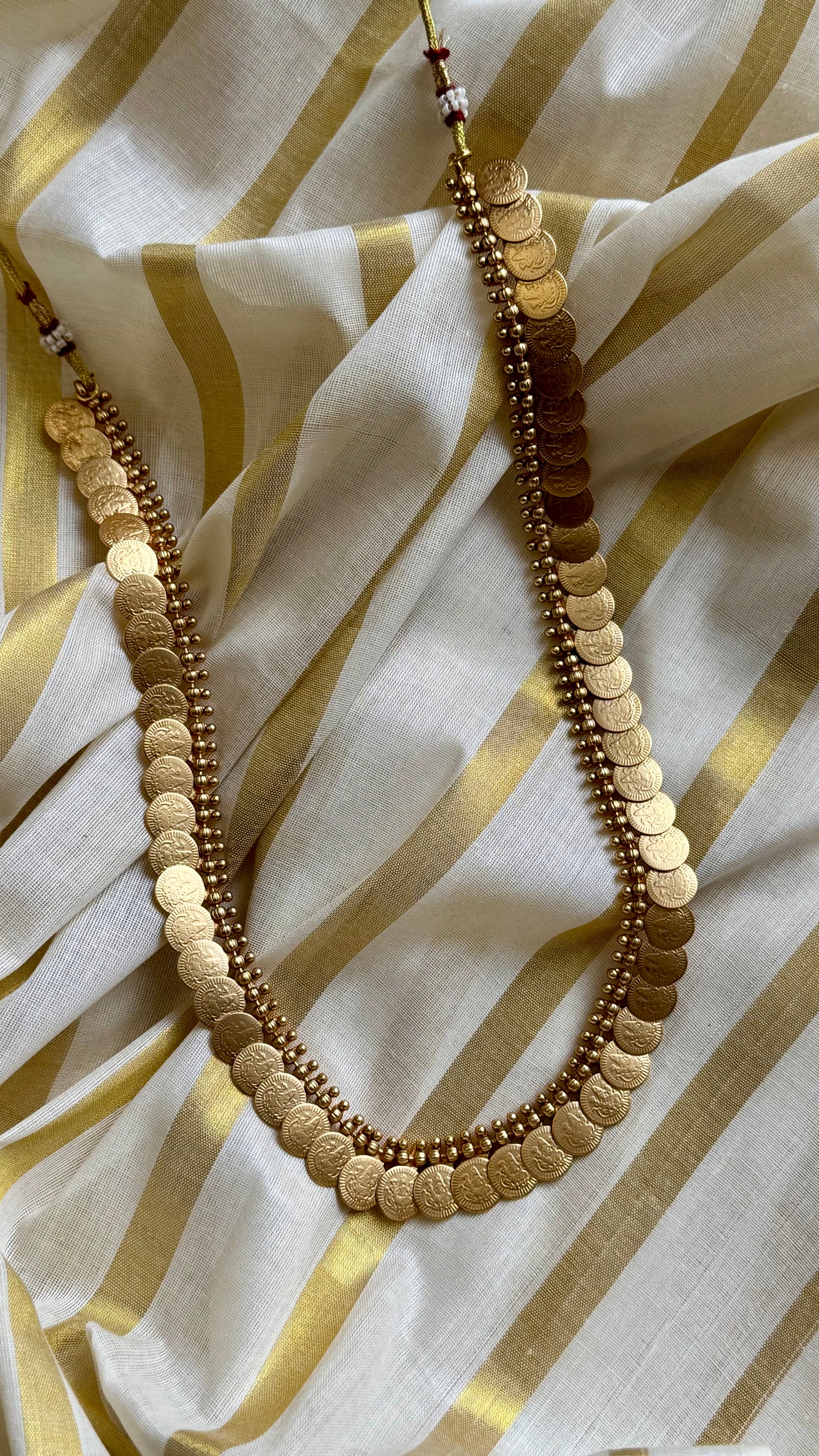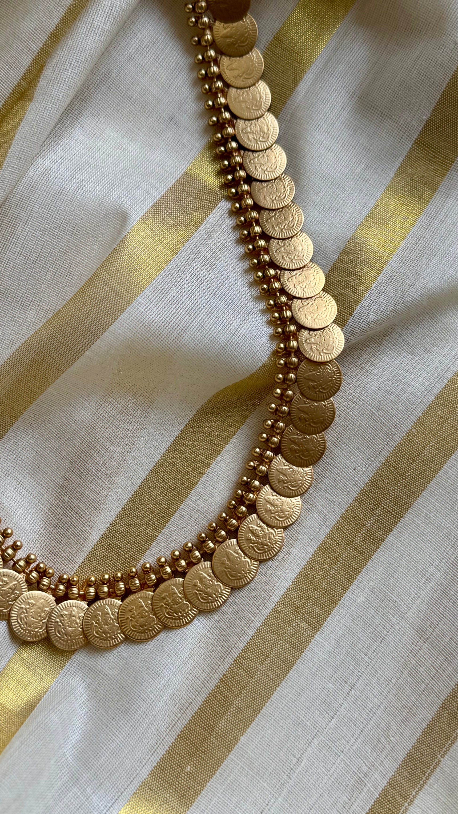 Antique gold coin pattern in a single layer, long neckpiece. Tradition at it's best.