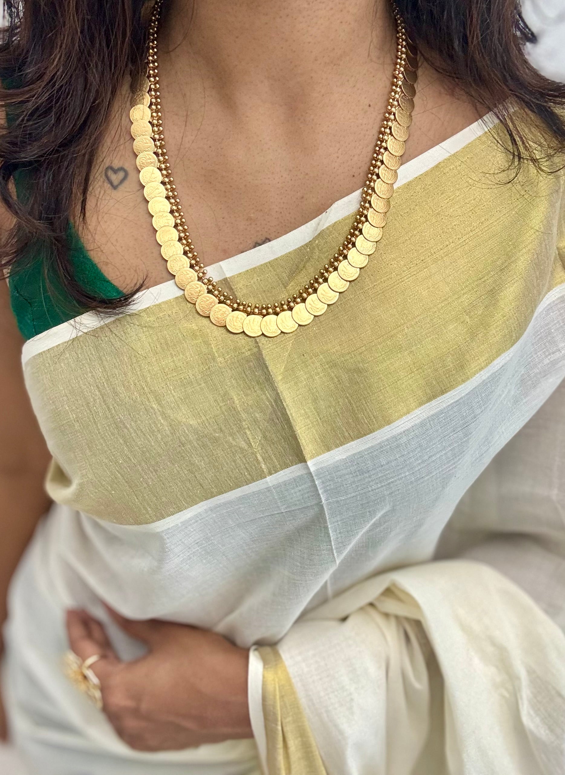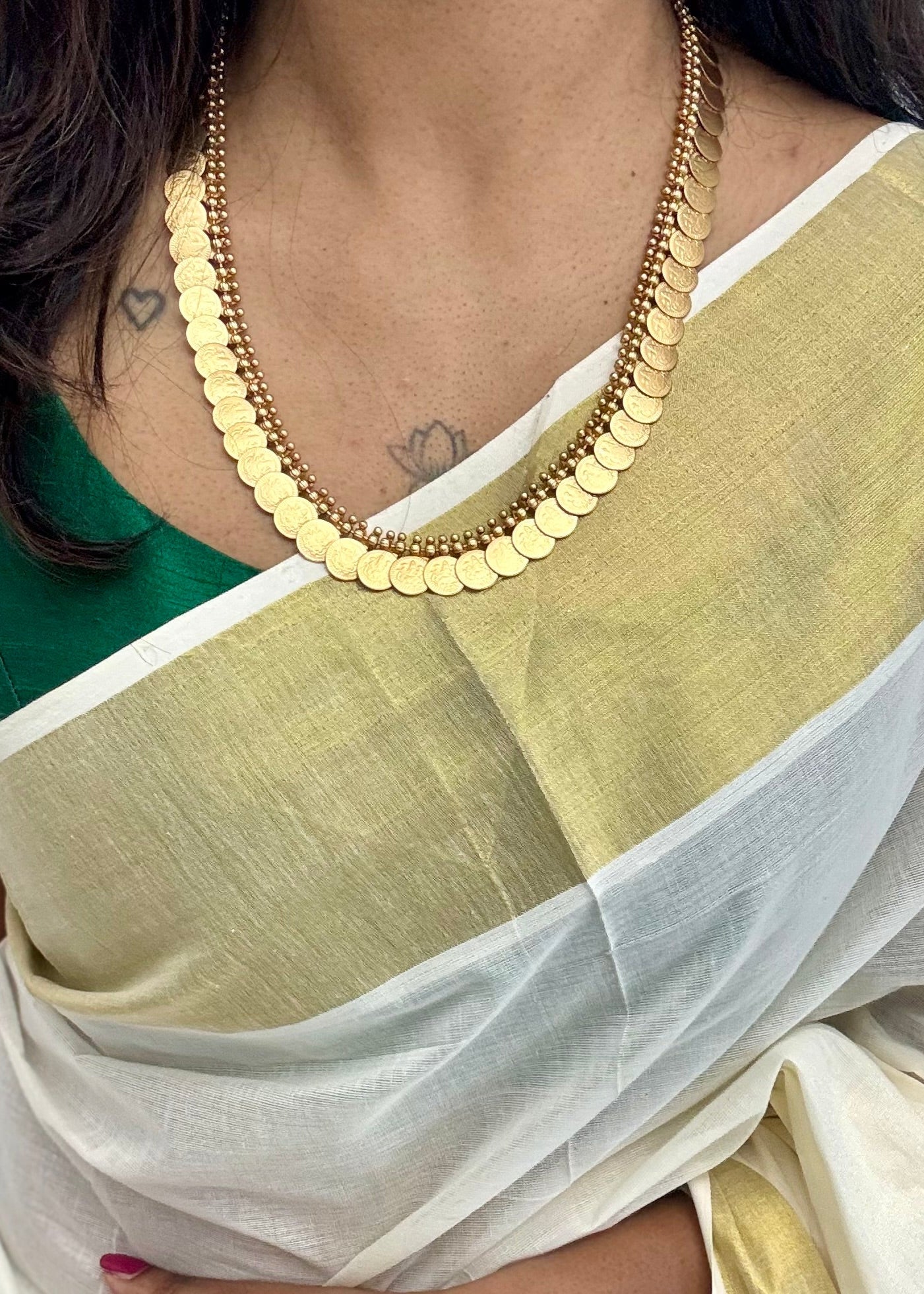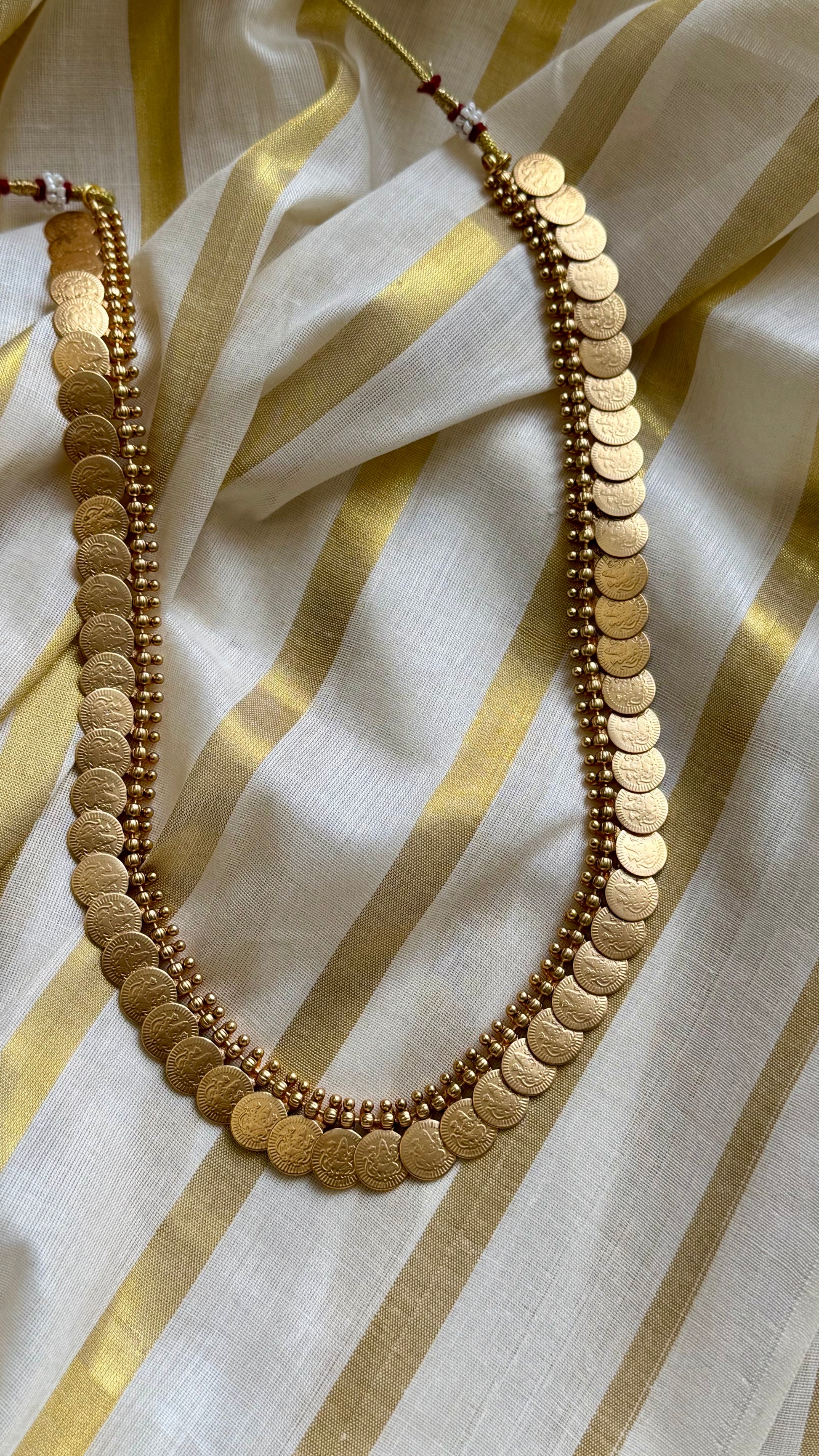 Antique gold coin pattern in a single layer, long neckpiece. Tradition at it's best.