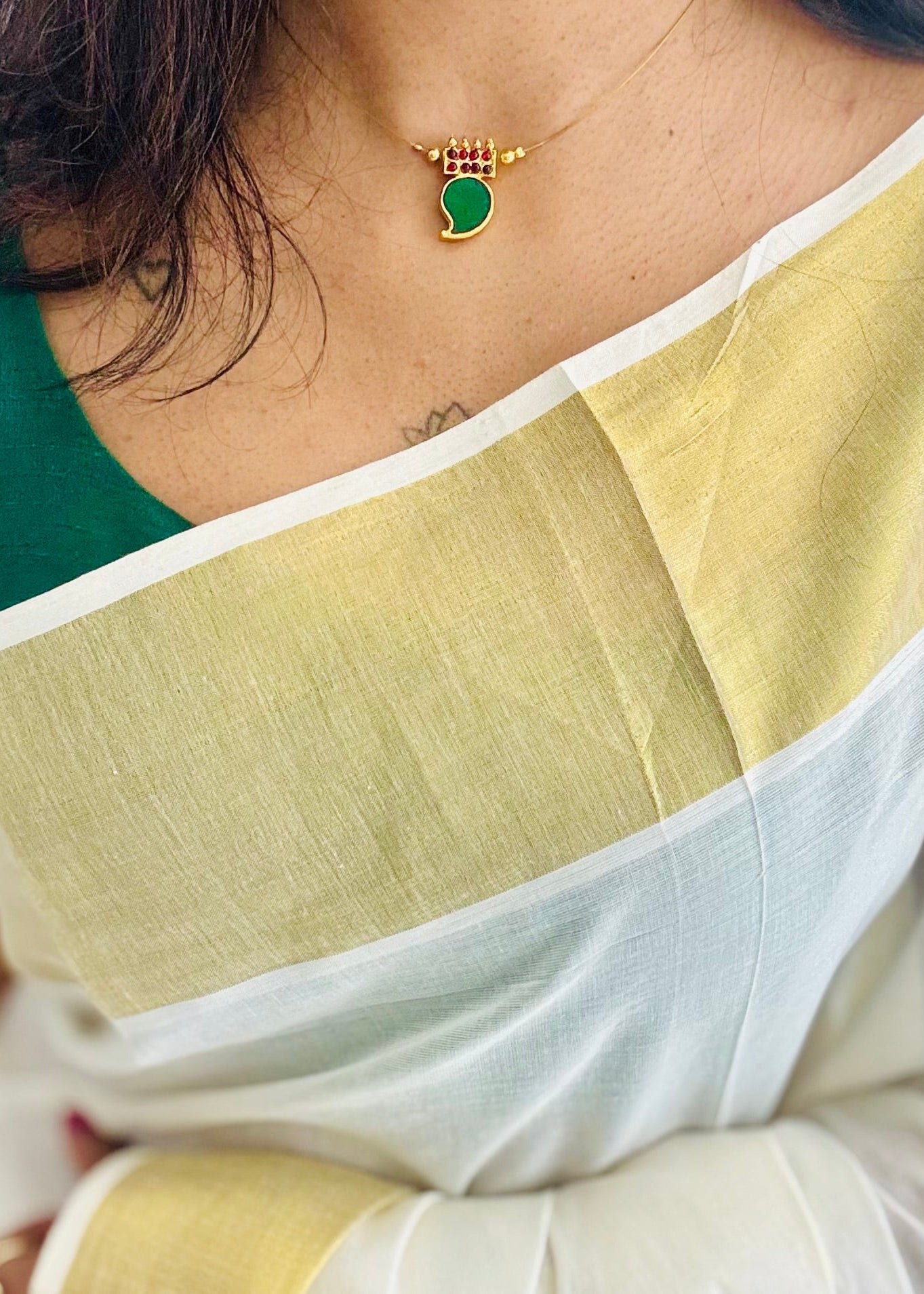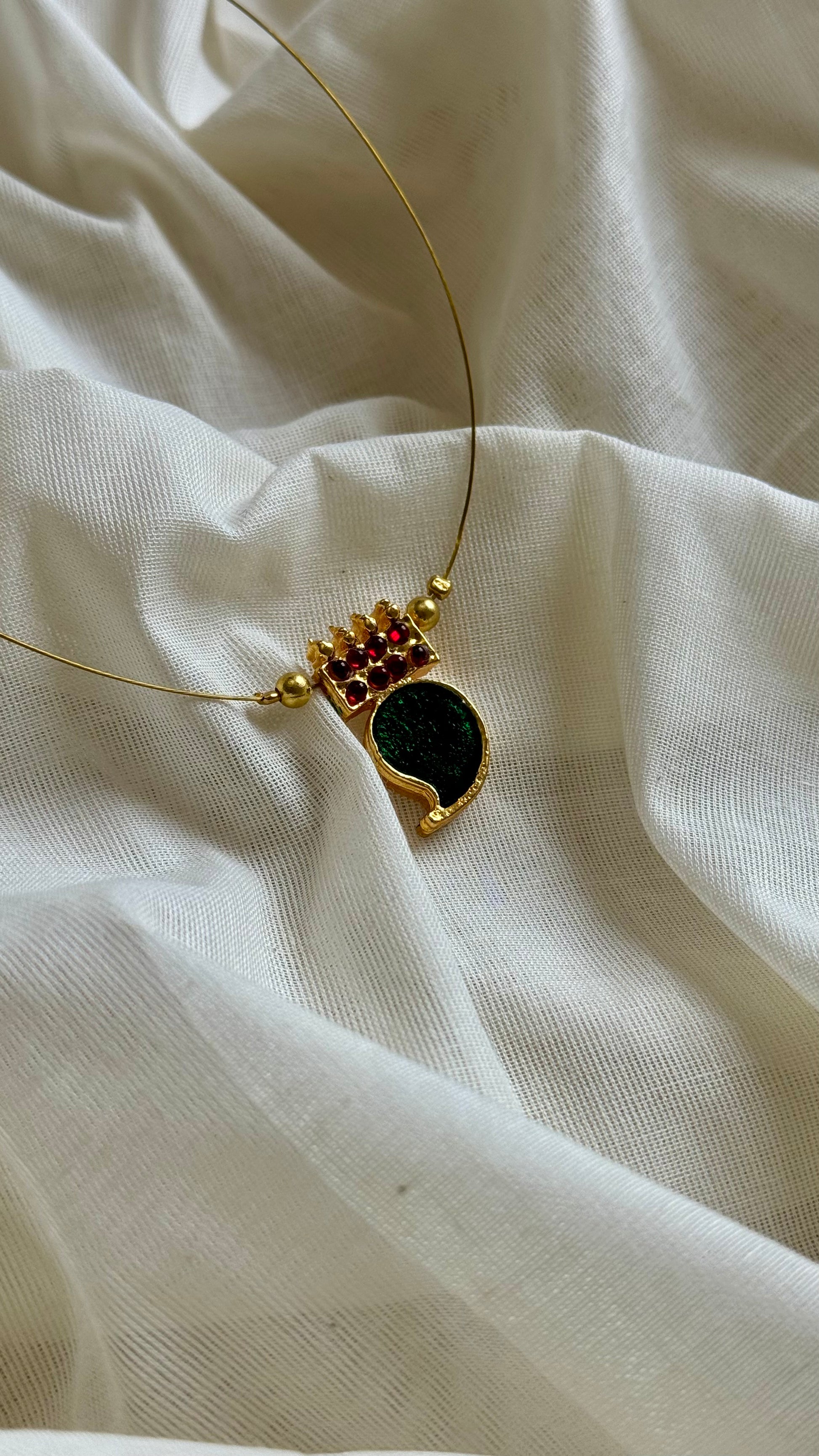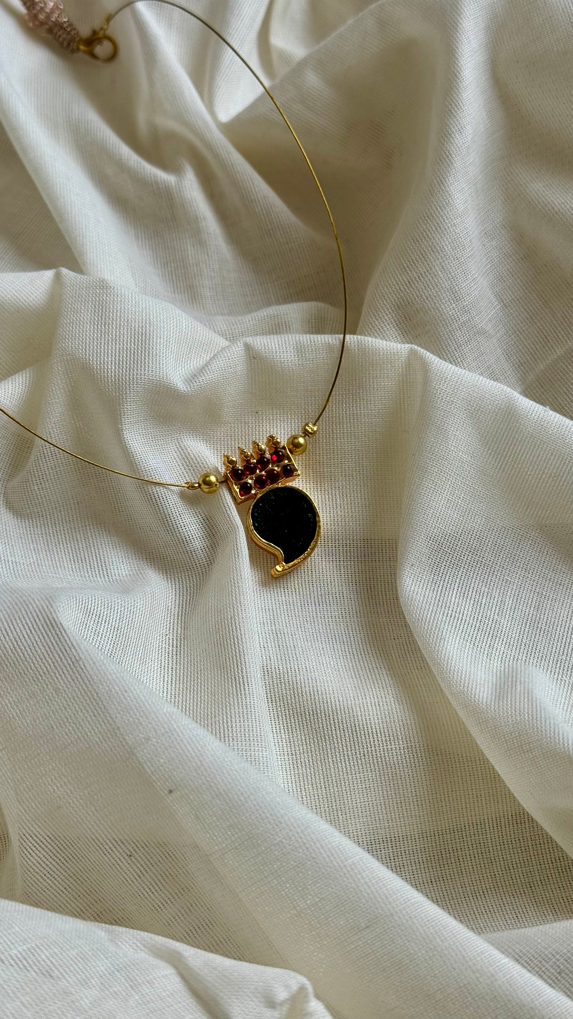 Single mango palakka pendant in invisible chain. Dark green and red stones in pendant.
