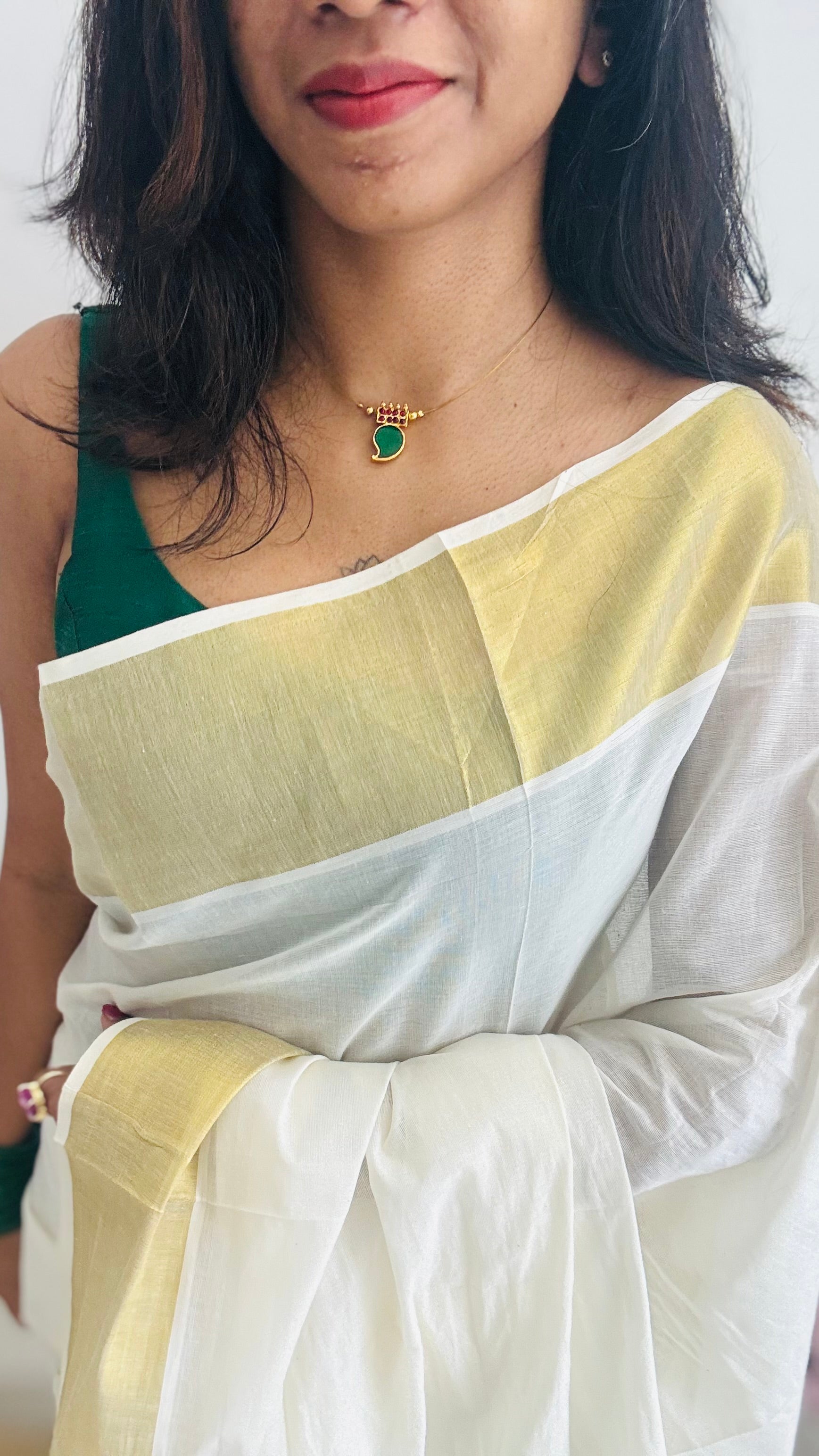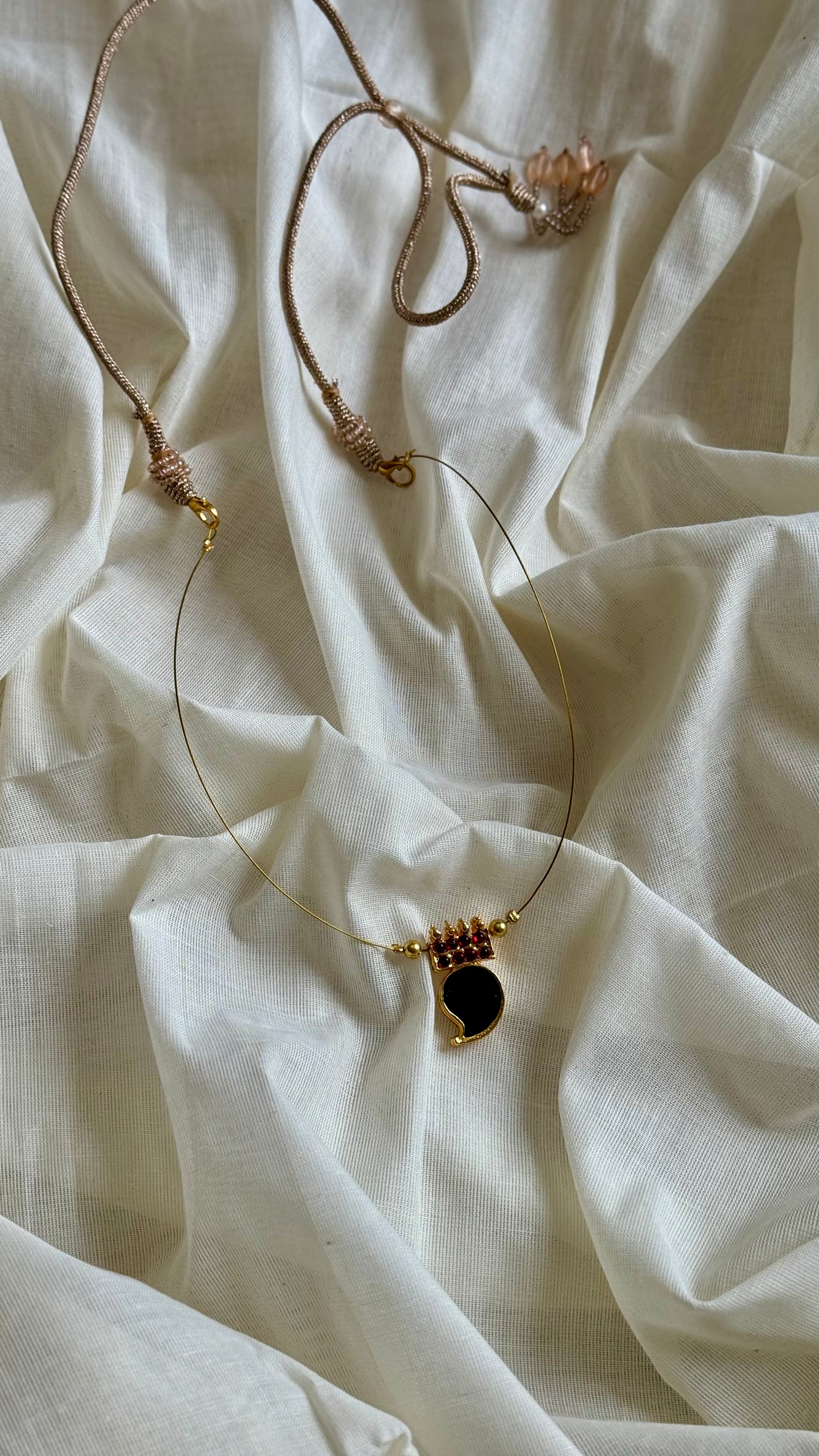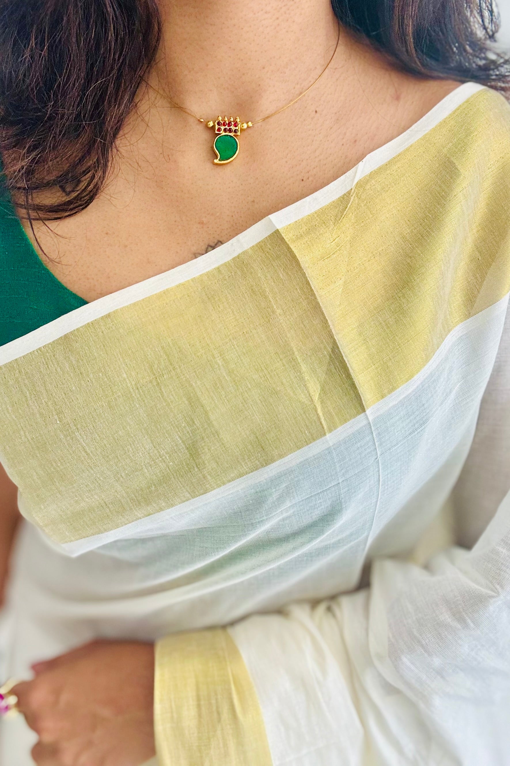 Single mango palakka pendant in invisible chain. Dark green and red stones in pendant.