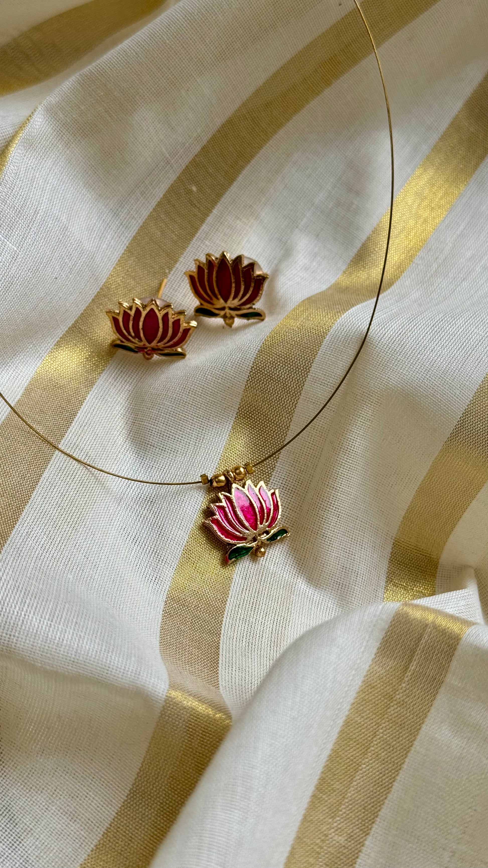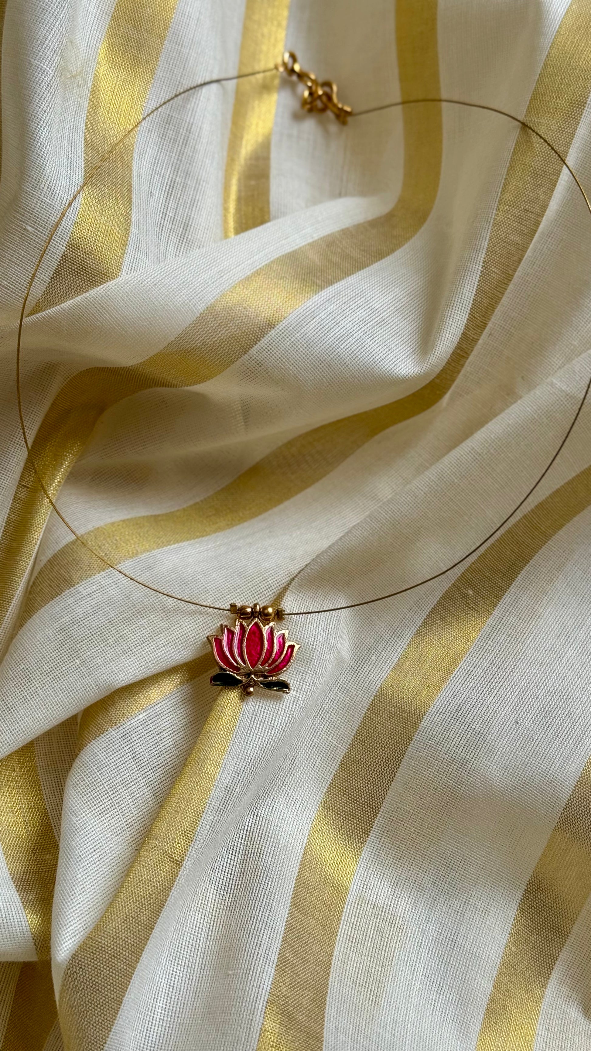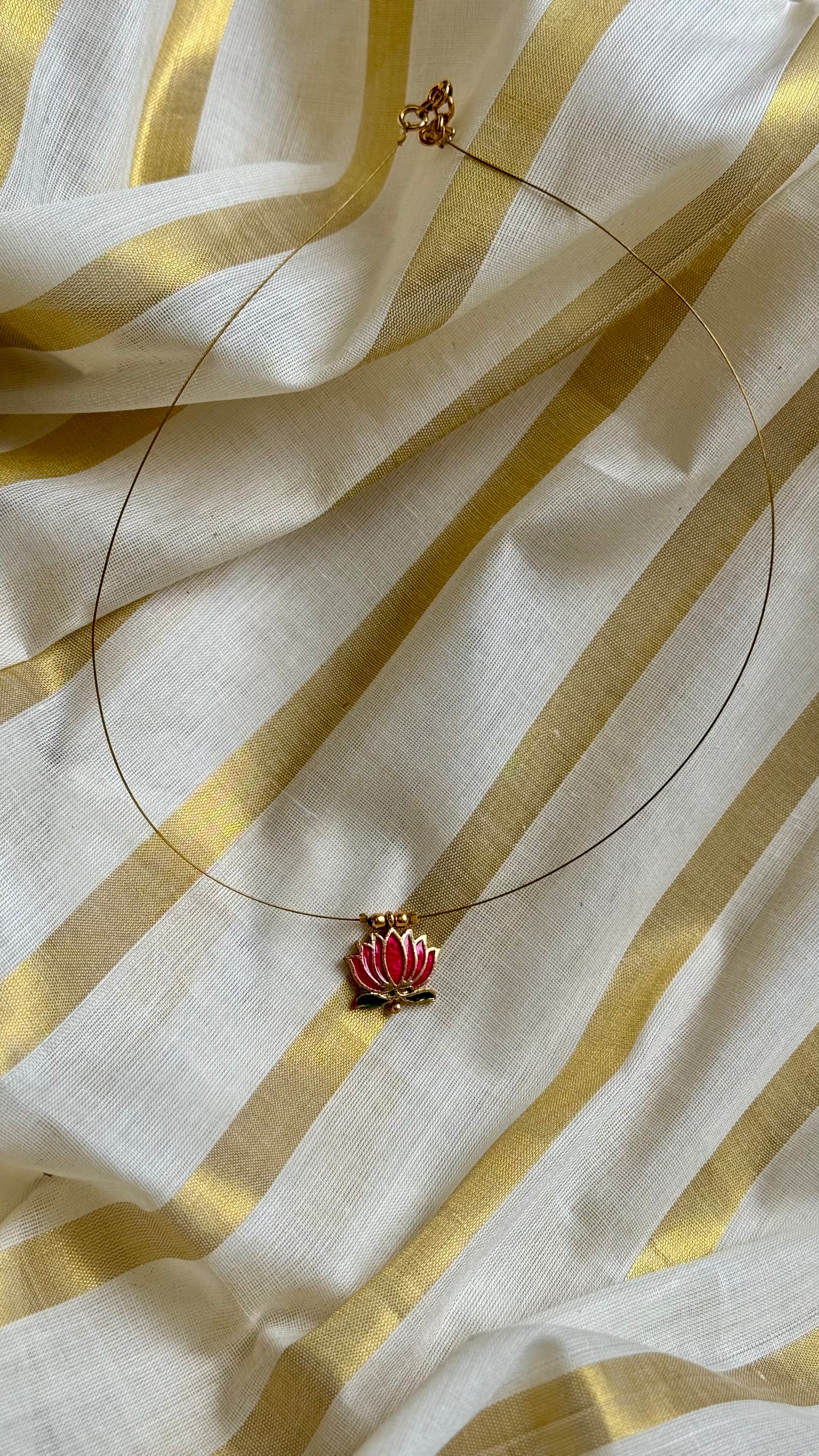 Single pink lotus pendant in invisible chain, minimally elegant.