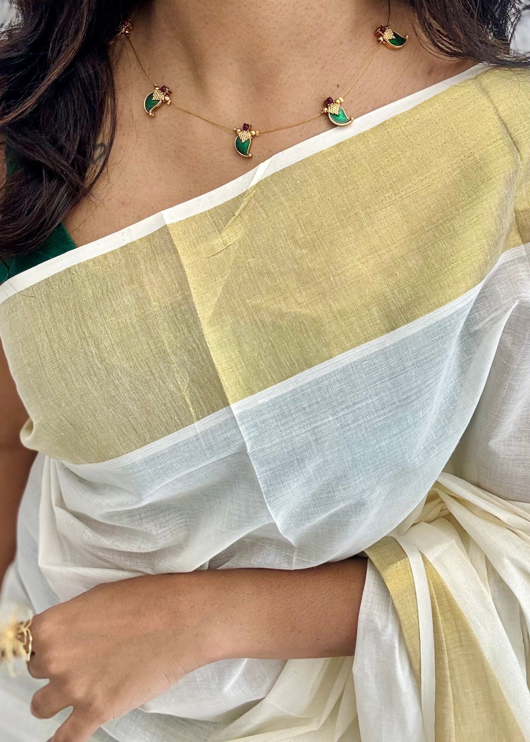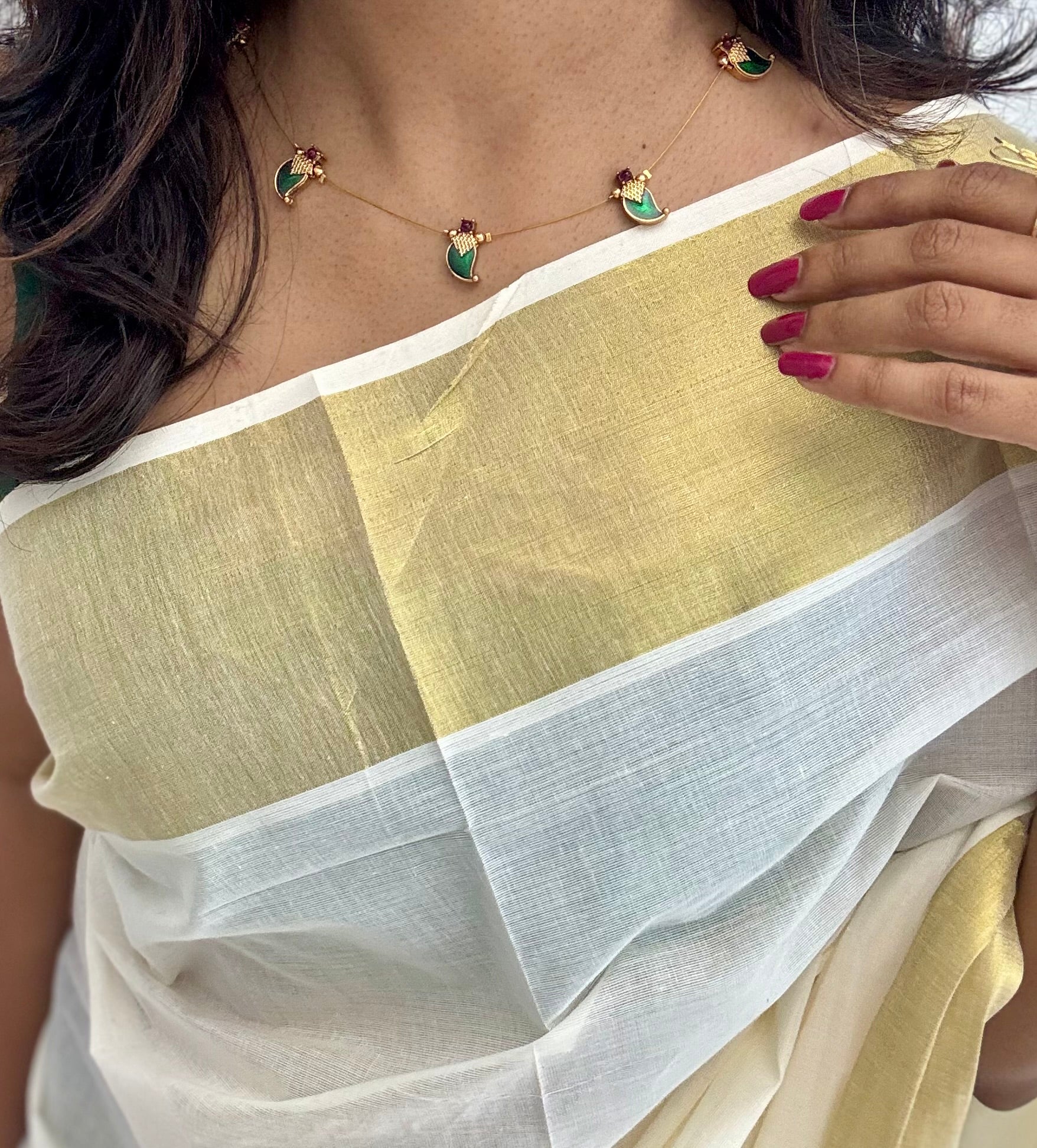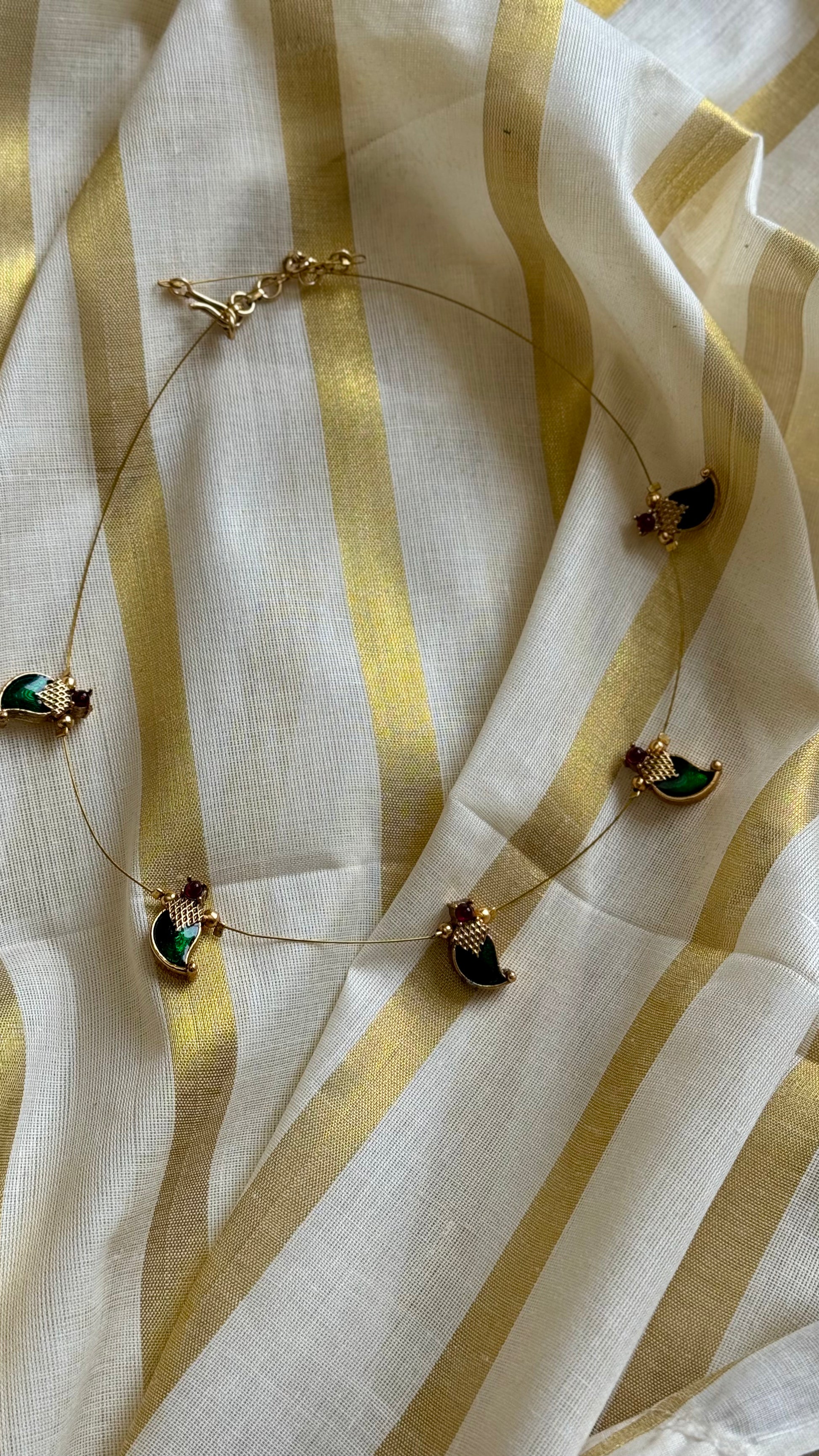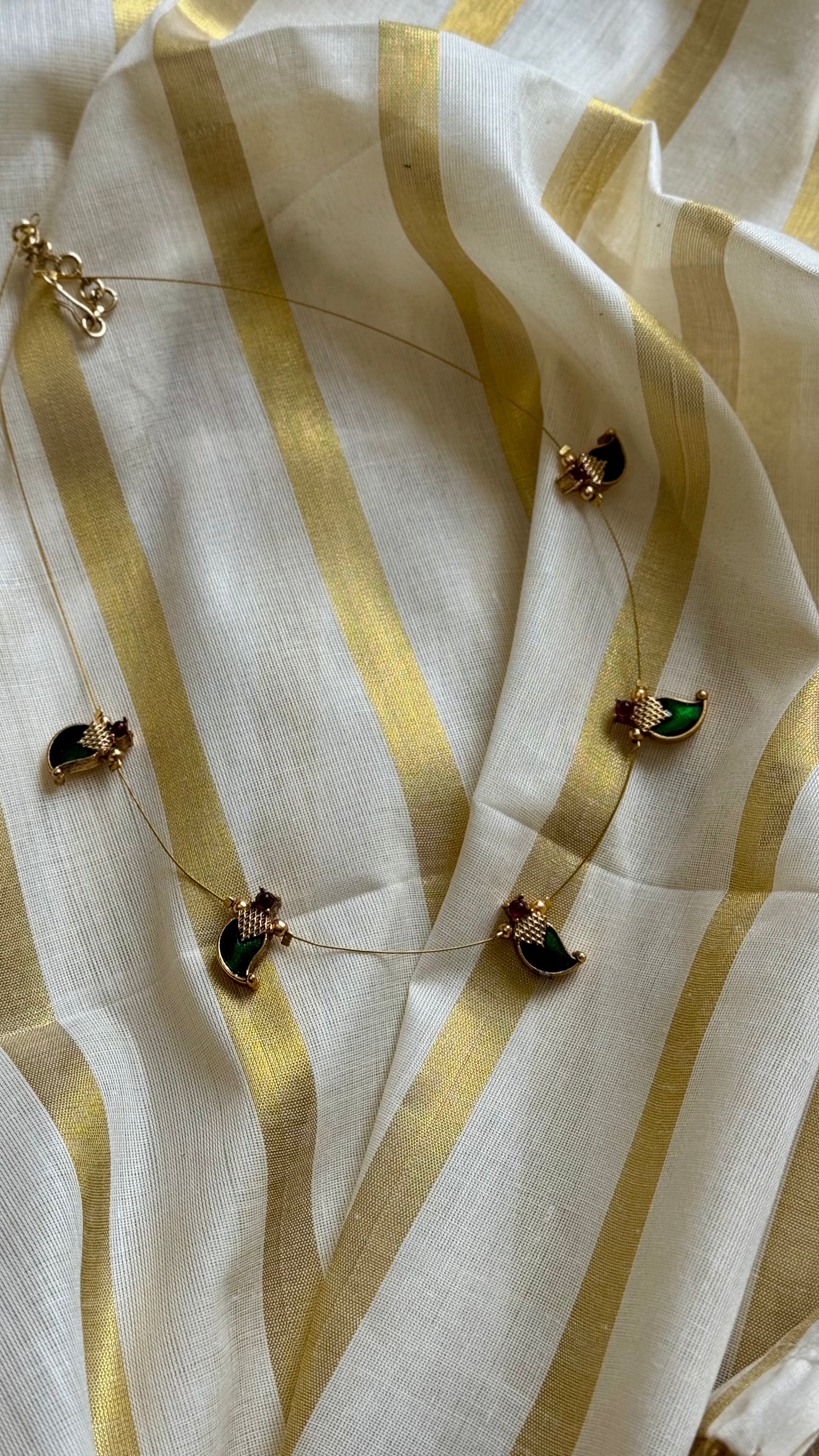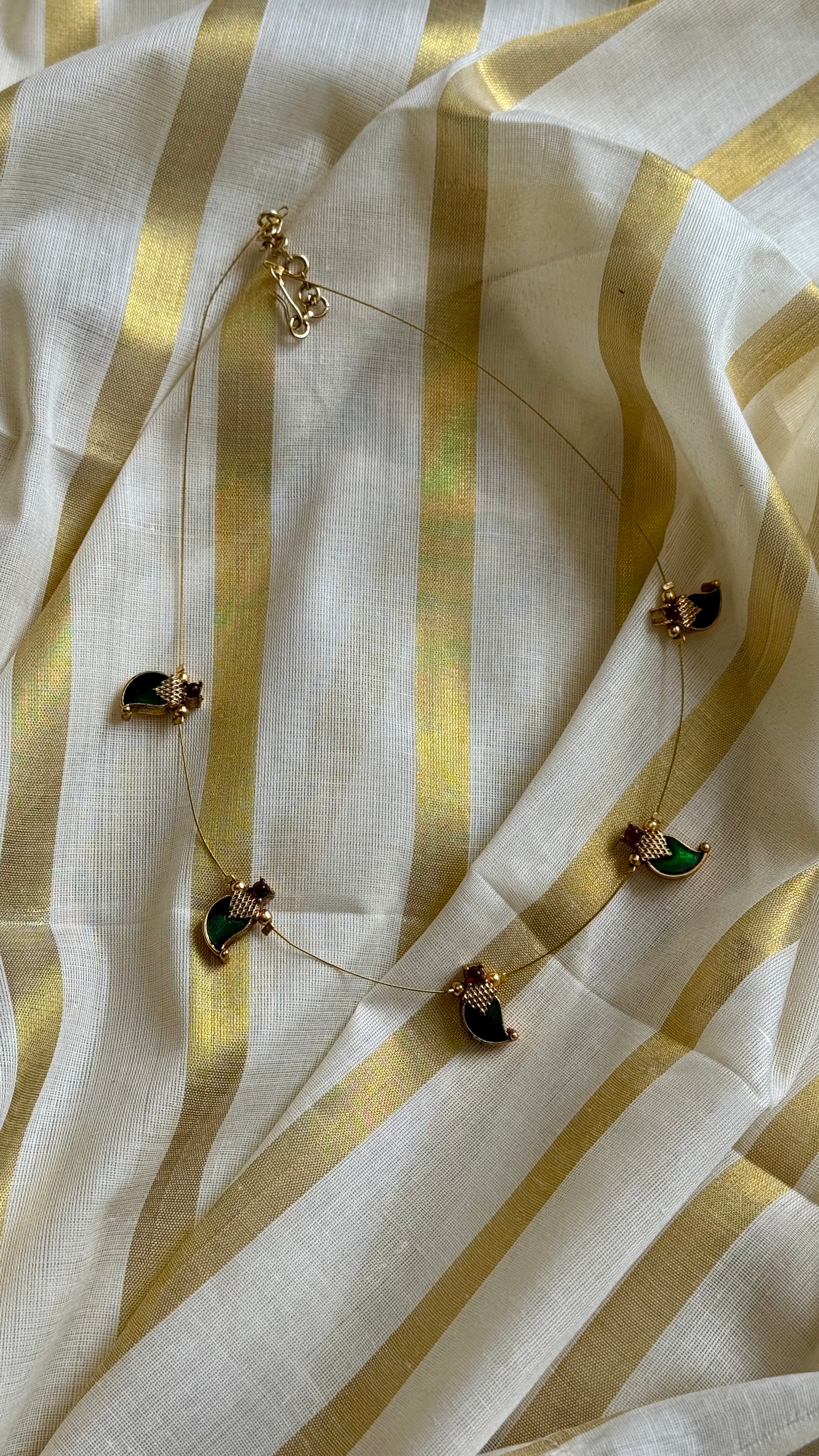 Small green palakka pendants on an invisible chain. Light, elegant, and just right for your Onam sarees.