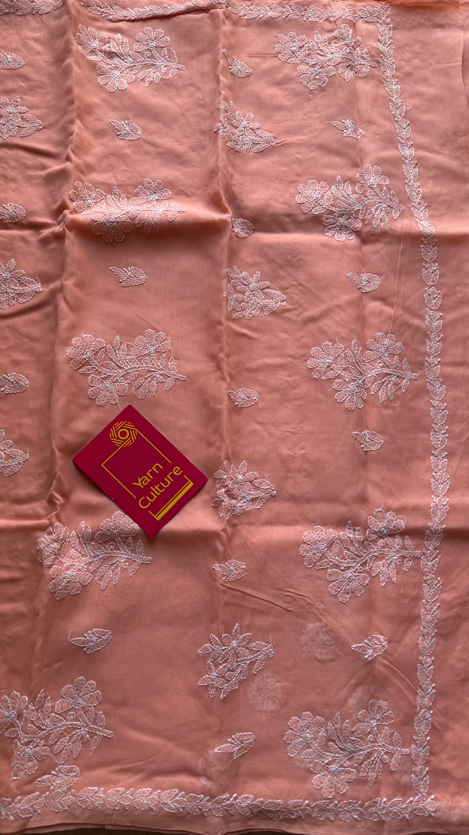 Sukun - musk, light peach hand-embroidered chikankari cotton saree - YCLCKFE425