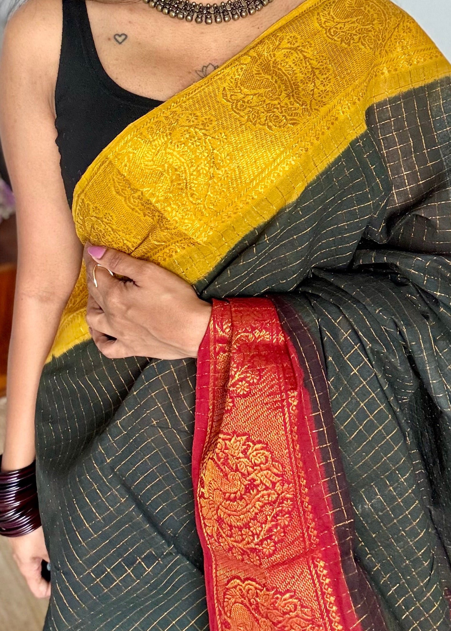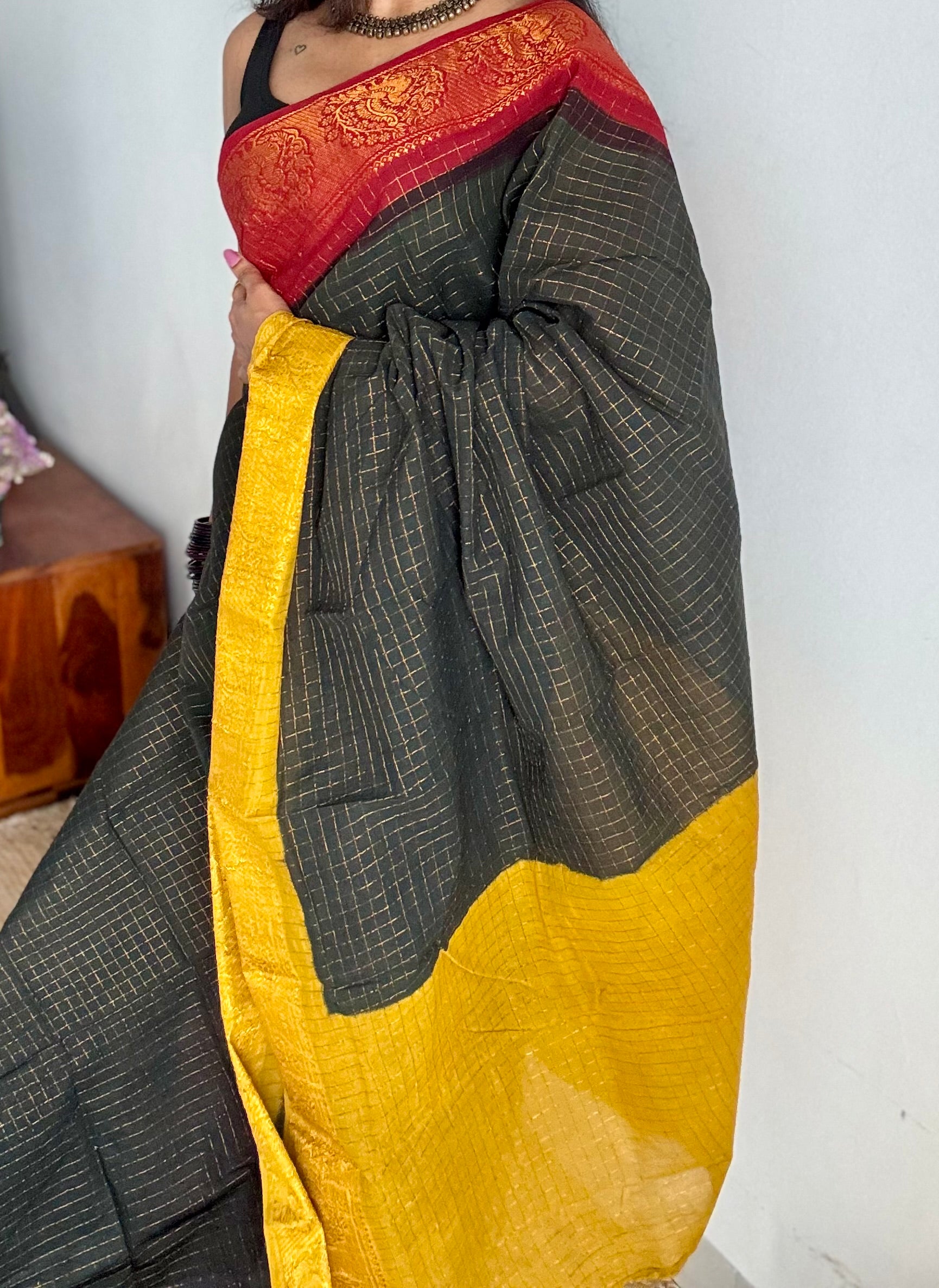 A black checkered Ganga Yamuna saree with one border in red and the other in yellow with peacock floral motifs. Both sides have contrast coloured pallus making it a versatile and unique piece.