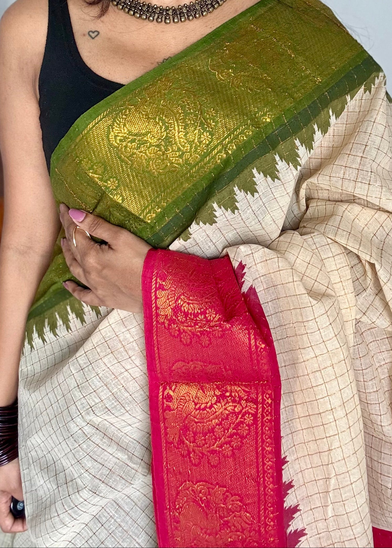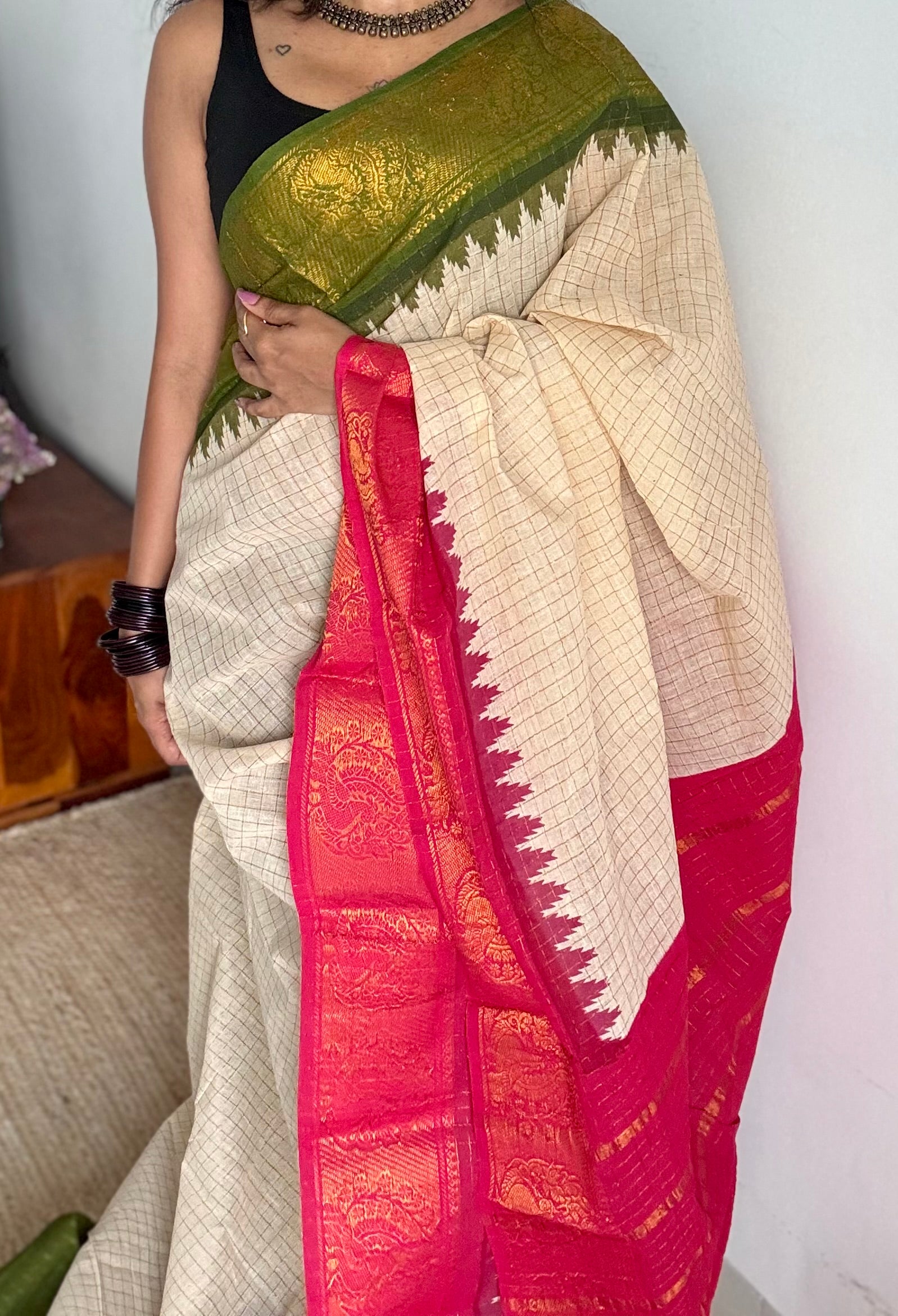 An ivory checkered Ganga Yamuna saree with one border in red, the other in green with peacock motifs. Both sides have contrast coloured pallus making it a versatile and unique piece.