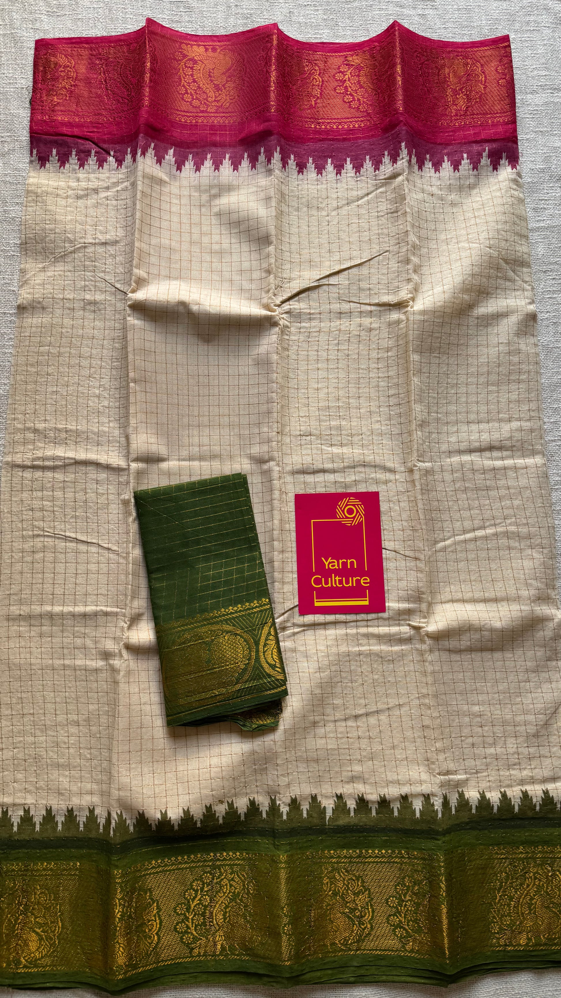 Sungudi cotton checks, ivory gold base, green and red dual tone border, soft cotton - YCCOTNGJJA176