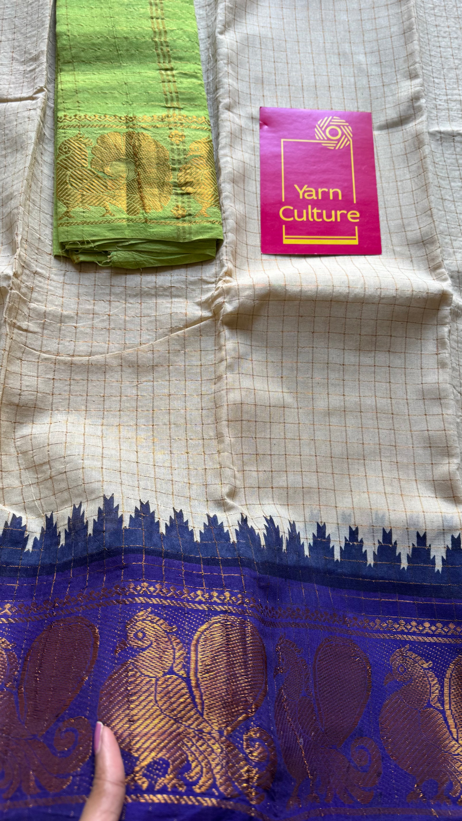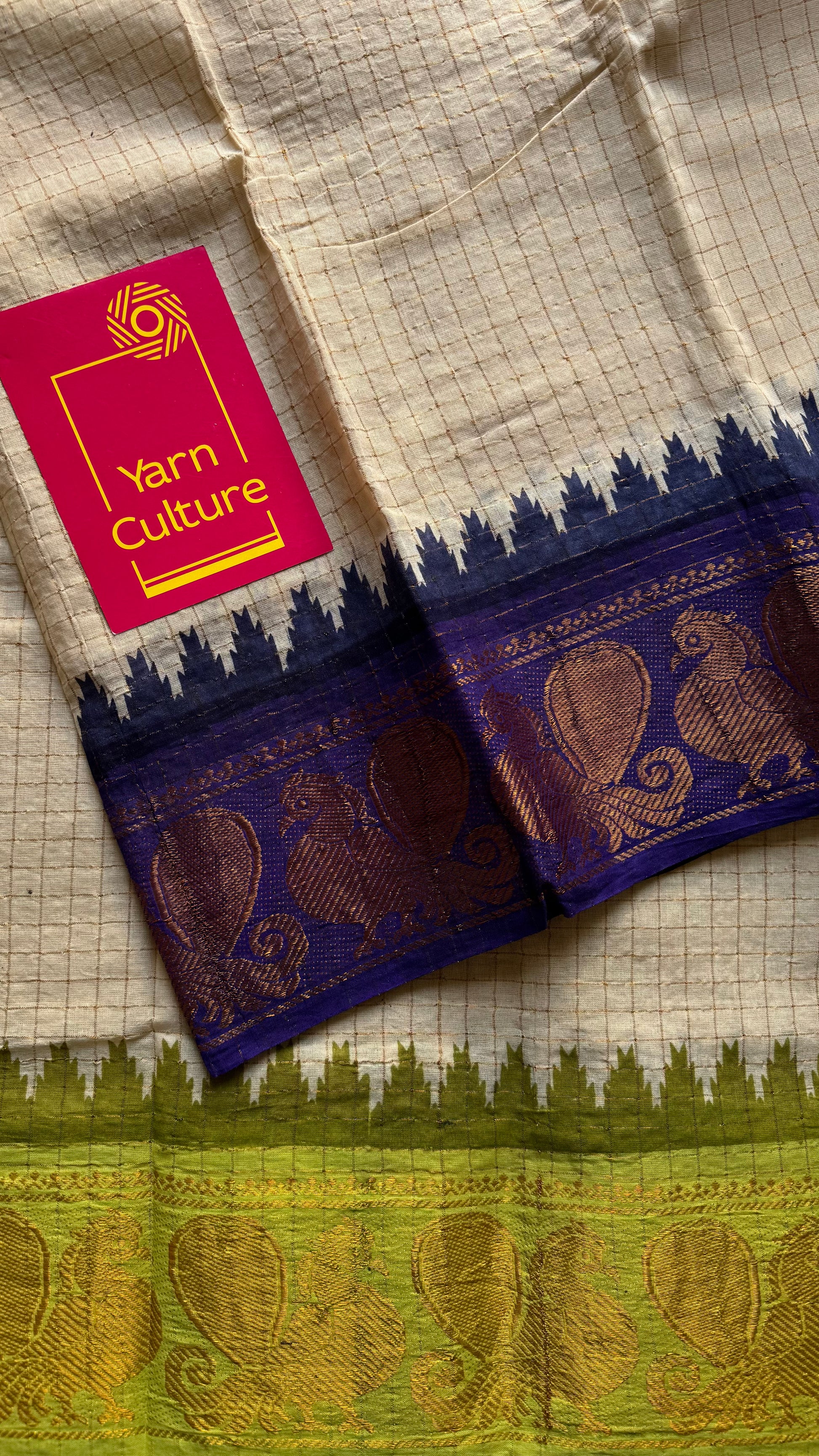 Sungudi cotton checks, ivory gold base, purple and neon green dual tone border, soft cotton - YCCOTNGJJA178