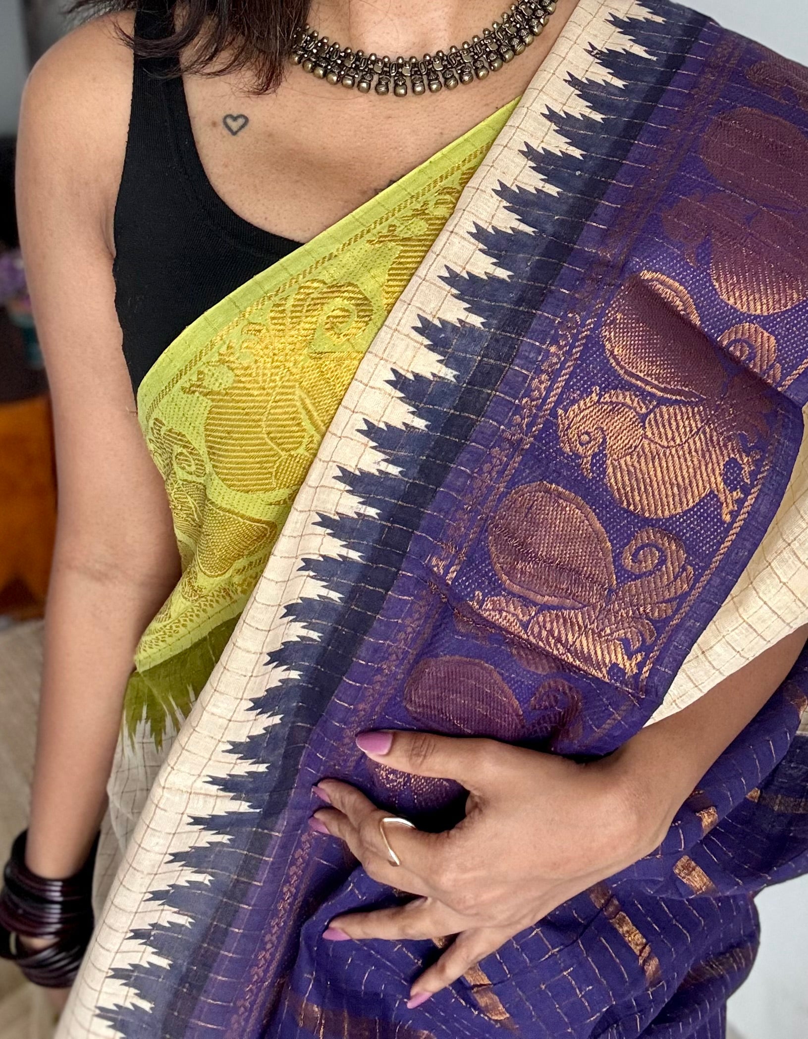 An ivory checkered Ganga Yamuna saree with one border in purple and the other in neon green with peacock motifs. Both sides have contrast coloured pallus making it a versatile and unique piece.