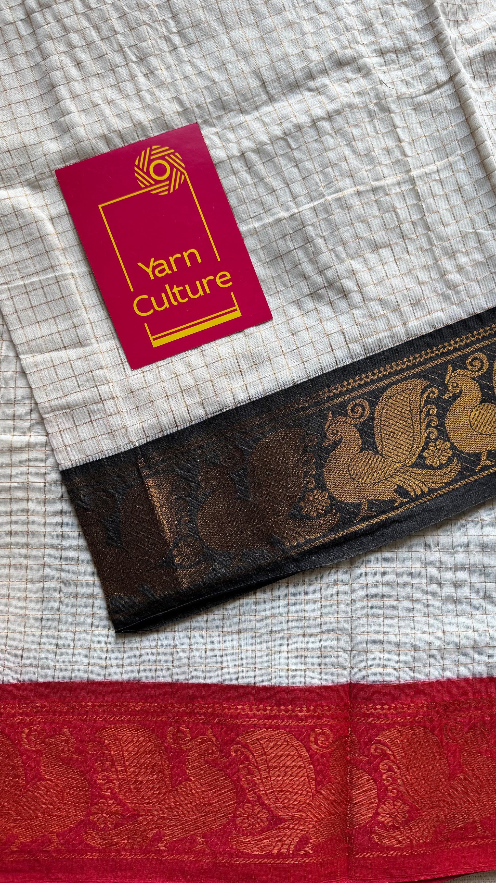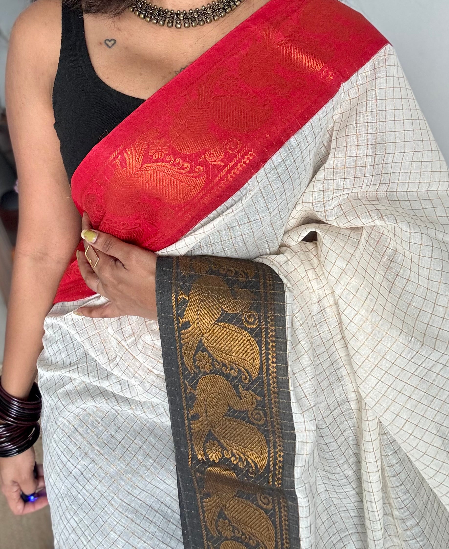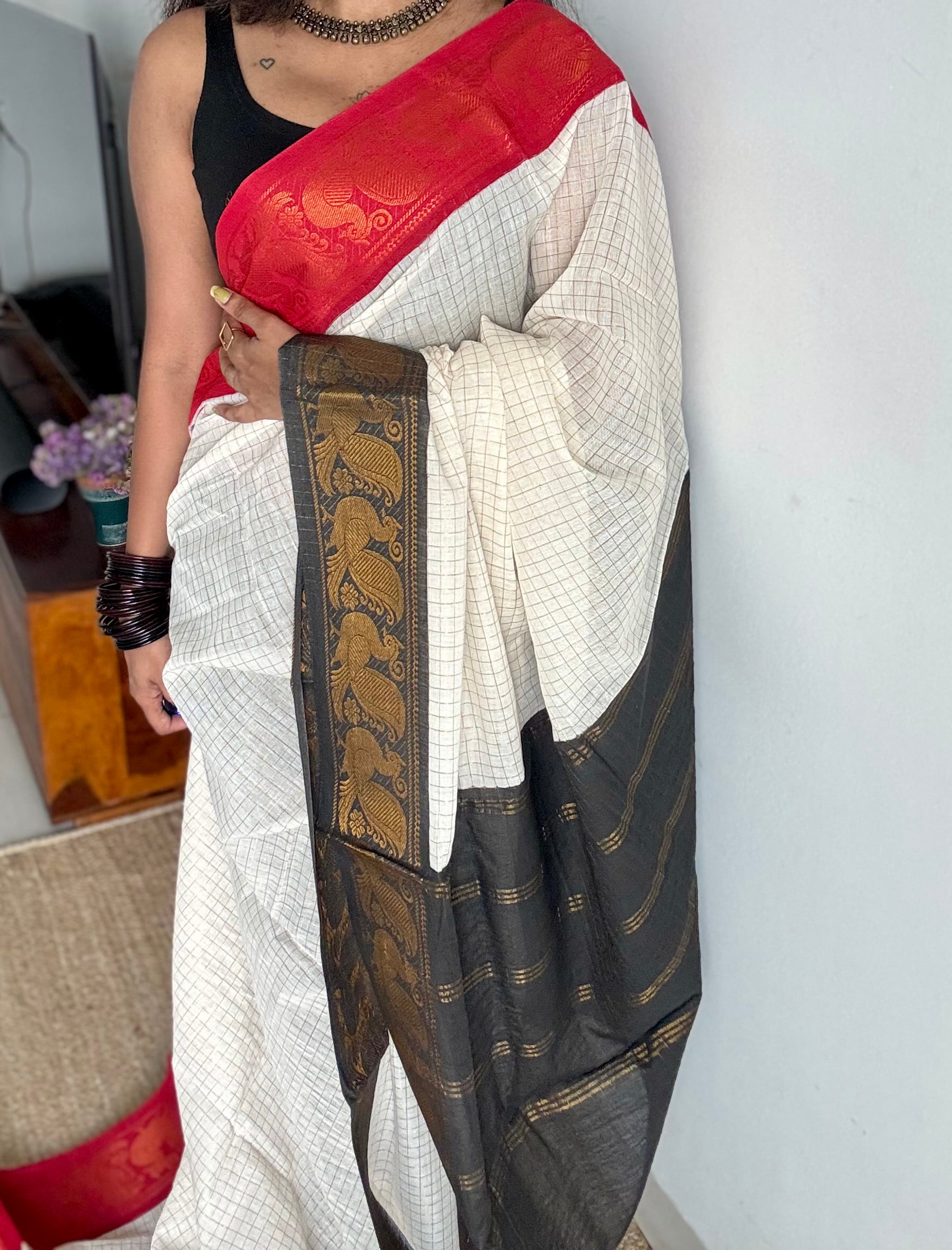 An ivory checkered Ganga Yamuna saree with one border in red, the other in black with peacock motifs.