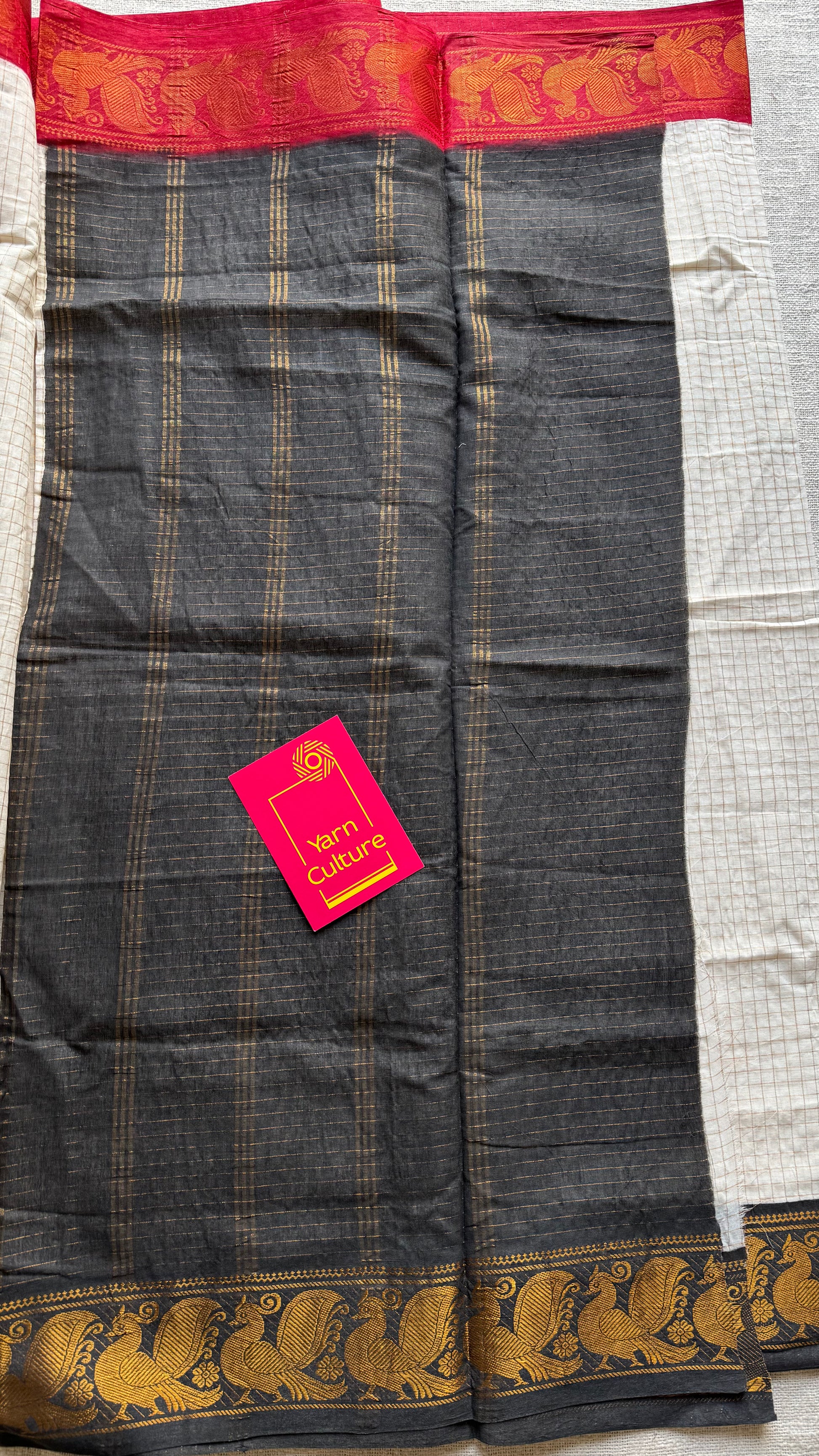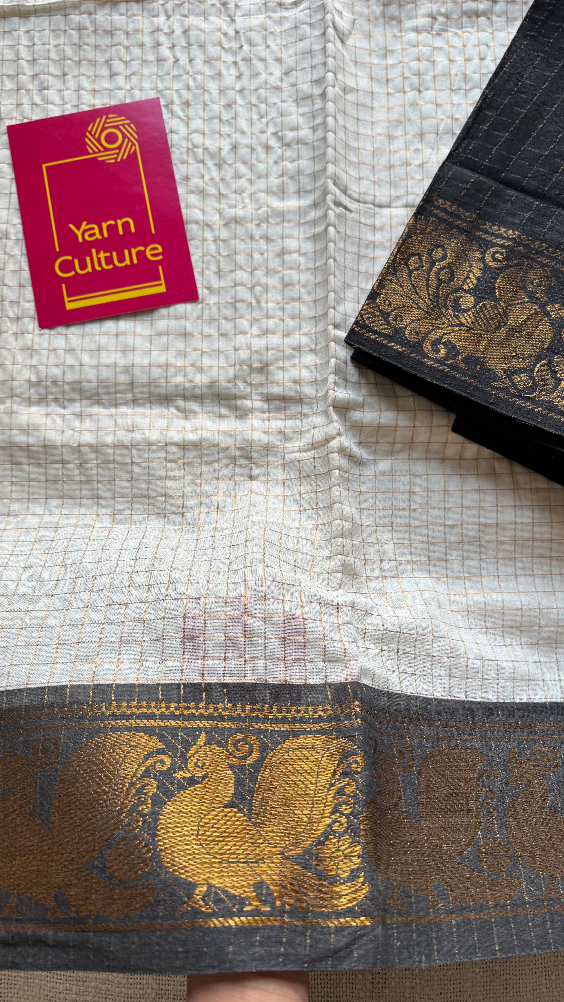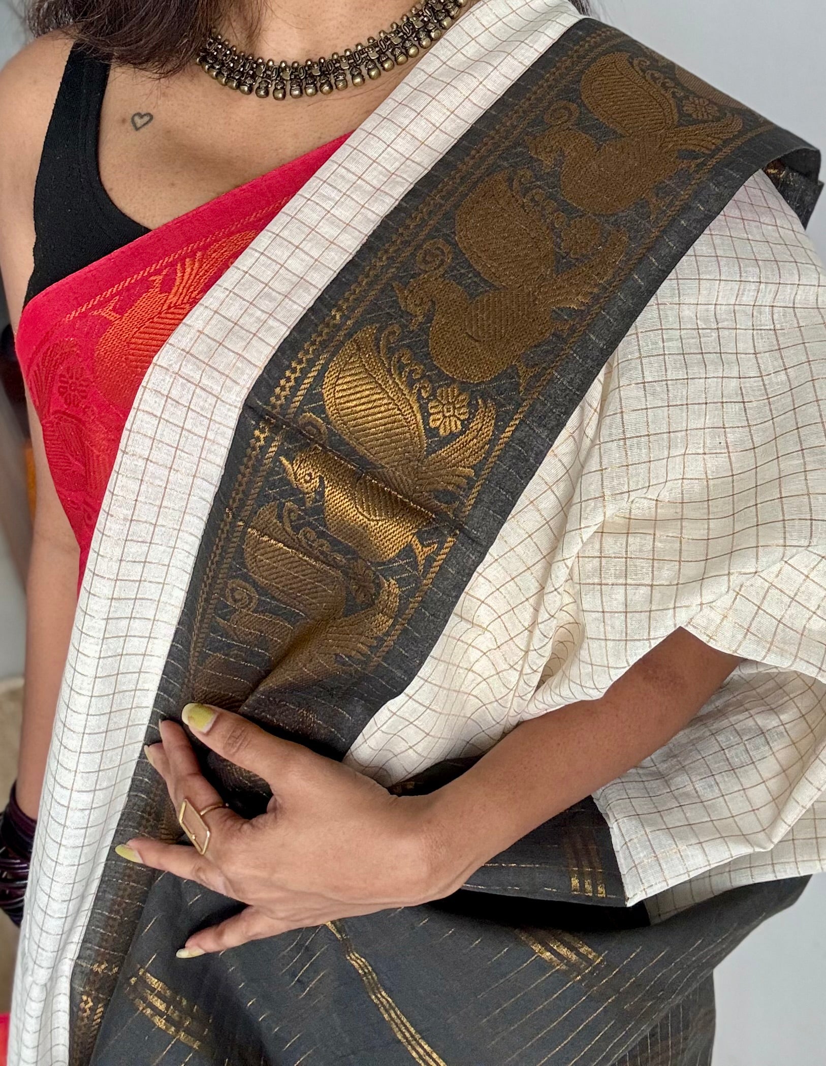 An ivory checkered Ganga Yamuna saree with one border in red, the other in black with peacock motifs.