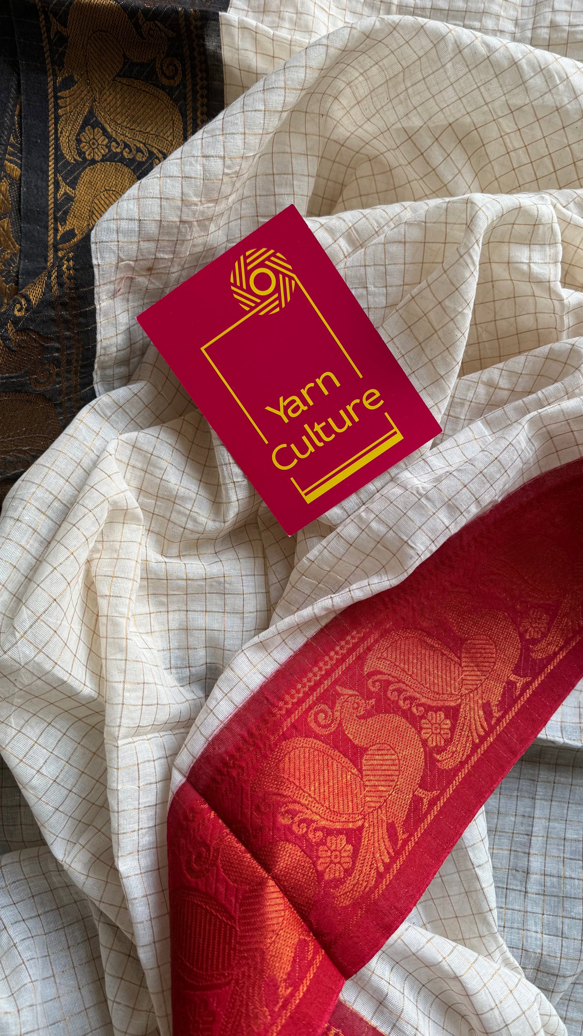 Sungudi cotton checks, ivory gold base, red and black dual tone border, soft cotton - YCCOTNGJJA159