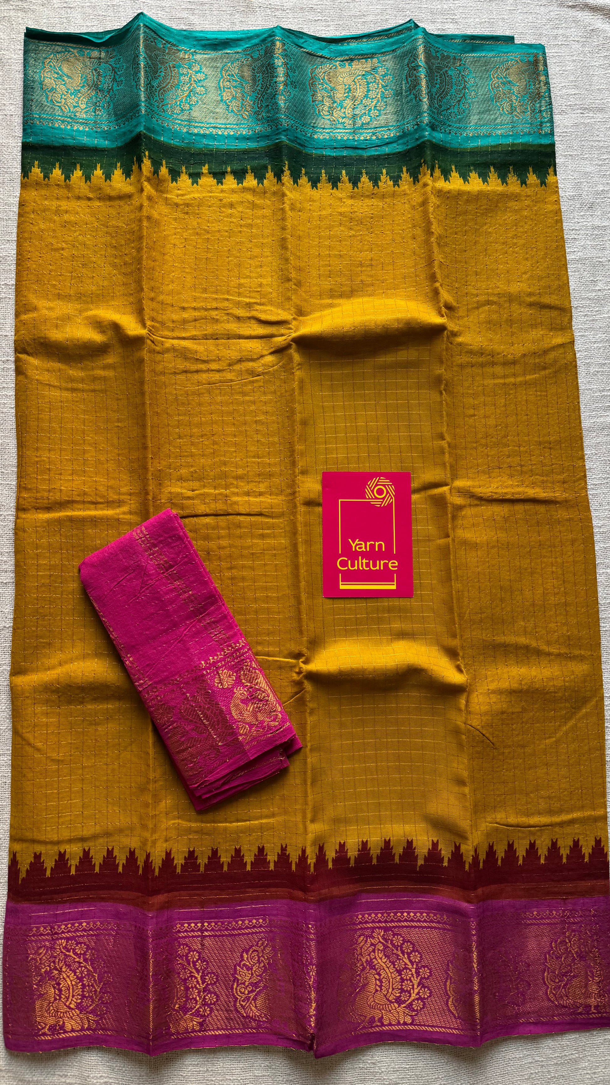 Sungudi cotton checks, mustard yellow base, turquoise and magenta dual tone border, soft cotton - YCCOTNGJJA179