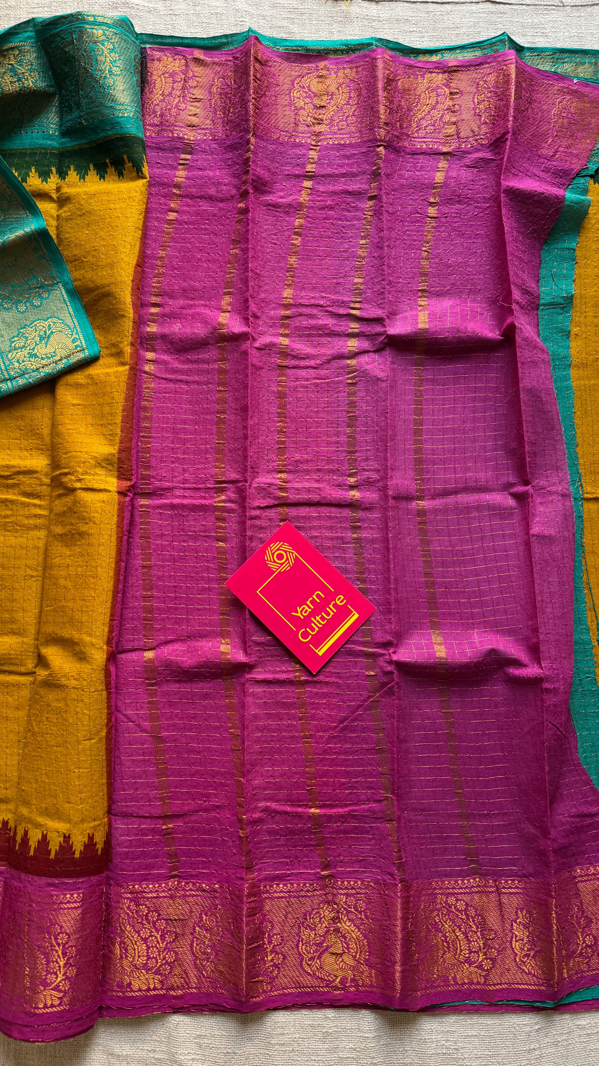 A mustard yellow checkered Ganga Yamuna saree with one border in turquoise and the other in magenta with peacock motifs. Both sides have contrast coloured pallus making it a versatile and unique piece.