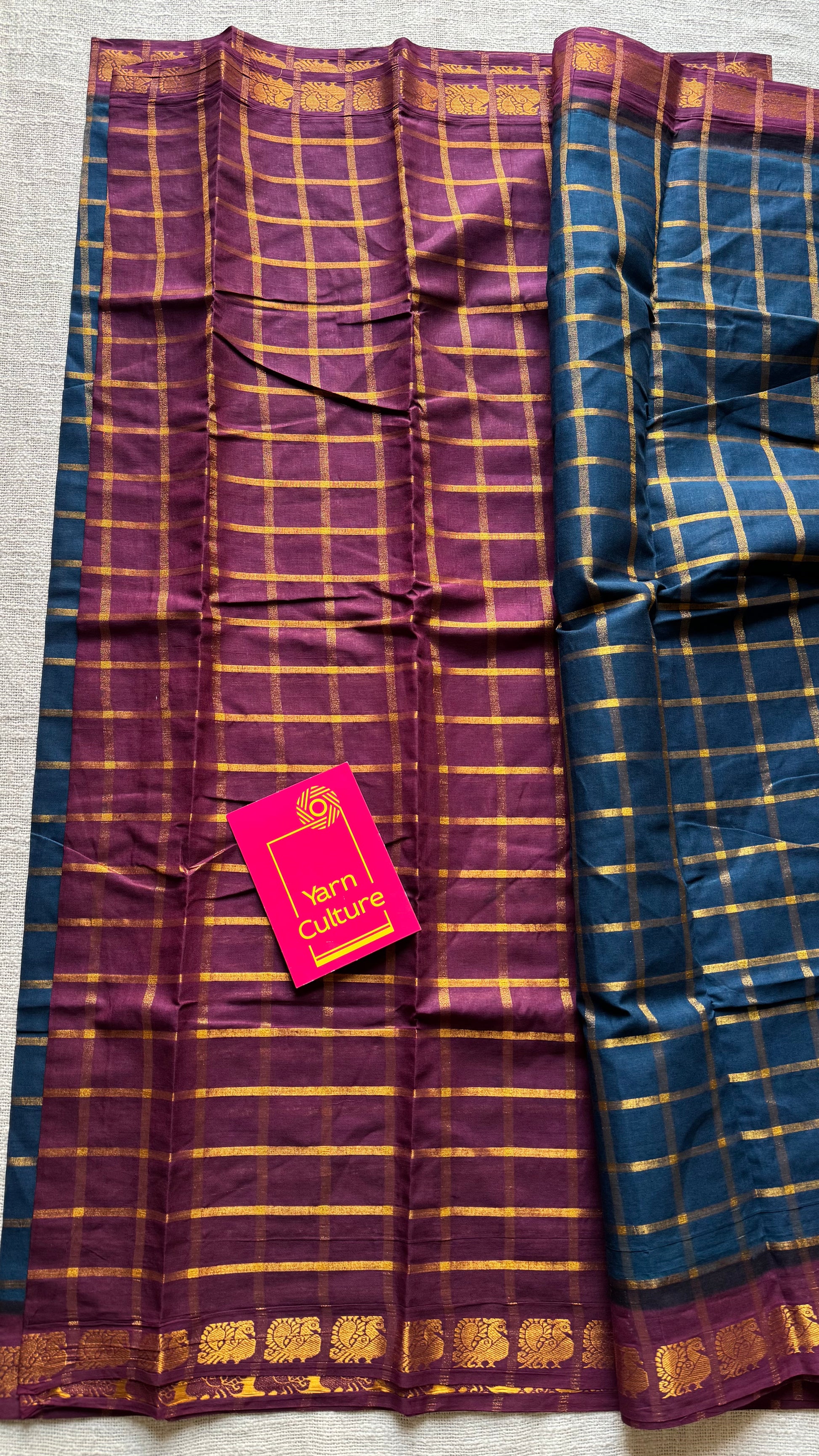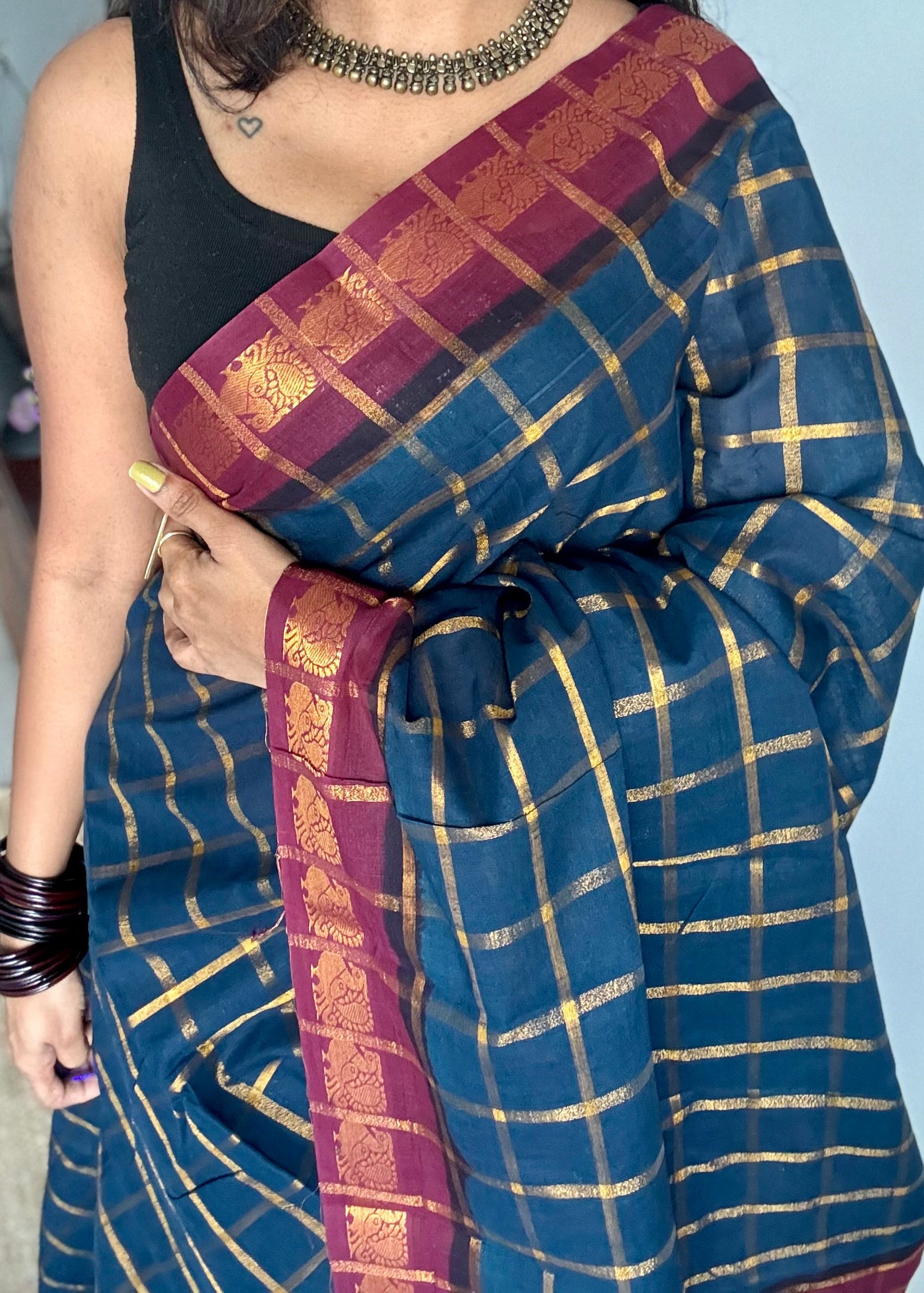 Teal blue with maroon pavithra kattam sungudi, madurai cotton, peacock motif border, with contrast coloured blouse fabric 💖