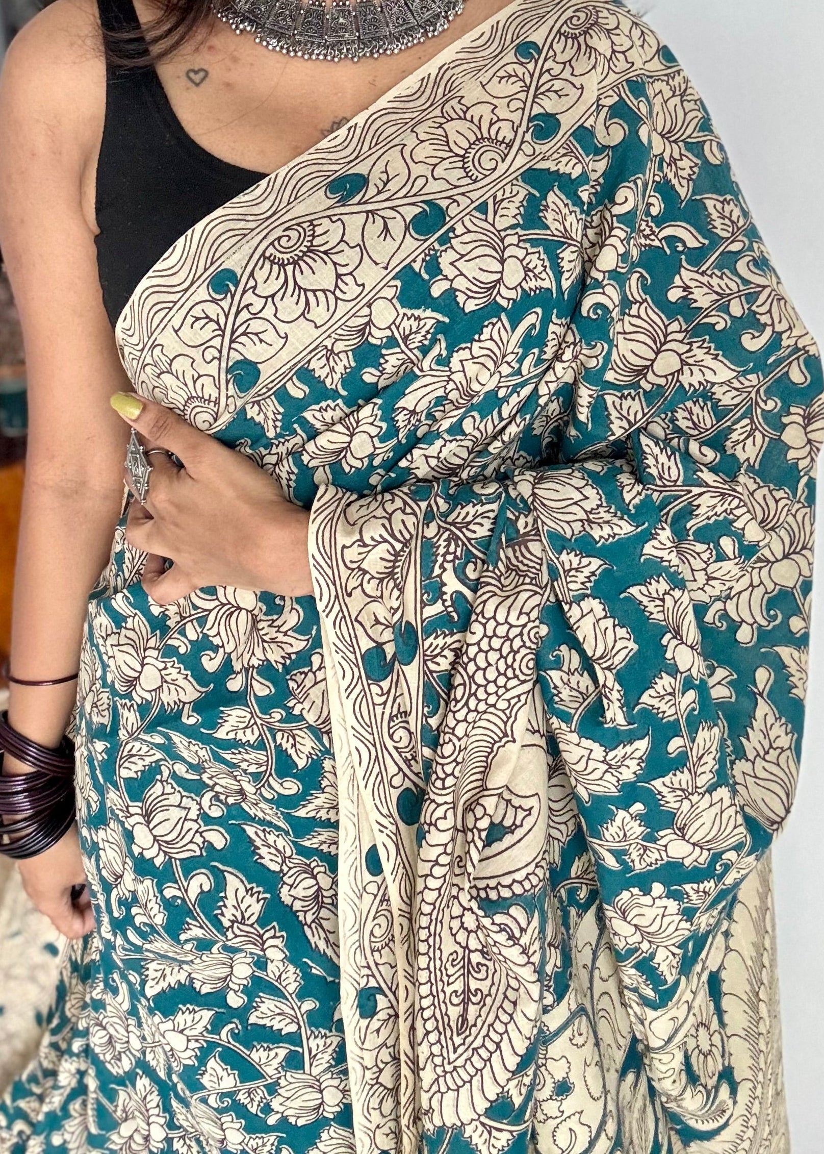Teal with beige kalamkari, floral vines, soft cotton. Comes with running blouse in a contrast colour.