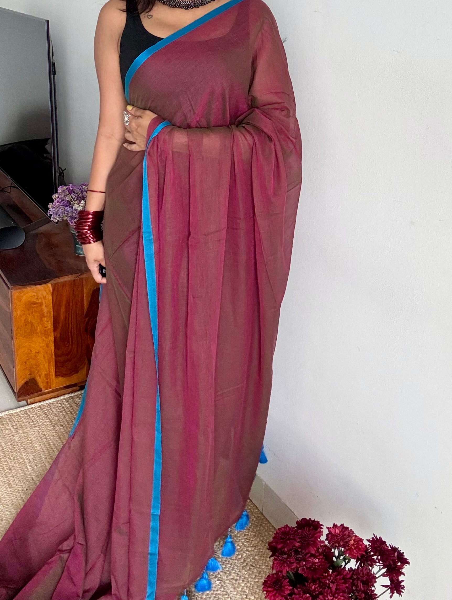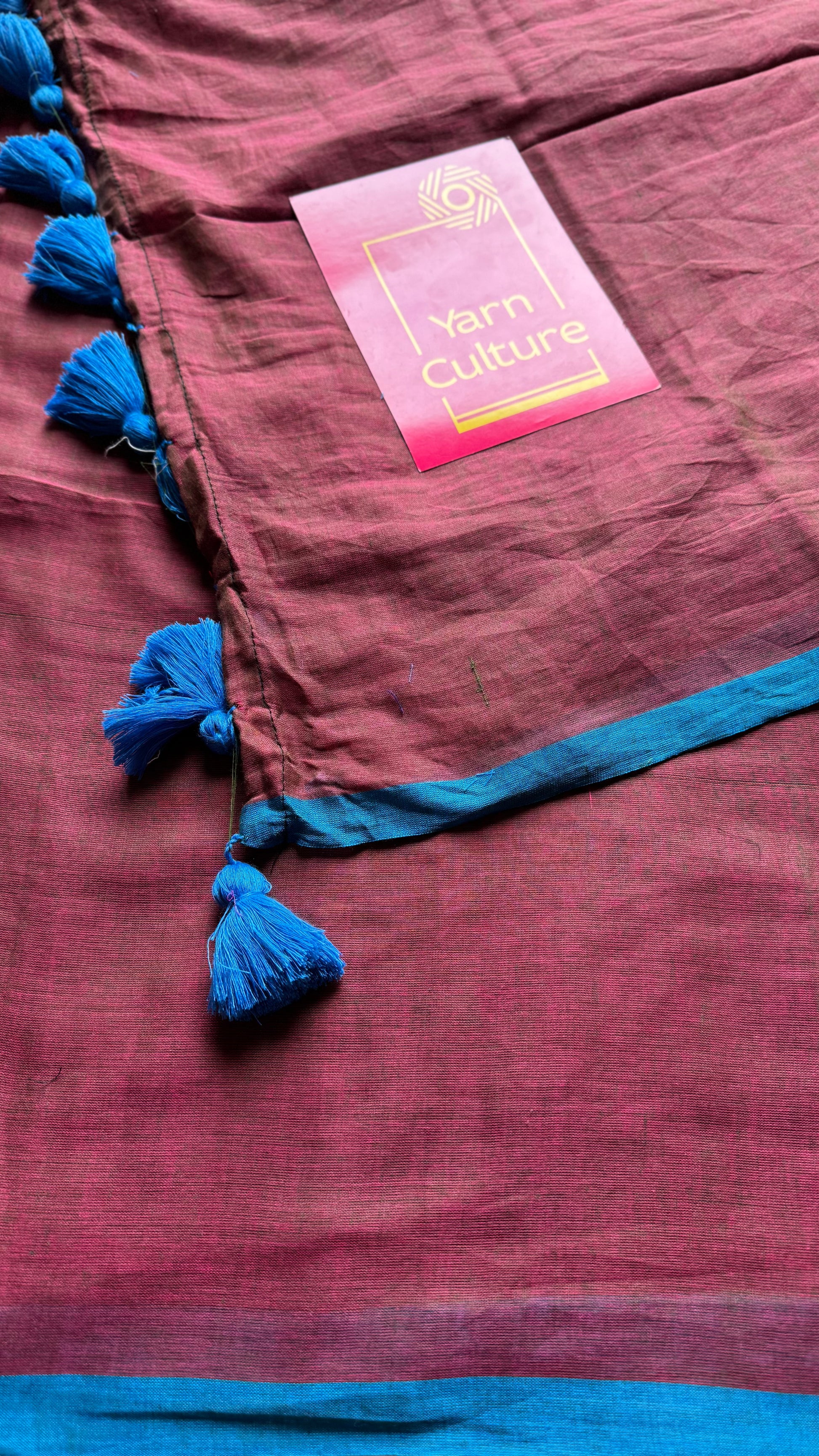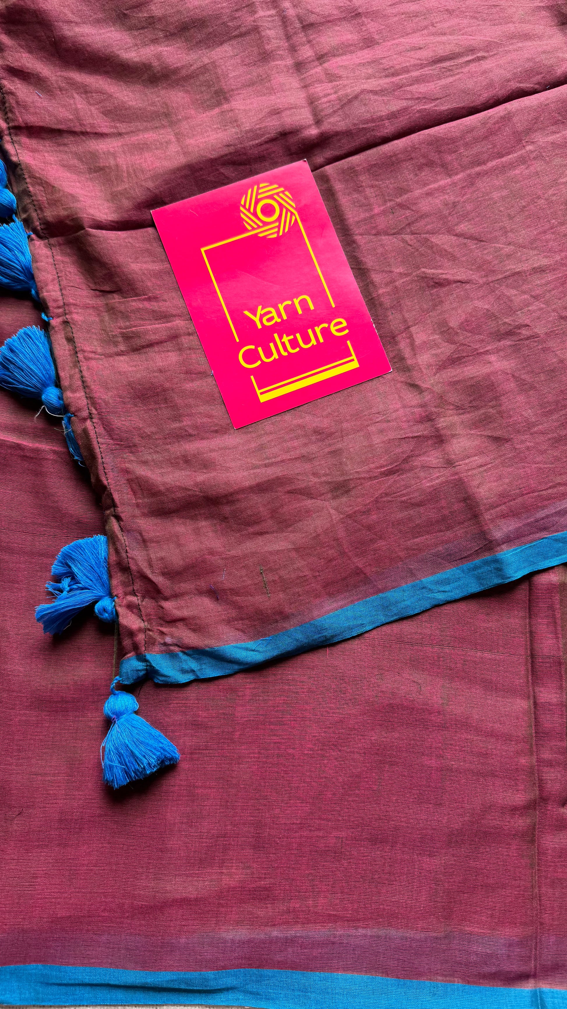 A beautiful terracotta brownwith pink double shade mul cotton saree highlighted with a contrasting Persian blue border. Lightweight, breathable, and soft, it is perfect for summer wear, everyday styling, and effortless draping.