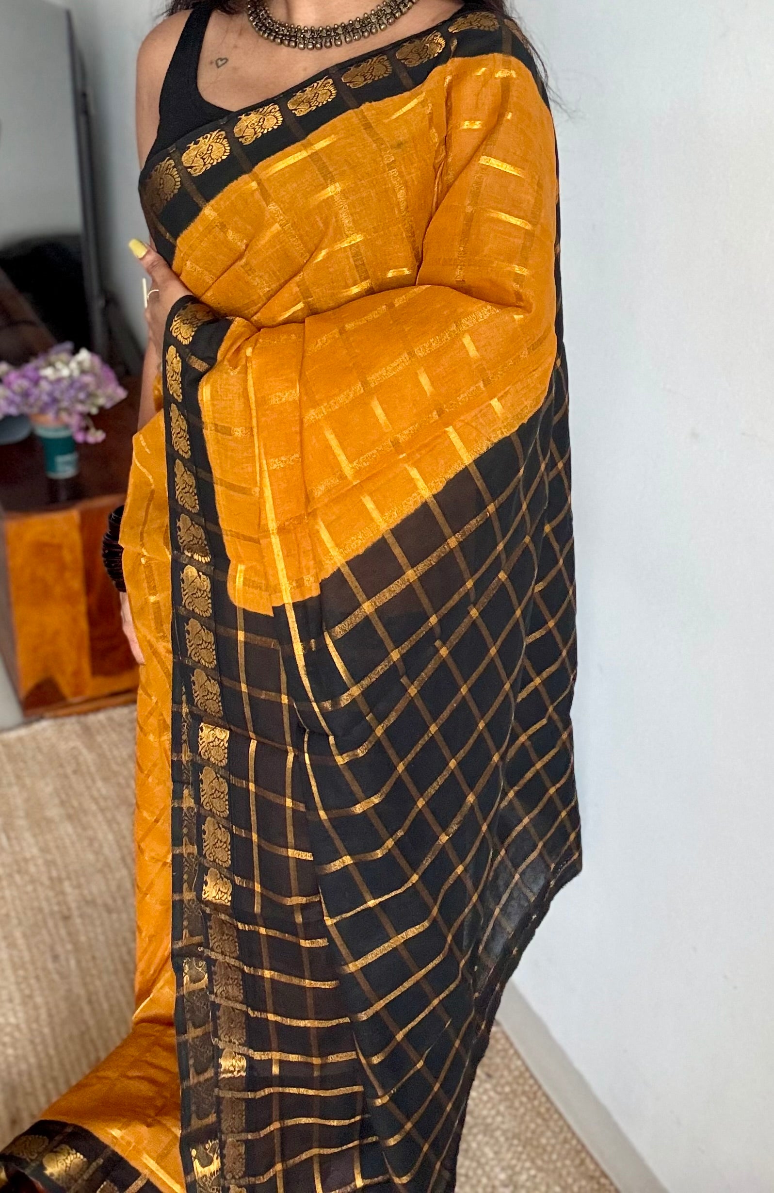 Turmeric yellow with black pavithra kattam sungudi, madurai cotton, peacock motif border, with contrast coloured blouse fabric 💖