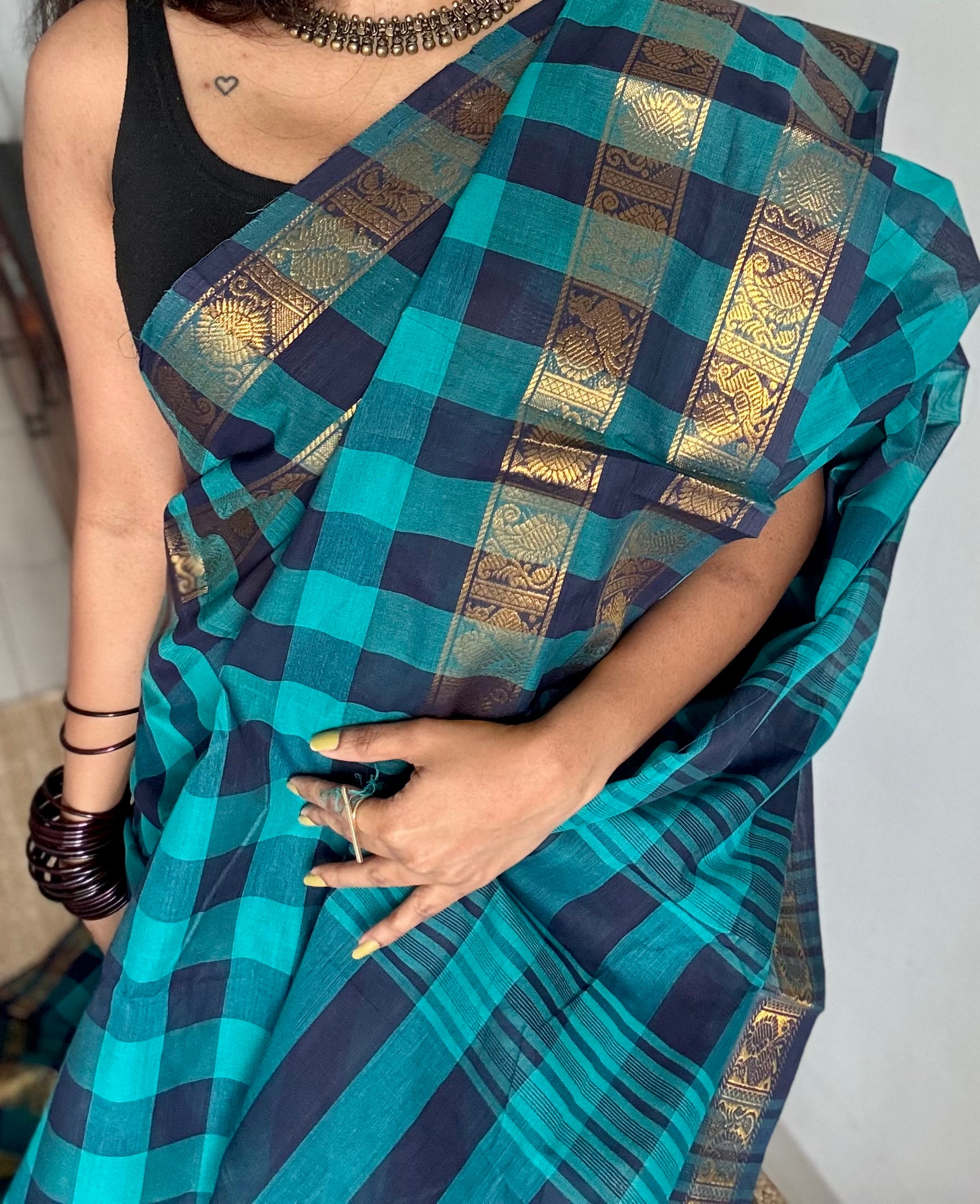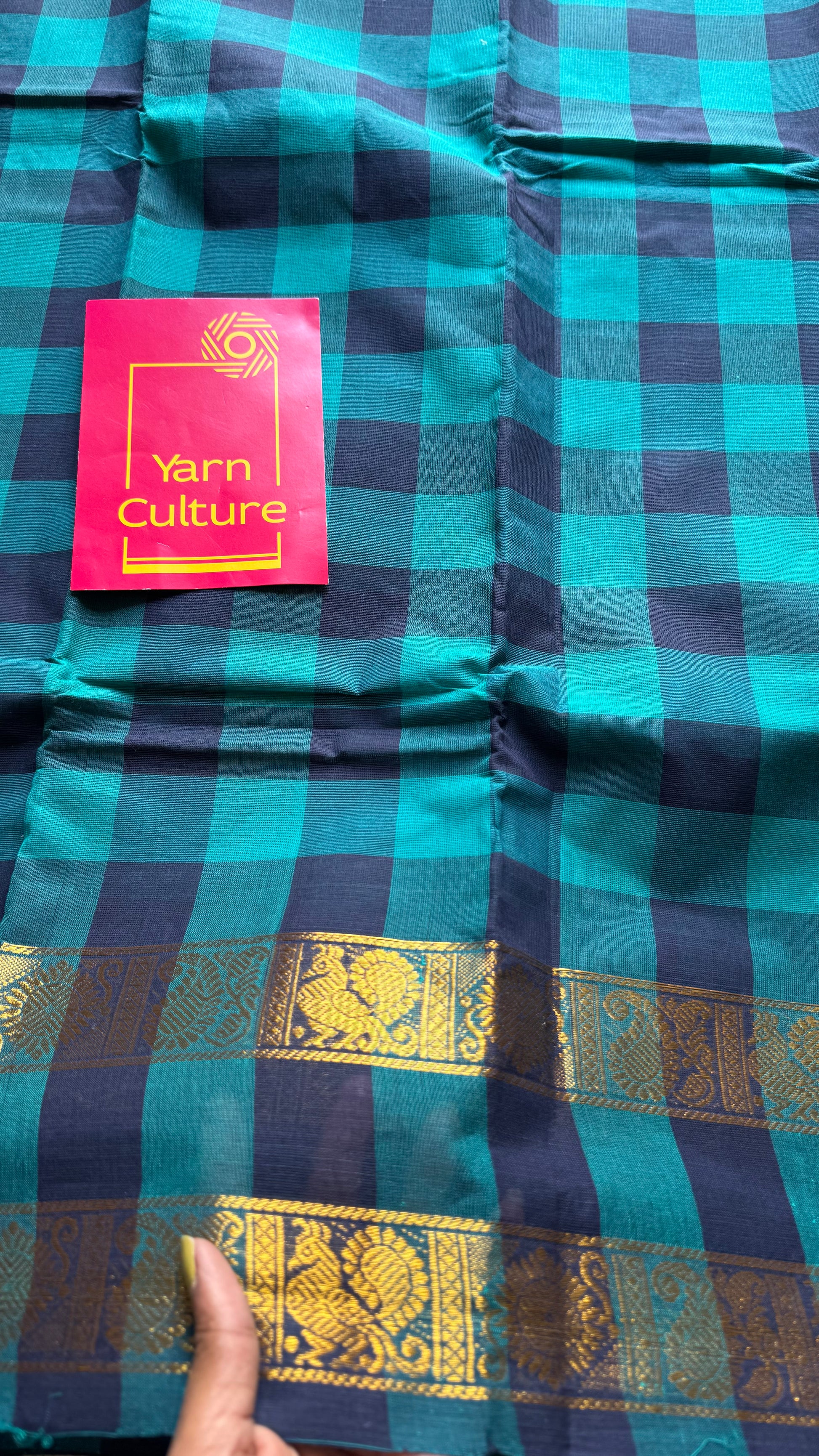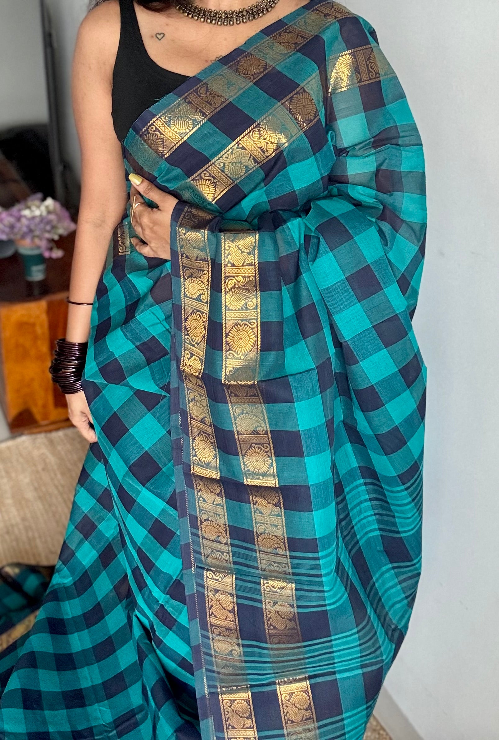 Turquoise and dark blue paalum pazhamum checkered kanchi cotton, peacock zari double border, with additional contrast blouse.