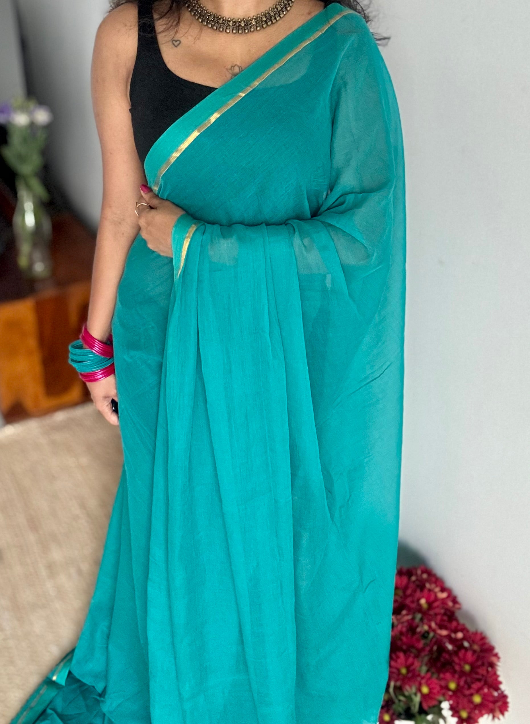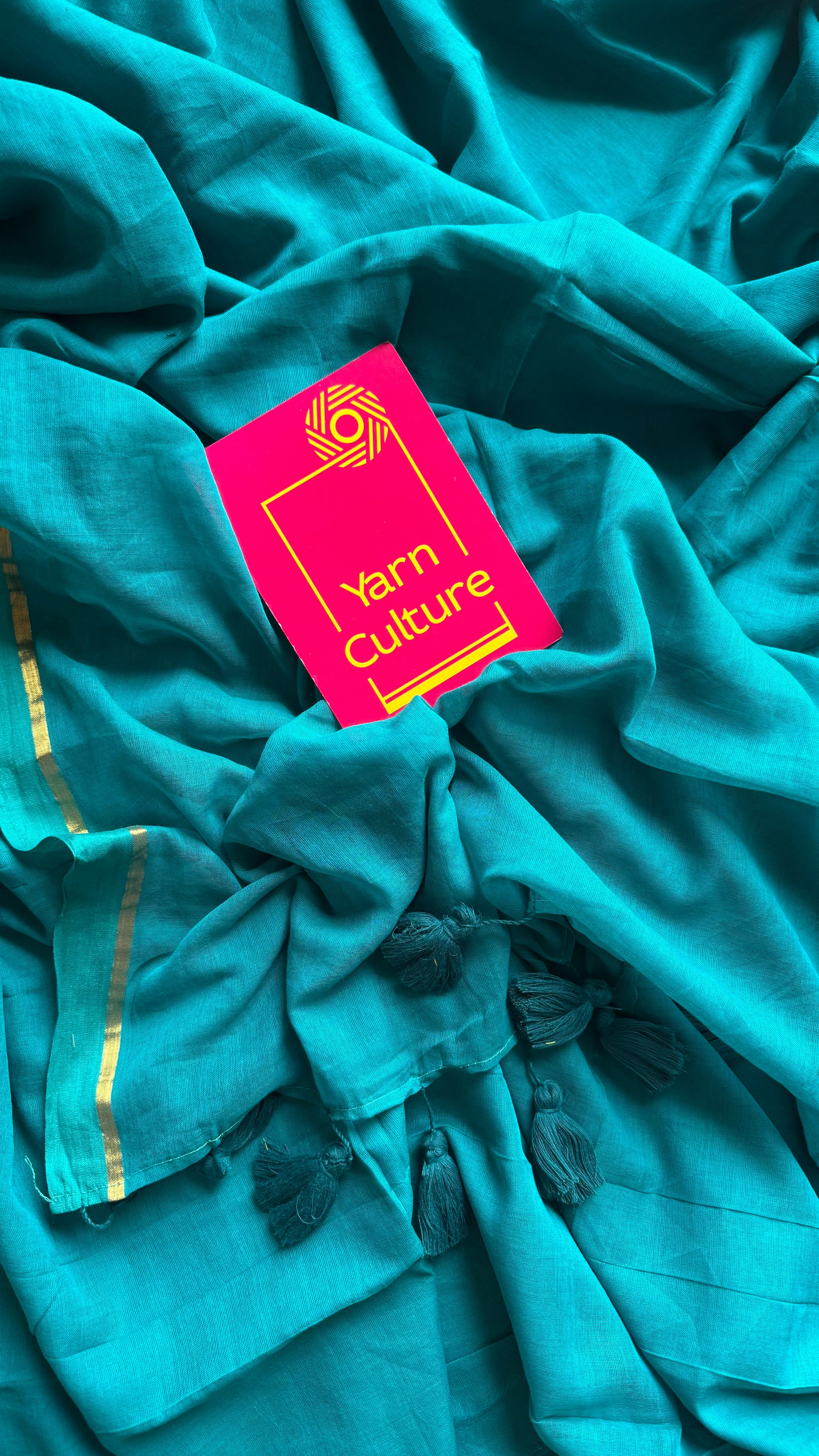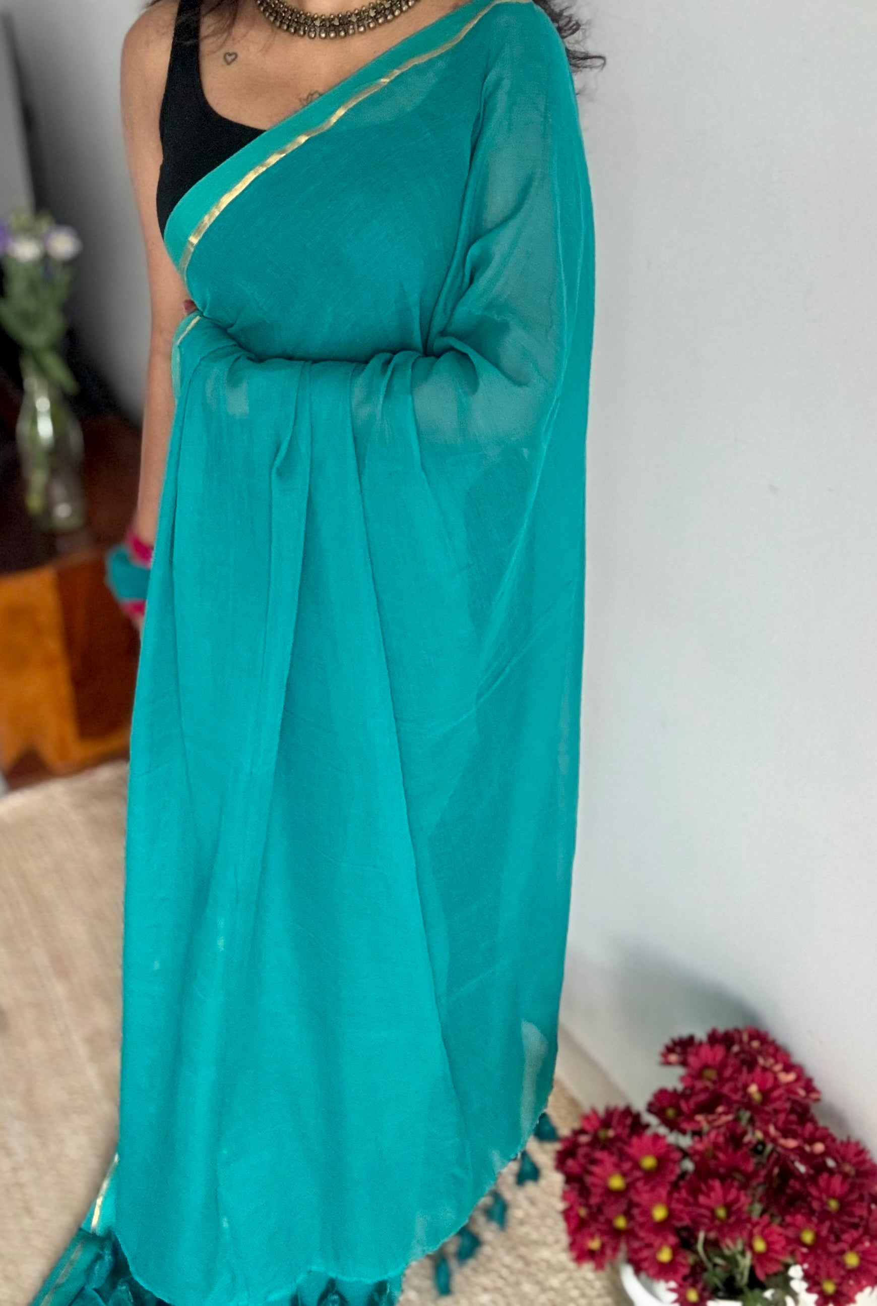 Everybody's favourite mul cotton in cyan blue with thin antique gold zari gap border and with tassels.