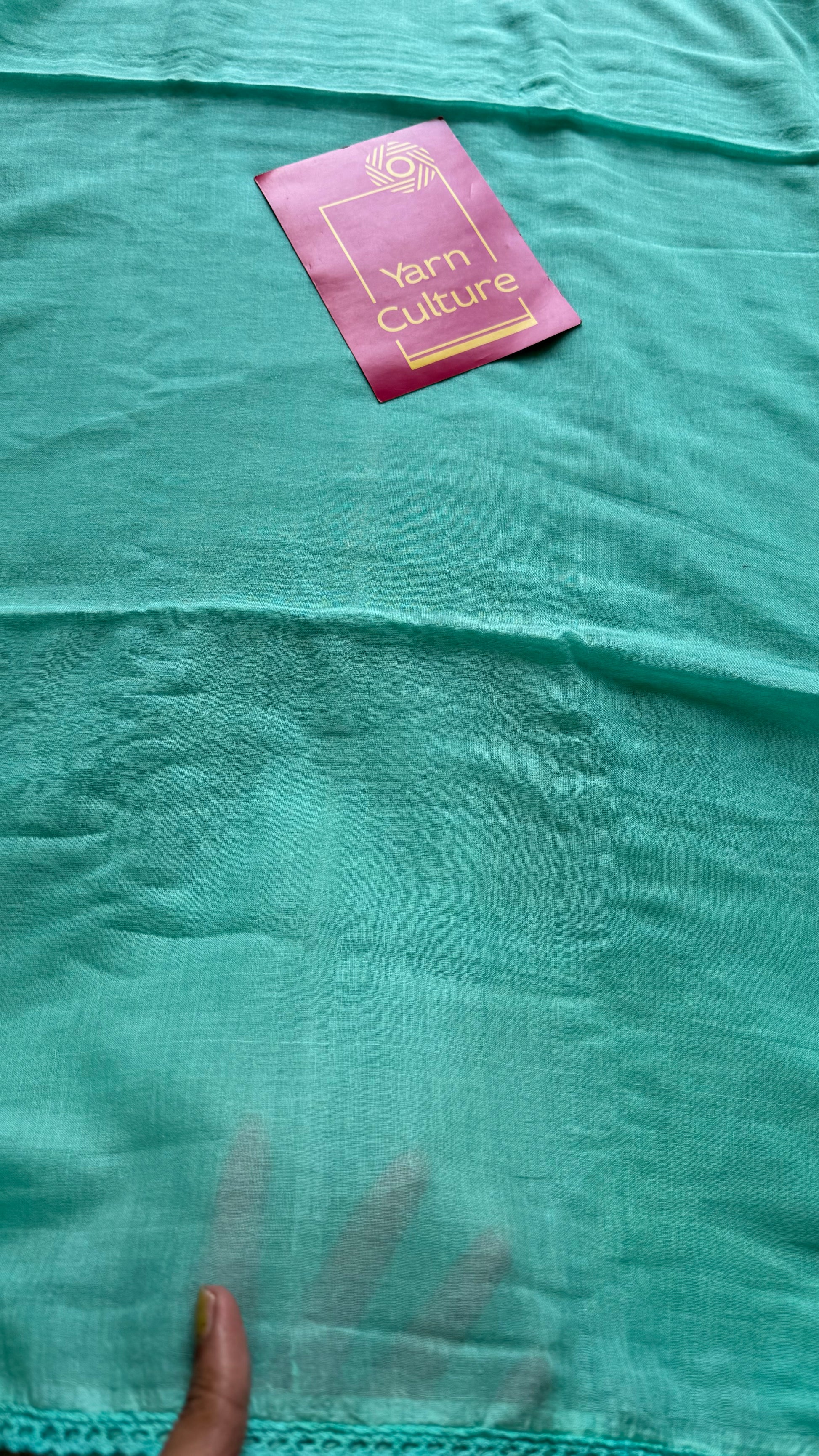 Everybody's favourite mul cotton in solid tone with a pretty lace border and tassels. This light turquoise drapes like a dream and keeps you cool through long days. Perfect for summer. Lightweight, easy to drape, breathable soft cotton.