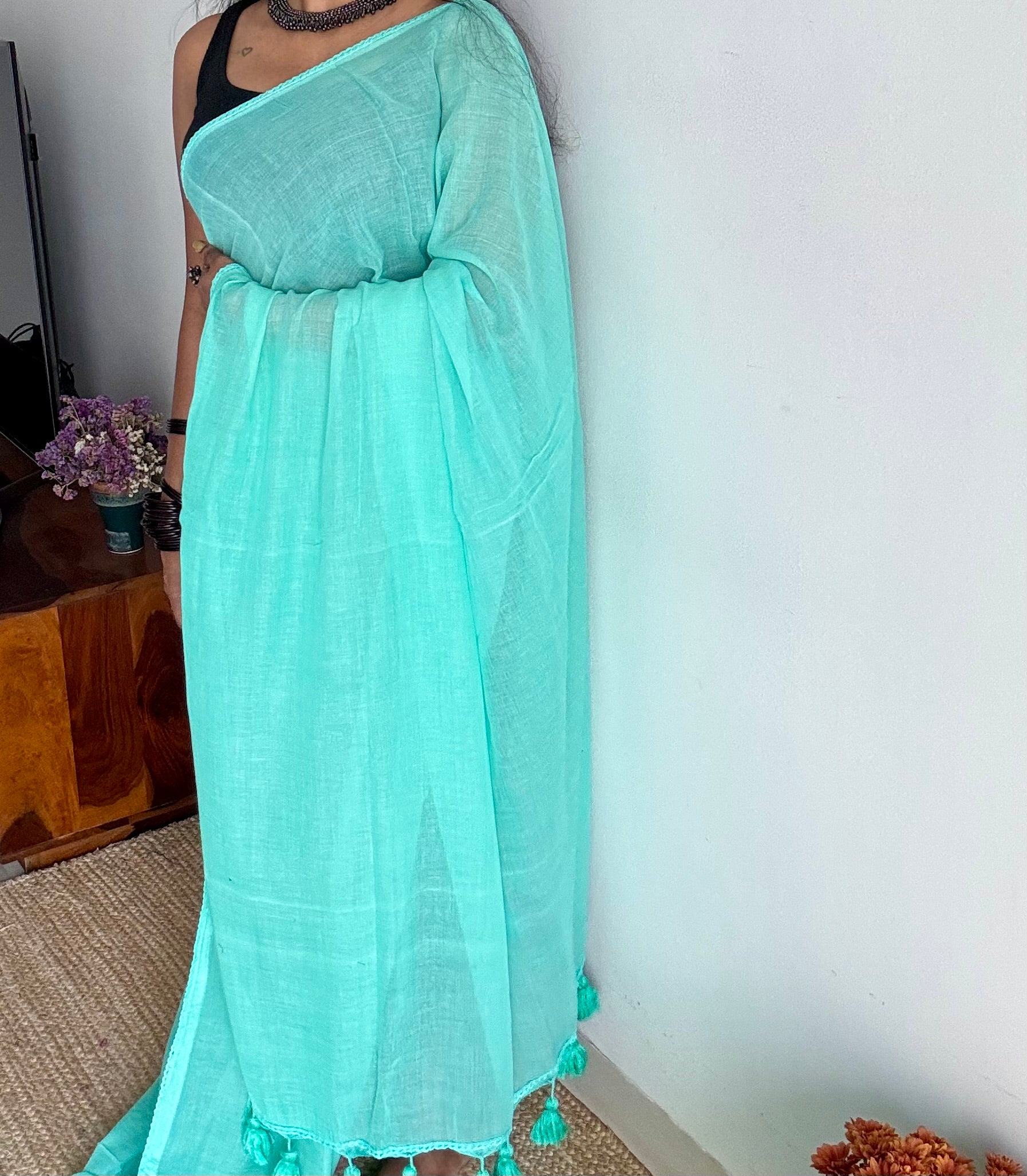 light turquoise mul cotton saree, pastel blue saree India, soft mul saree, breathable cotton saree, lightweight summer saree, minimal cotton saree, everyday saree India, plain mul saree, comfortable saree for daily wear, handloom mul saree, yarn culture saree