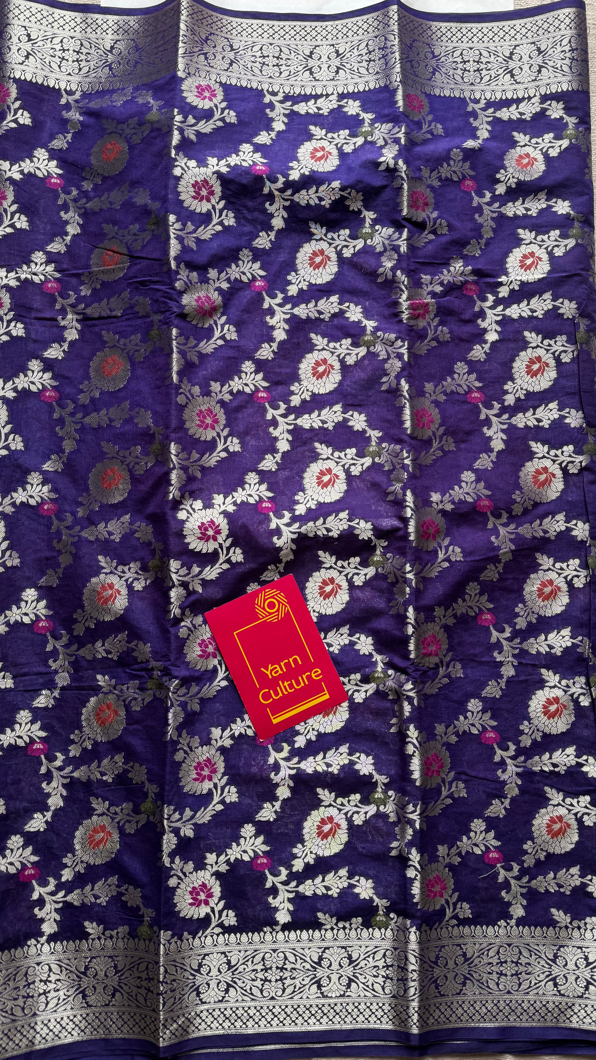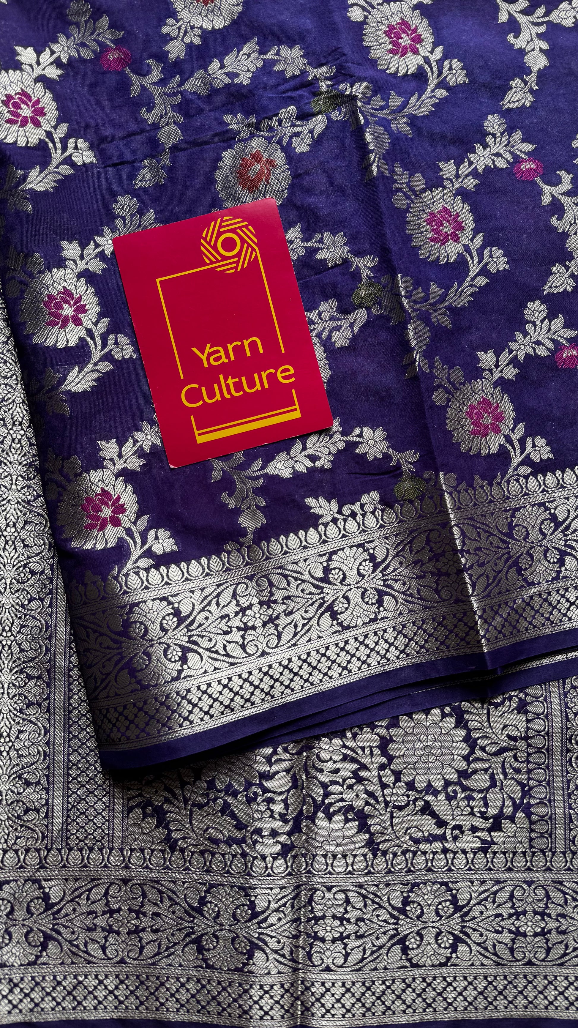 Dark blue meenakari floral pattern in silver zari, Banarasi katan dupion silk - YCDESE12