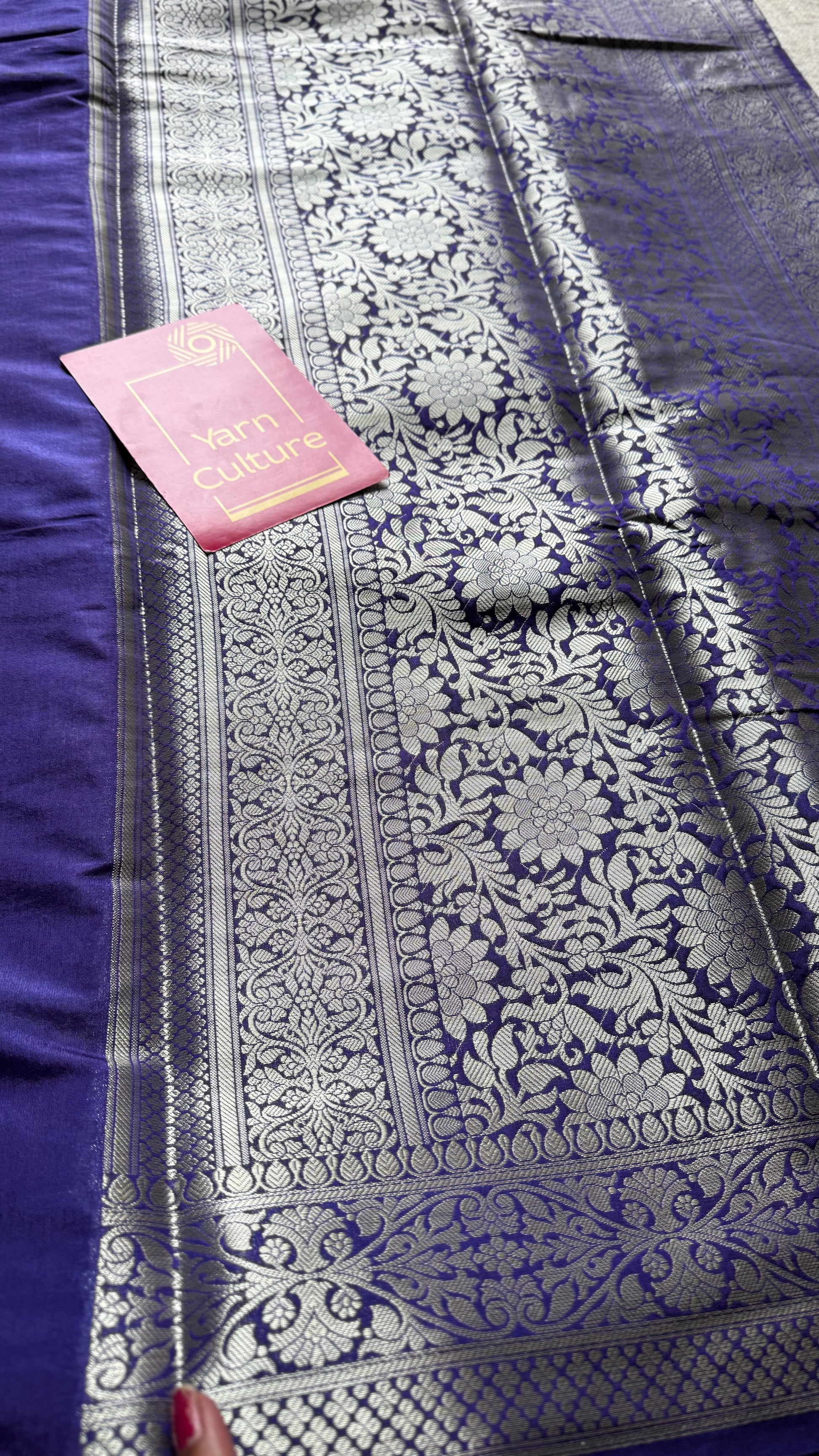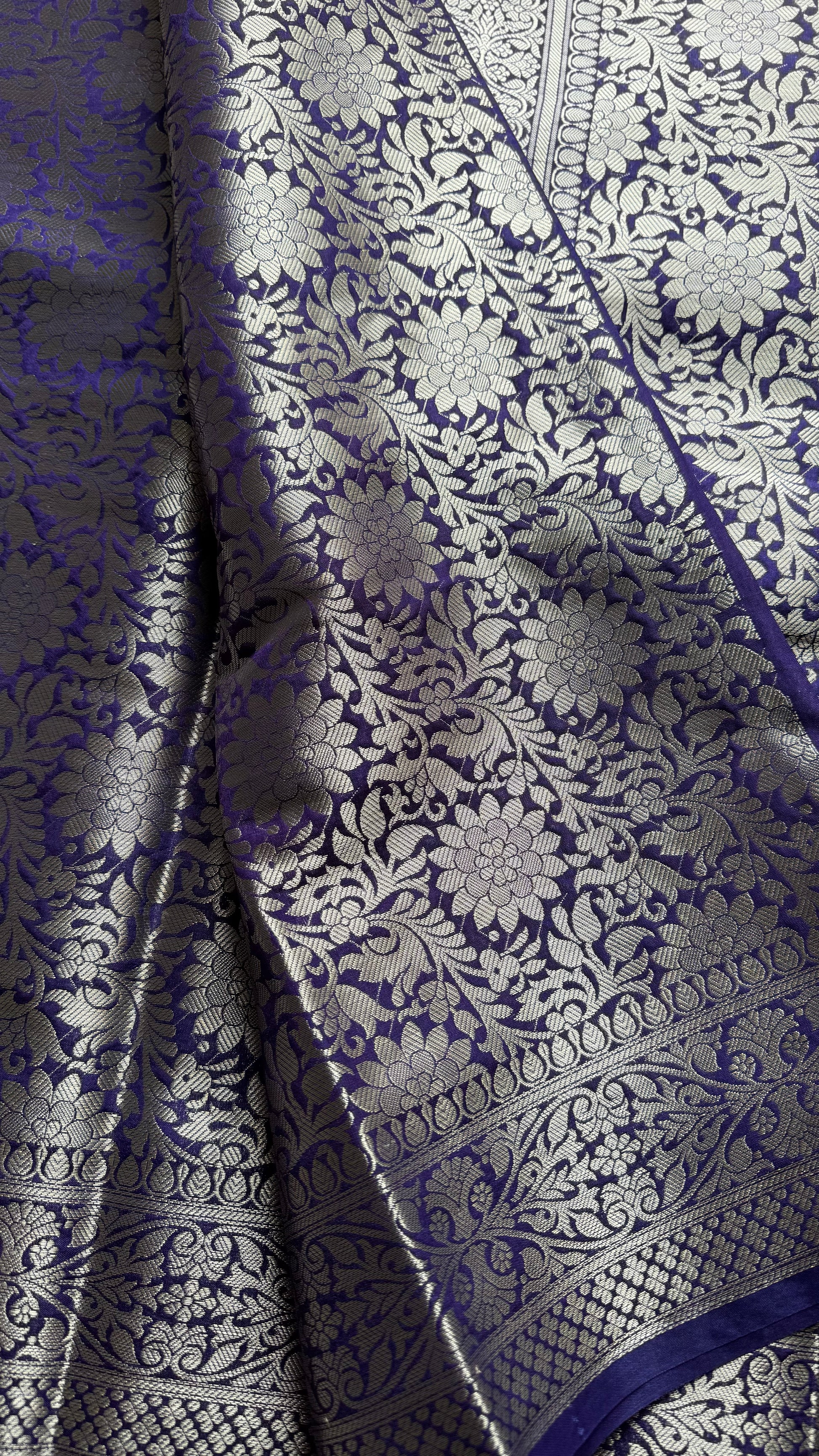 Dark blue Banarasi katan dupion silk with floral meenakari pattern in silver zari - festive, timeless, and perfect for Diwali. Intricate pallu and blouse fabric. Effortless to drape, light to carry, and rich in look, this is a saree made to shine with you this season.