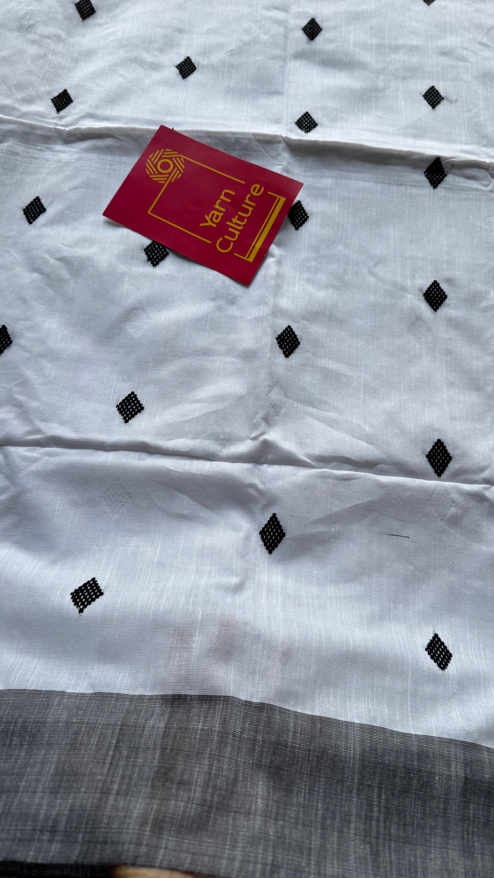 White with black, soft khadi cotton saree with pretty woven motifs. Soft, easy to drape, classy.