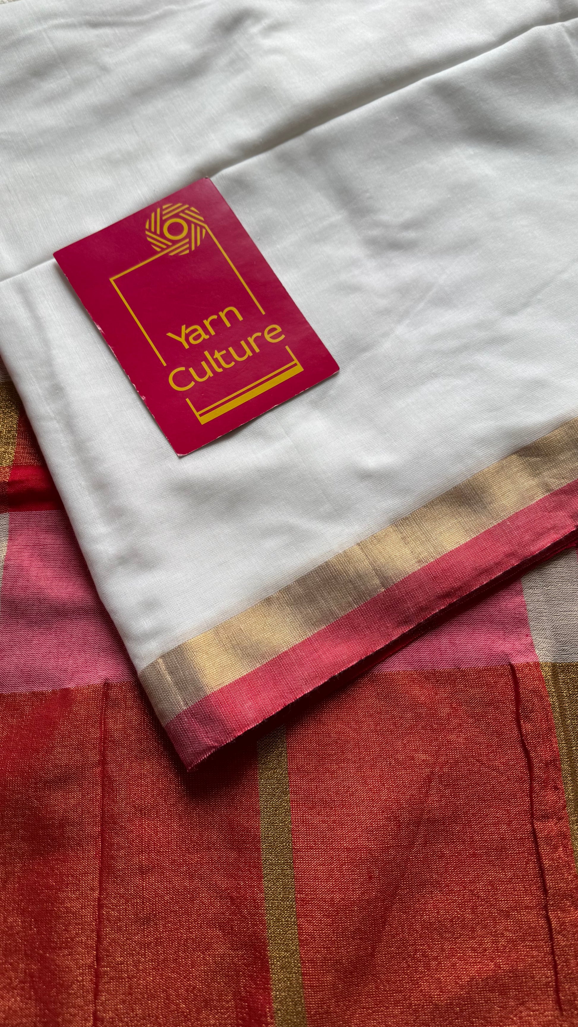 The next drape of Aagomoni (আগমনী) celebrates Pujo grandeur. A luminous white body, bordered with gold zari, with red along the edges.