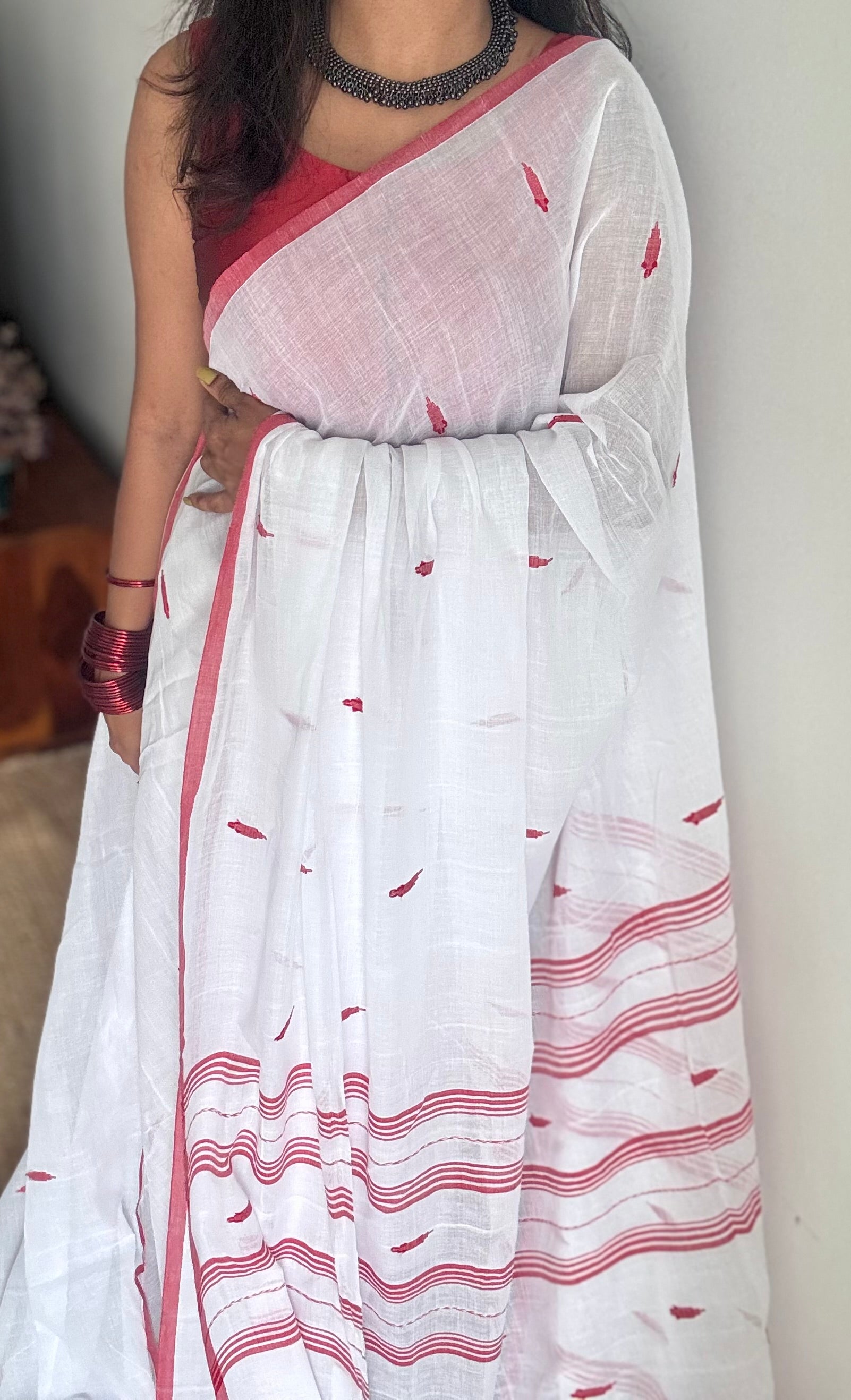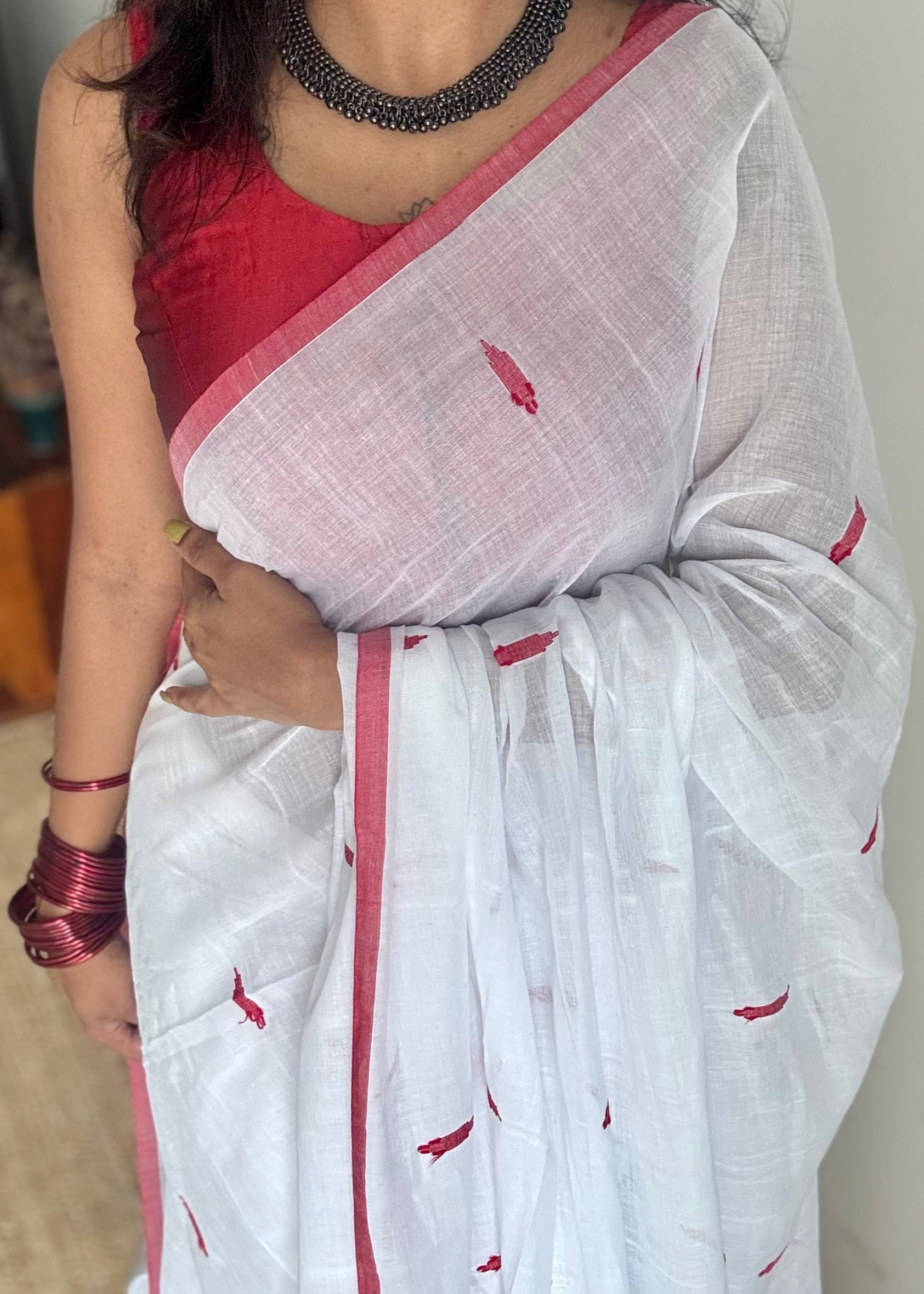 The next drape of Aagomoni (আগমনী) returns to the roots of Bengal’s weaving legacy, shada shari with laal paar, graced with jamdani motifs across the body.