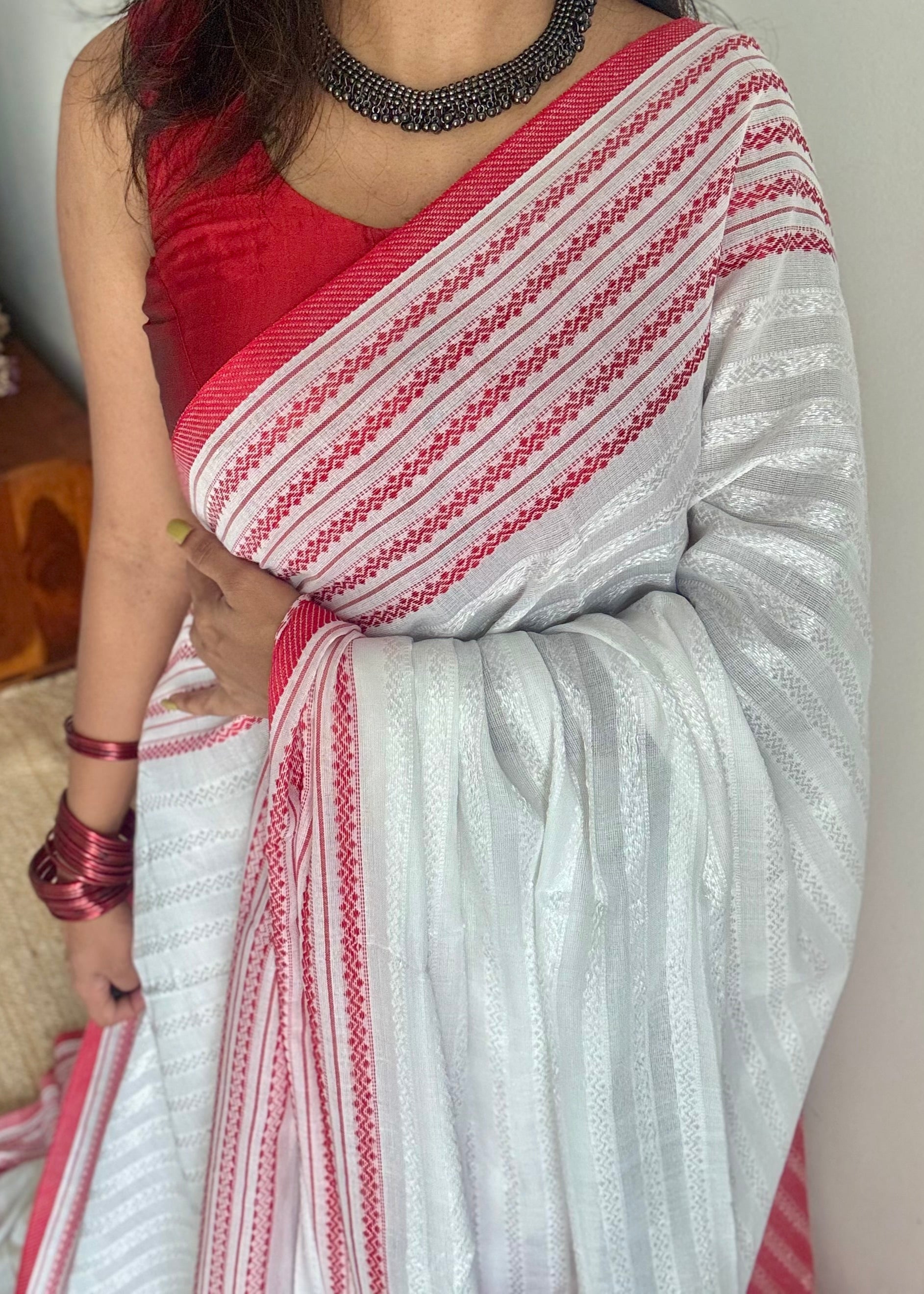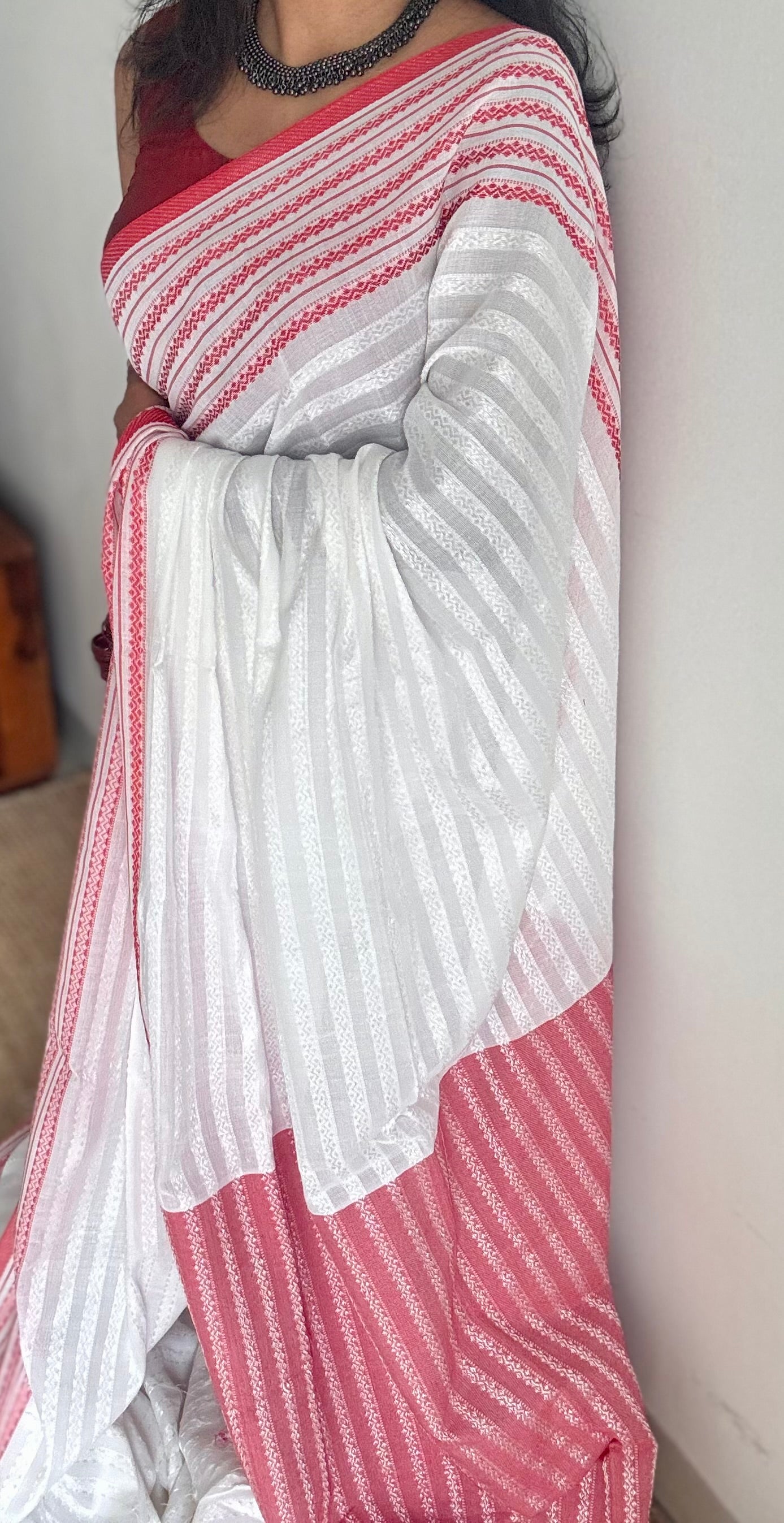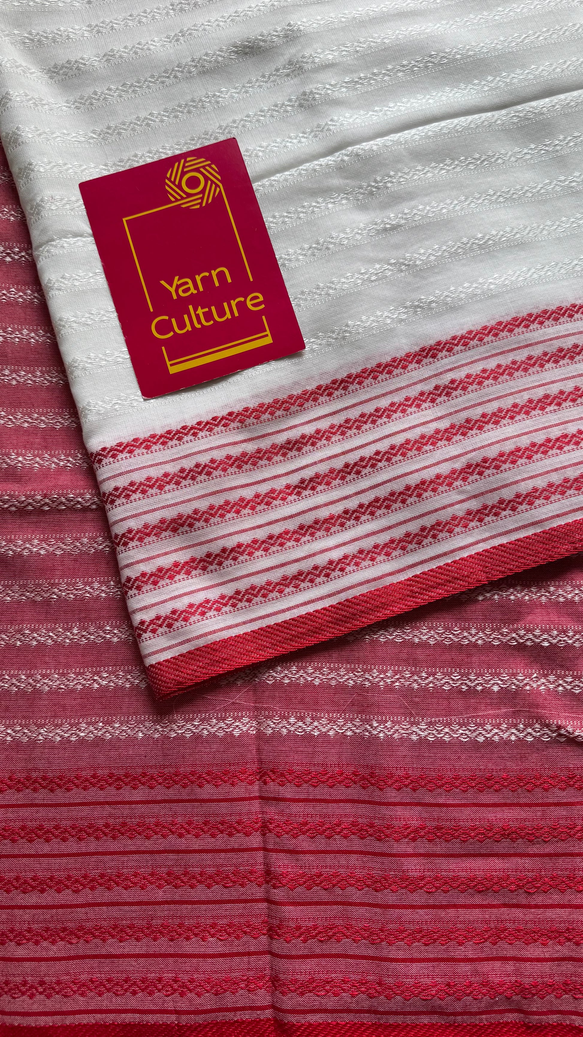 A soft white body with a delicate self-woven pattern, framed by a red and white thread-work bo rder. Soft, easy to drape, elegant.