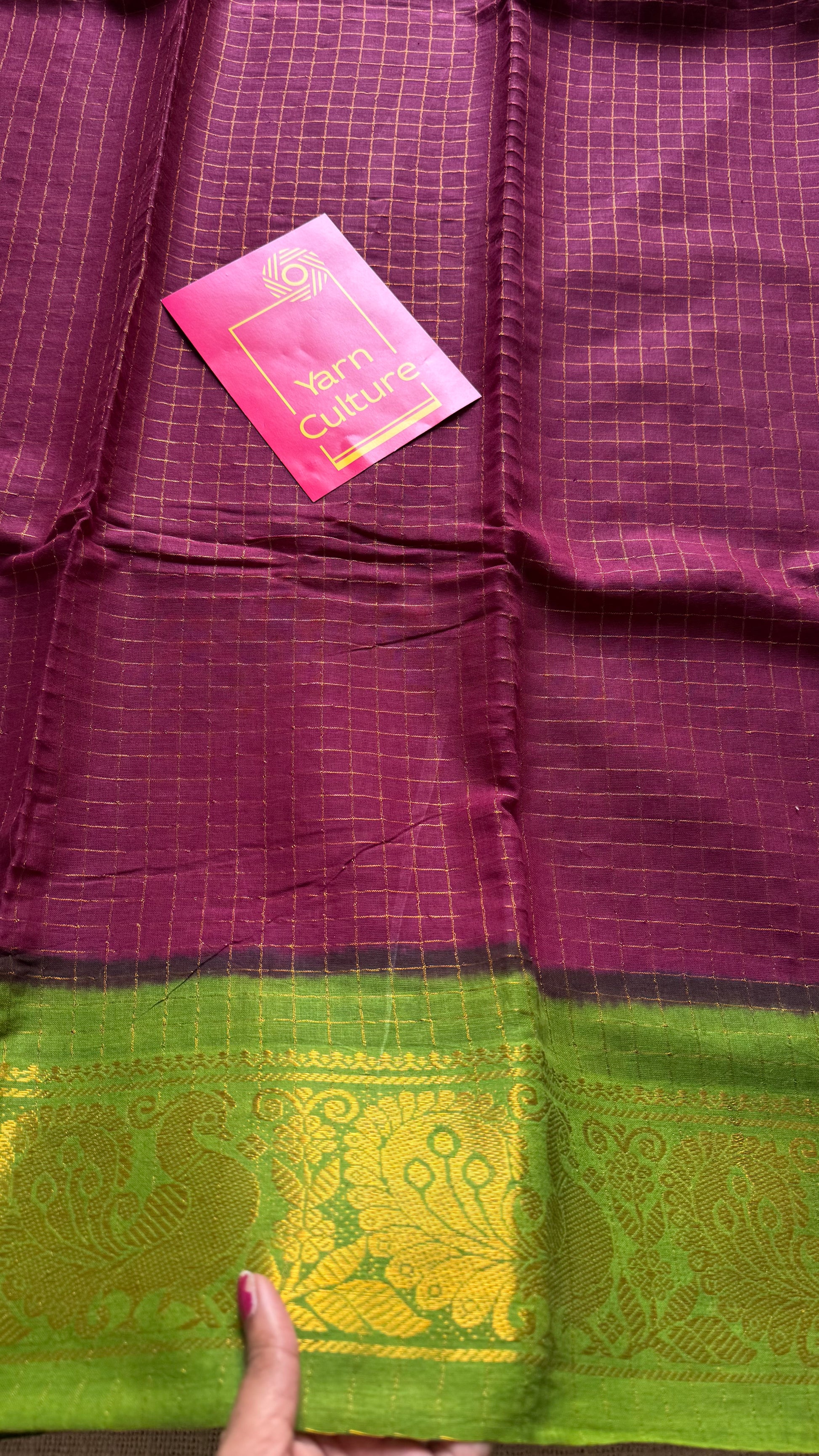 Wine with green checkered sungudi, kattuchayam dyed, soft madurai cotton, with contrast blouse.