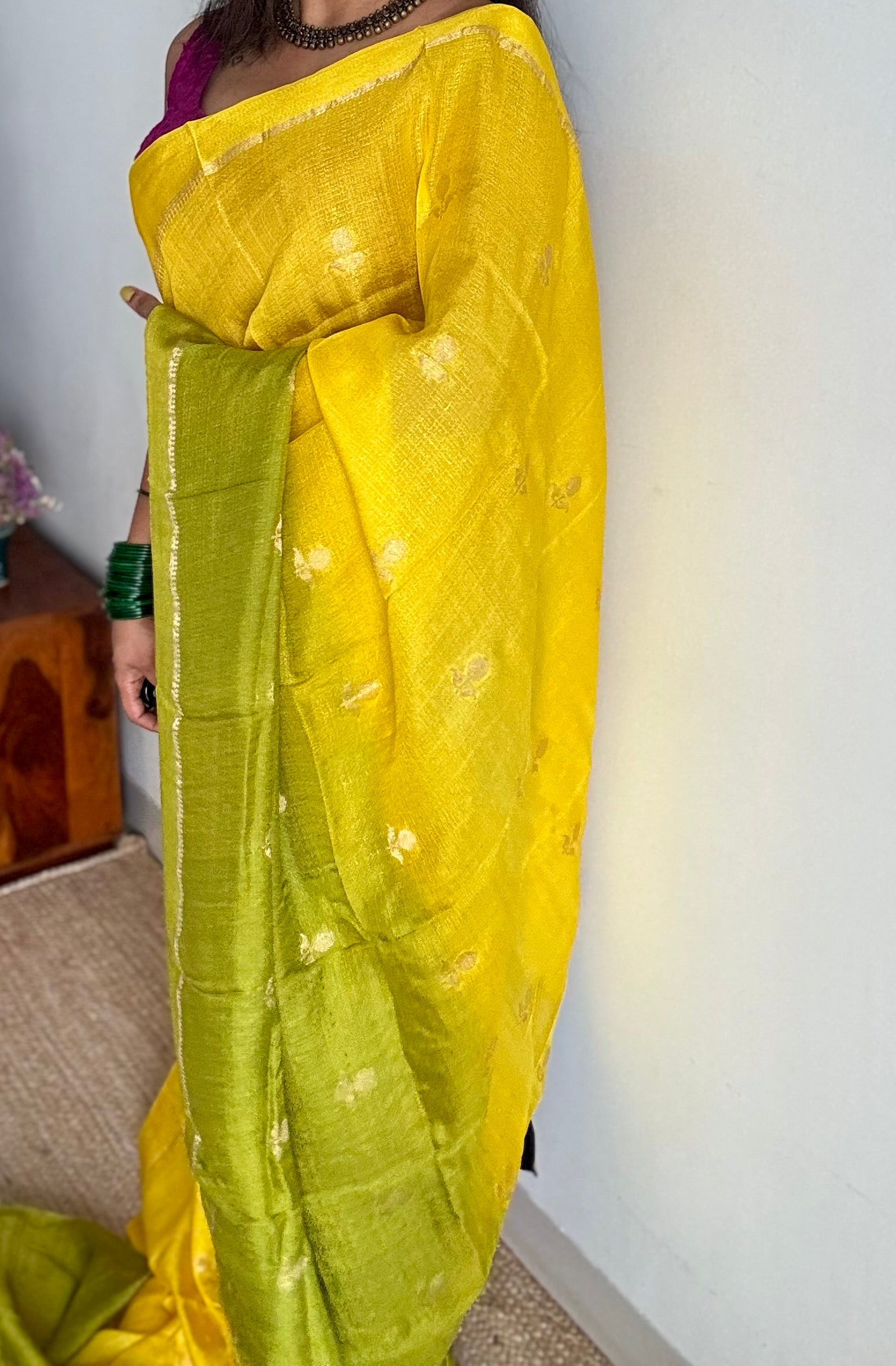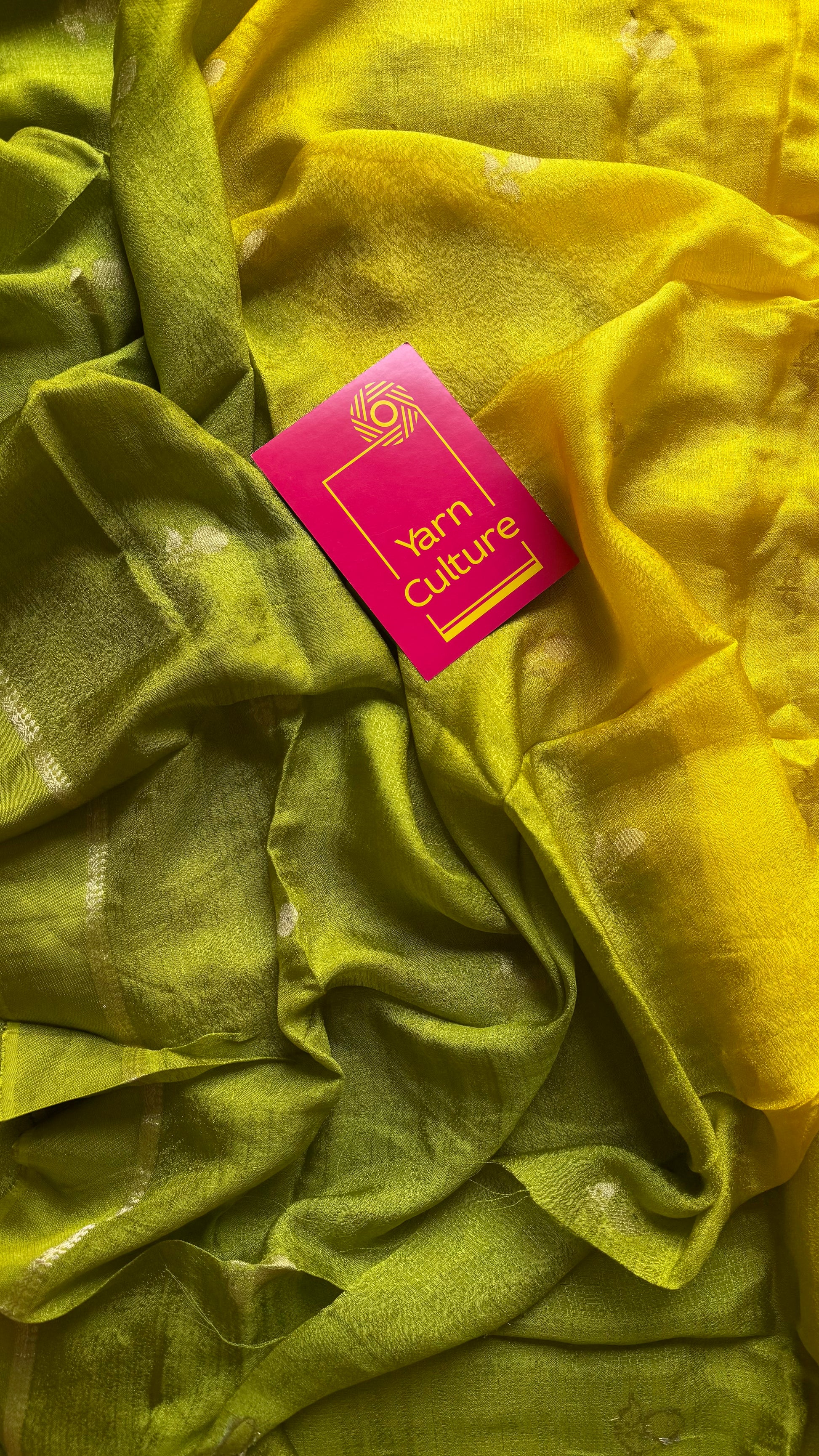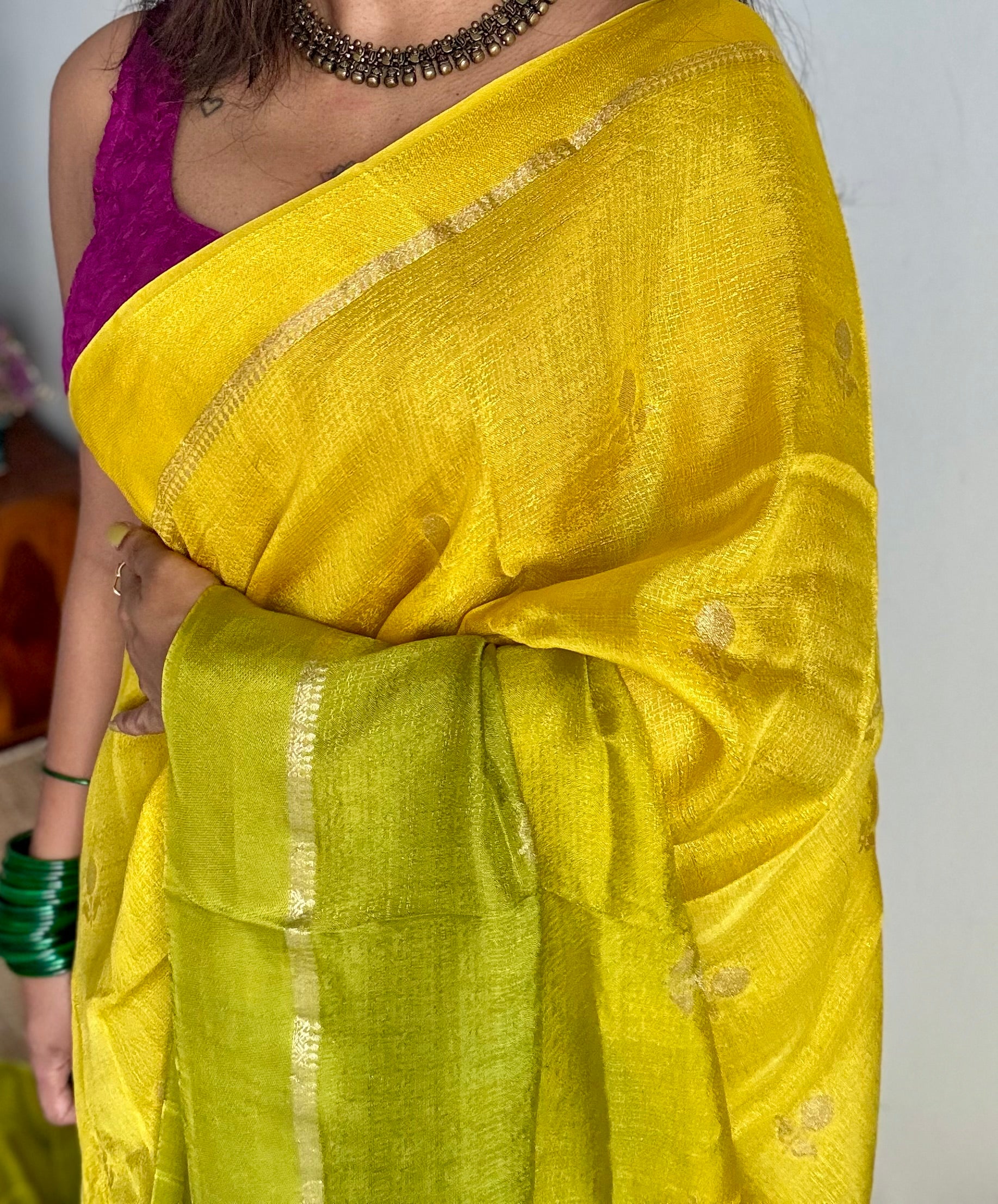 Yellow green dual tone in half-half pattern, in viscose soft silk with satin border, jacquard zari motifs in gold. Comes with a green blouse fabric of 0.8m.