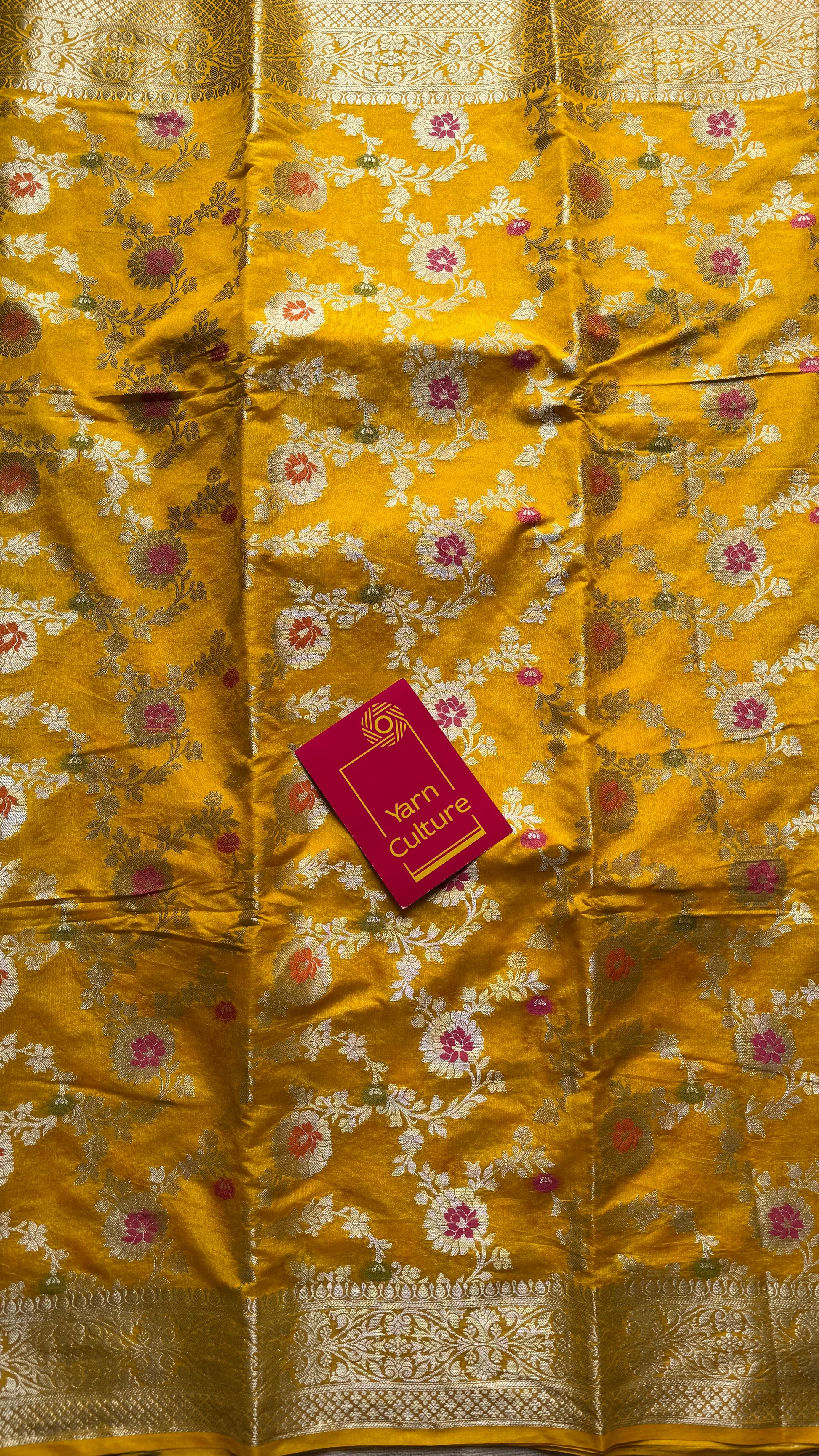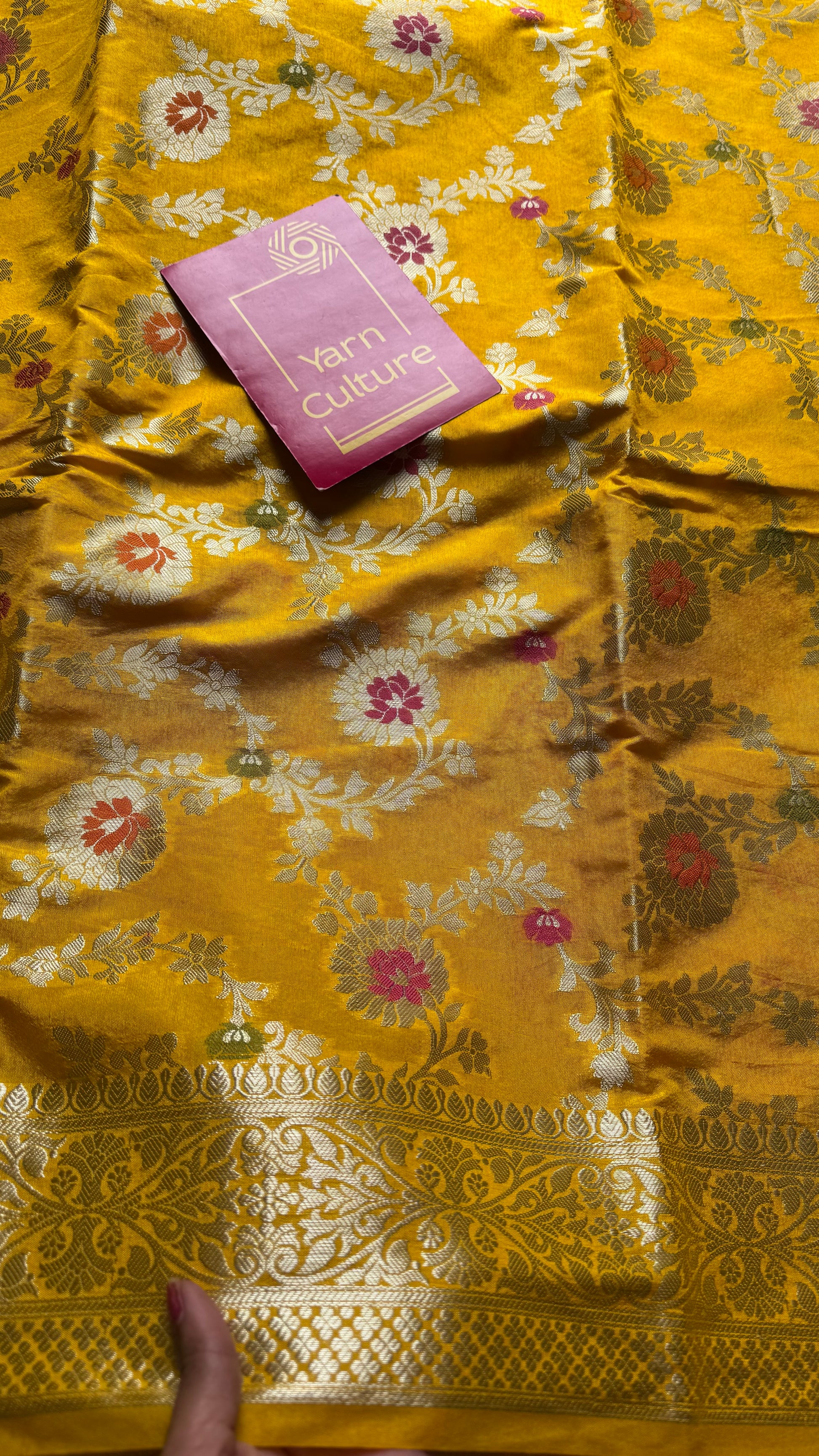 Yellow meenakari floral pattern in silver zari, Banarasi katan dupion silk - YCDESE11