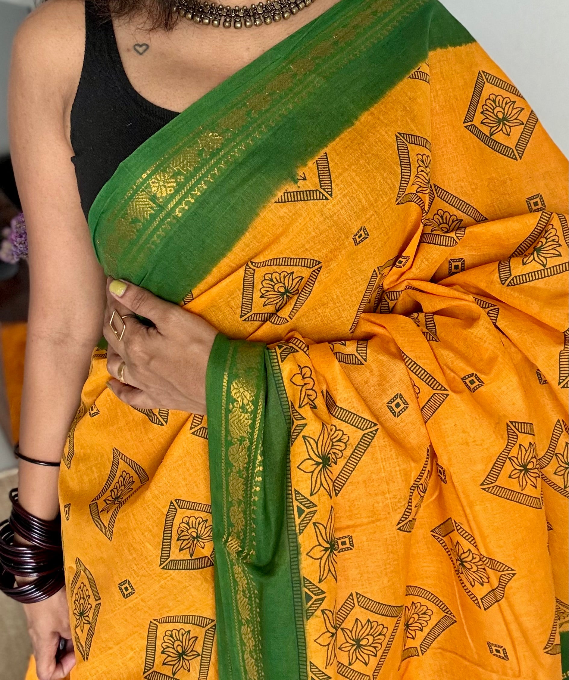 These sarees are dyed and dried in sunlight. Colour smudges are quite common in sungudi sarees.